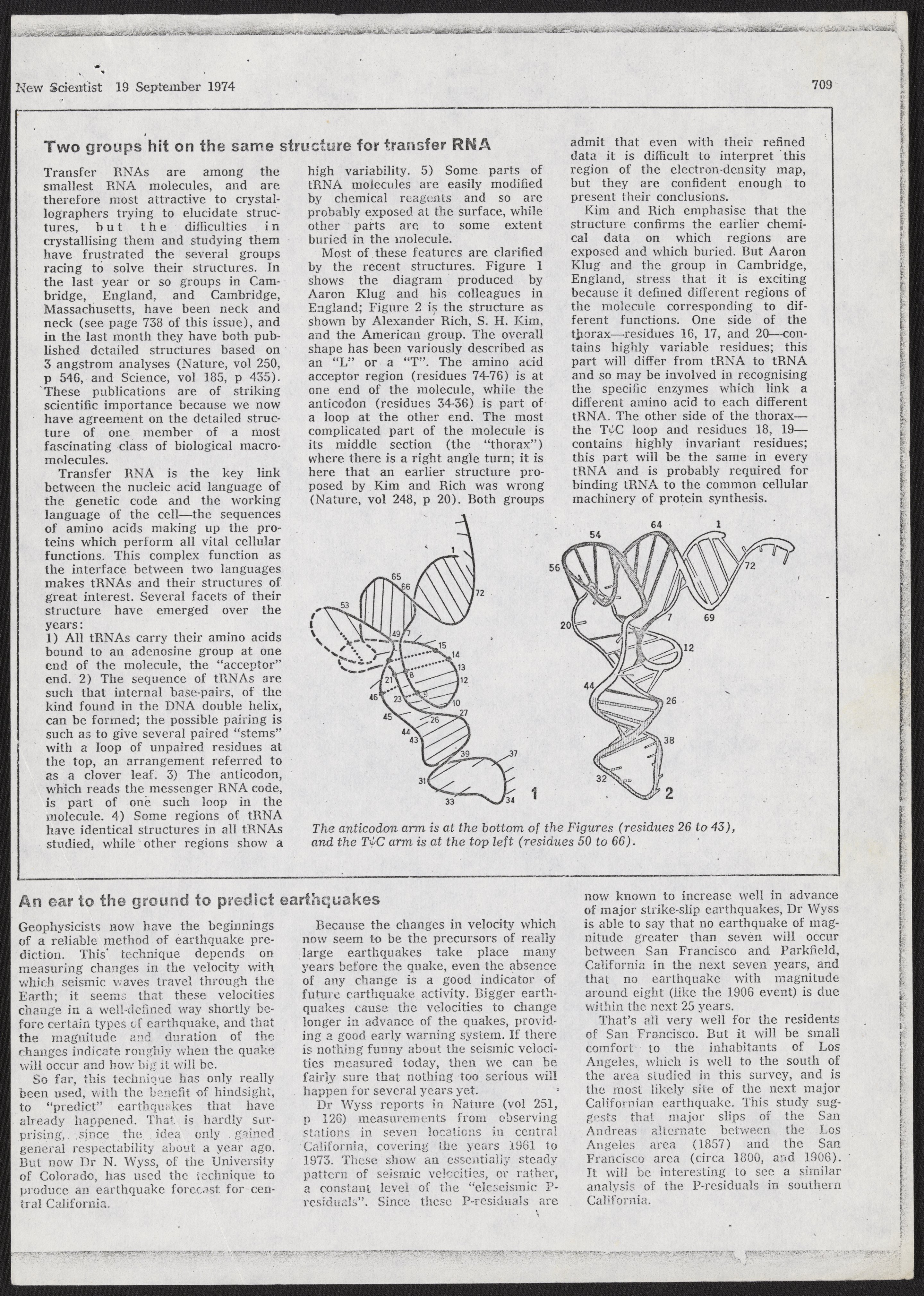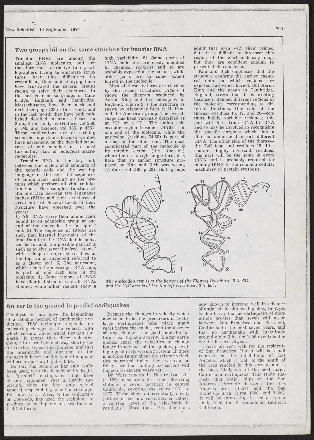 Letter from Francis Crick (1916-2004) to Jon D. Robertus. Crick includes an article titled Transfer RNA researchers argue about 'borrowed' data published in New Scientist, September 19, 1974.