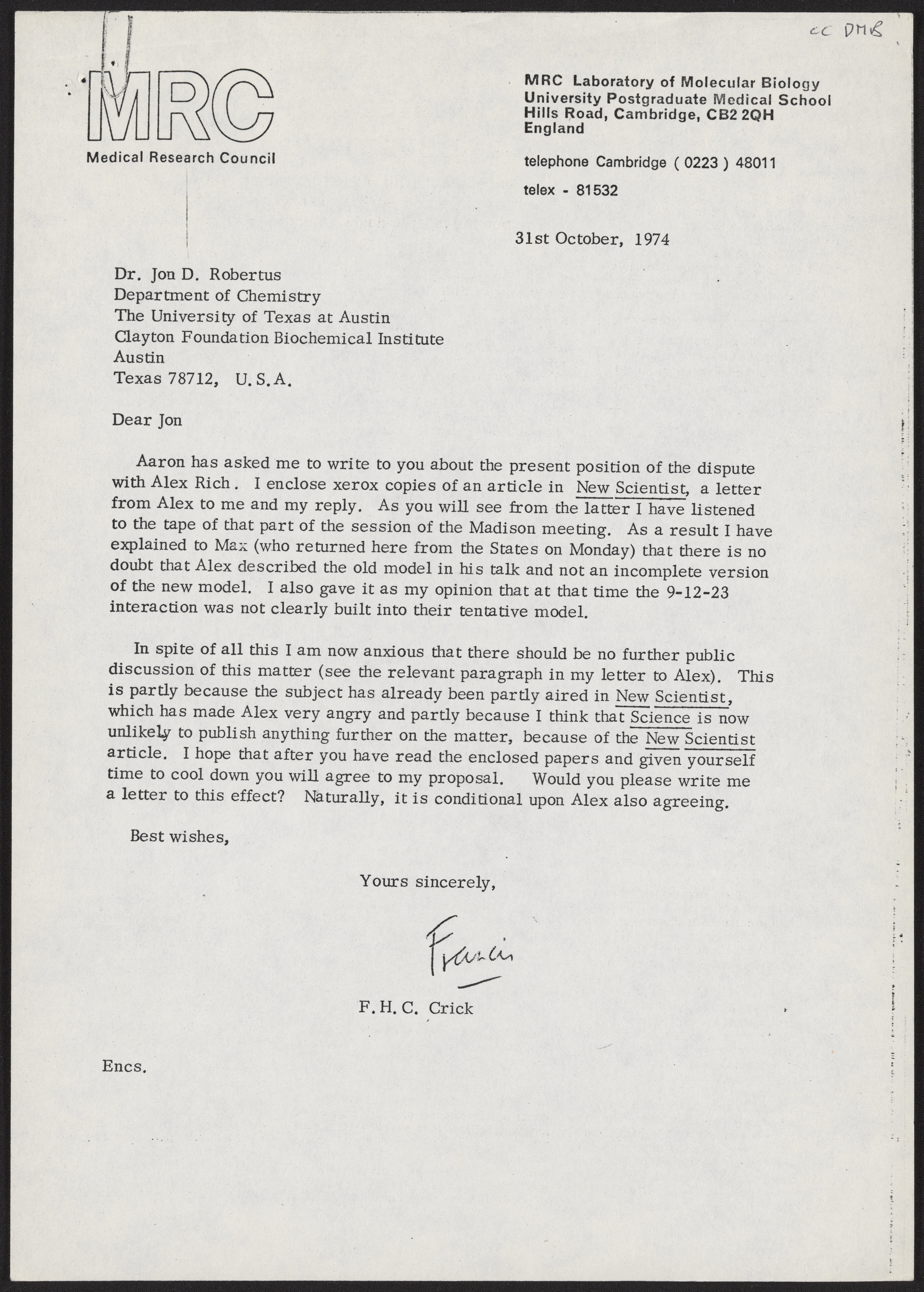 Crick, Francis. “Letter from Francis Crick to Jon D. Robertus, October 31, 1974,” 1974. History of Molecular Biology Collection, Box 19, Folder 23. Science History Institute. Philadelphia. https://digital.sciencehistory.org/works/s075xd7.