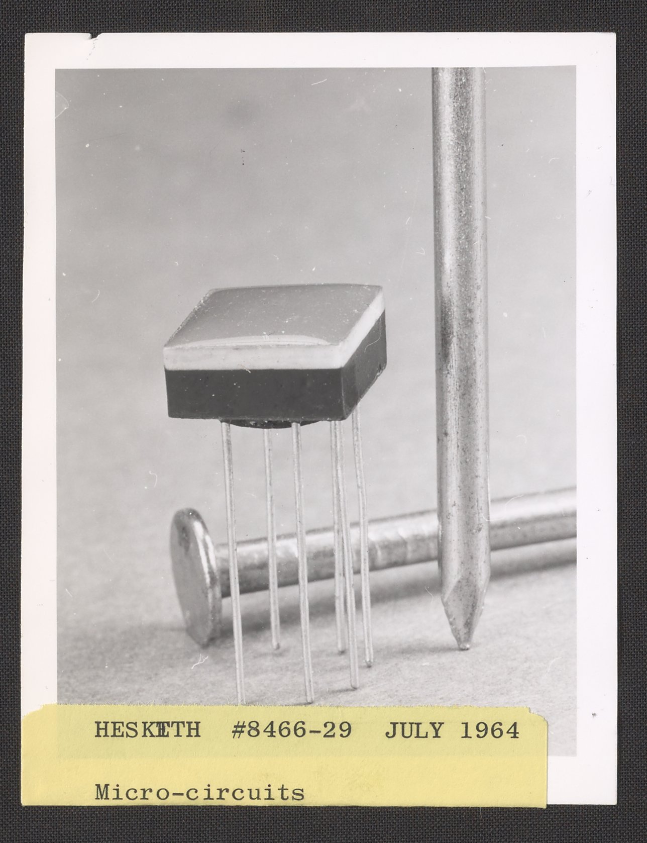 Hesketh, Dean D. “Helipot Custom Microcircuit with Nails,” July 1964. Beckman Historical Collection, Box 85. Science History Institute. Philadelphia. https://digital.sciencehistory.org/works/s1784m05g.