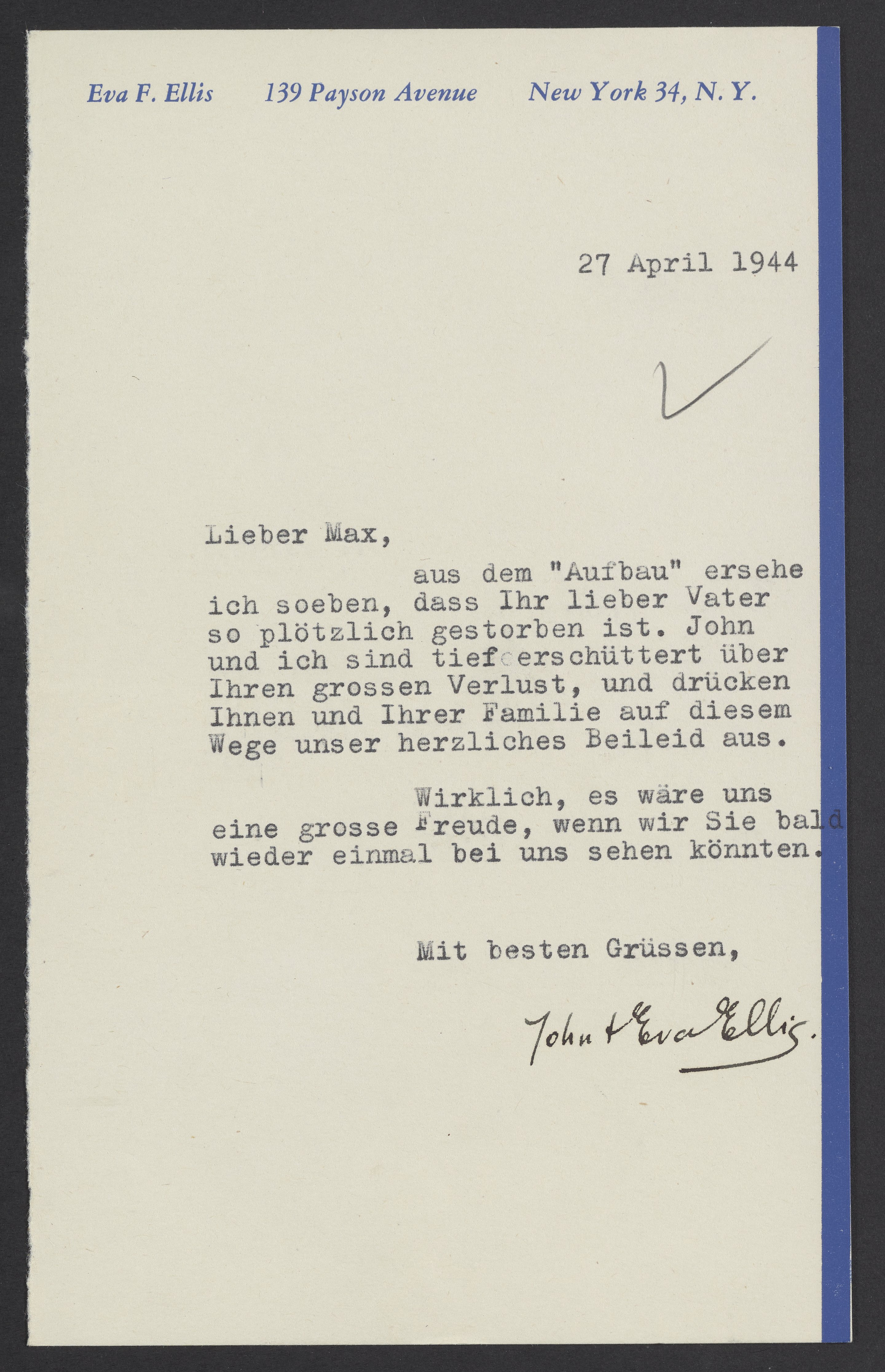Ellis, Eva F., and John Ellis. “Letter of Condolence from Eva and John Ellis to Max Bredig,” April 27, 1944. Papers of Georg and Max Bredig. Science History Institute. Philadelphia. https://digital.sciencehistory.org/works/s233h7n.