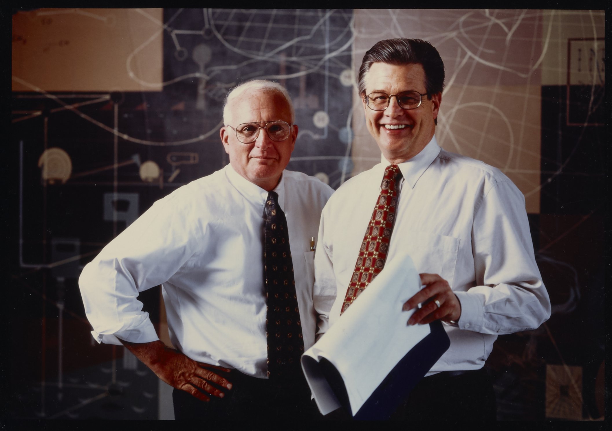 Unidentified men planning the Beckman Coulter Heritage Exhibit