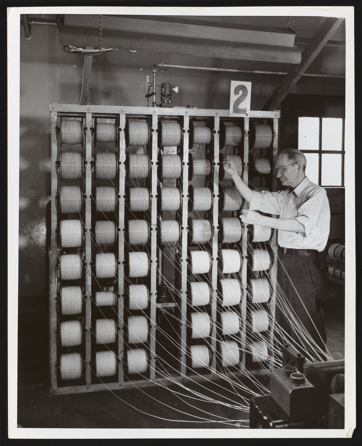 Hercules Incorporated. “Ed Reis Working with Wire-Cutting Spool Rack at Hercules Port Ewen Plant,” 1954. Photographs from the Records & Ephemera of Hercules Incorporated, Box 2, Folder 37. Science History Institute. Philadelphia. https://digital.sciencehistory.org/works/s4655h124.