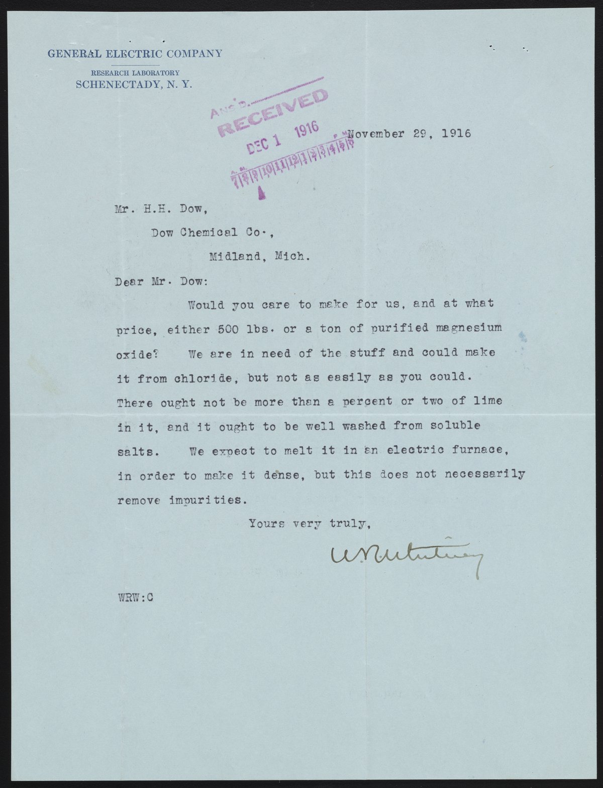 Whitney, Willis Rodney. “Letter from Dr. Willis R. Whitney to Herbert H. Dow, November 29, 1916,” November 29, 1916. Papers of Herbert H. Dow, Box 54, Folder 160062. Science History Institute. Philadelphia. https://digital.sciencehistory.org/works/s4655h566.