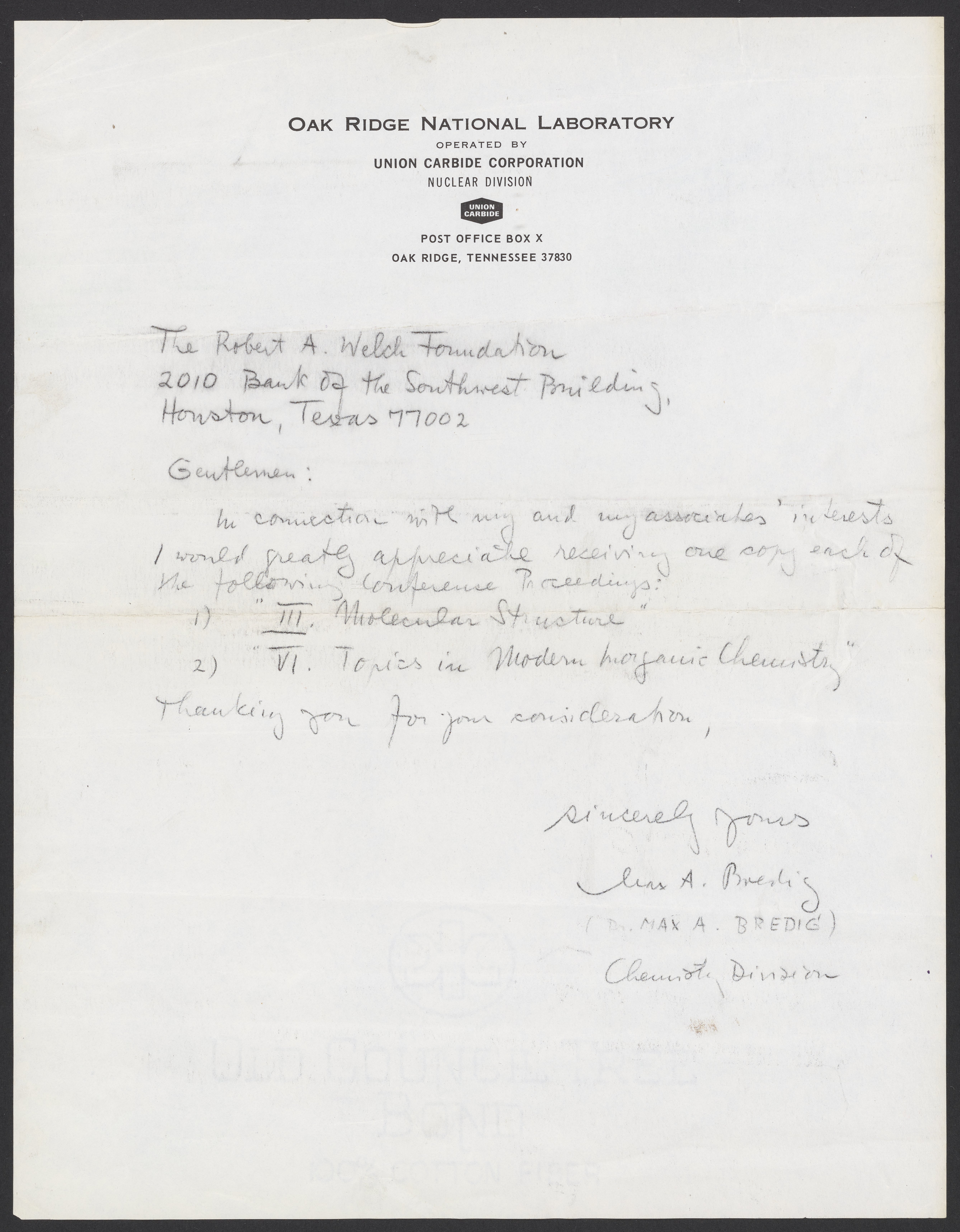 Max Bredig (1902-1977) writes to the Robert A. Welch Foundation, a private funding source for chemical research, to request copies of two conference proceedings.