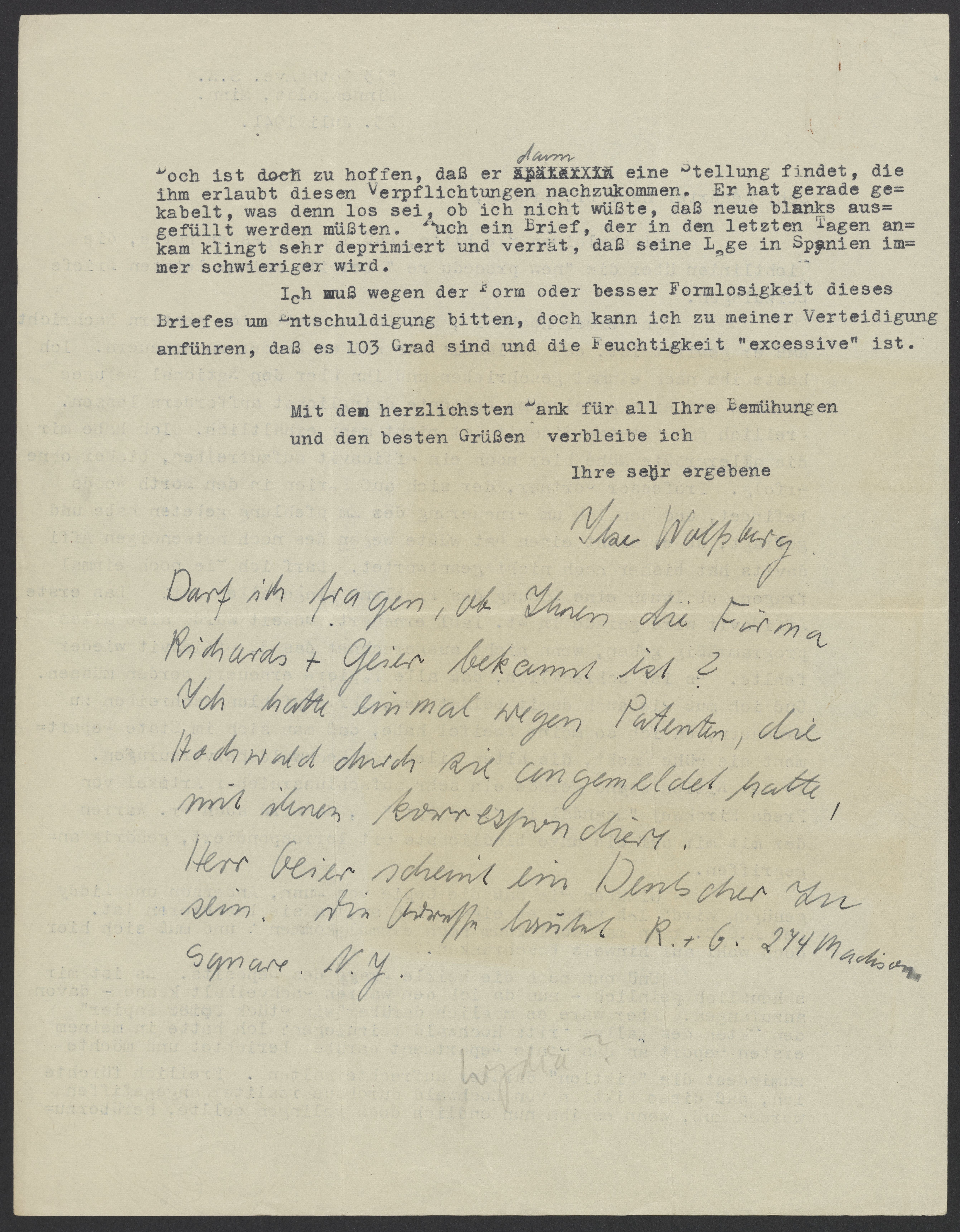 Darf ich fragen, ob Ihnen die Firma Richards + Geier bekannt ist? Ich hatte einmal wegen Patenten, die Hochwald durch sie angemeldet hatte, mit ihnen korrespondiert. Herr Geier scheint ein Deutscher zu sein. Die Adresse lautet R. + G. 214 Madison Square. N.Y.