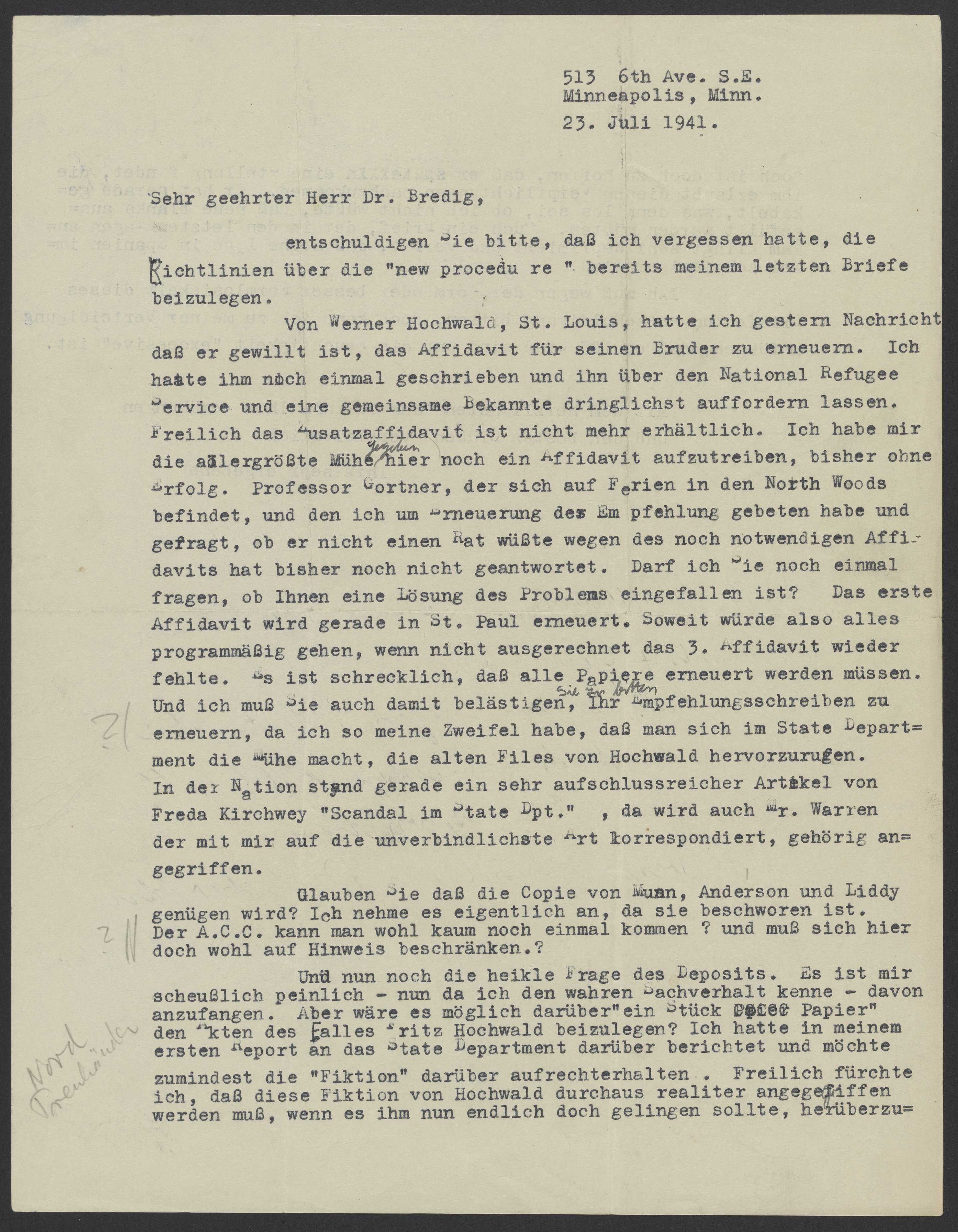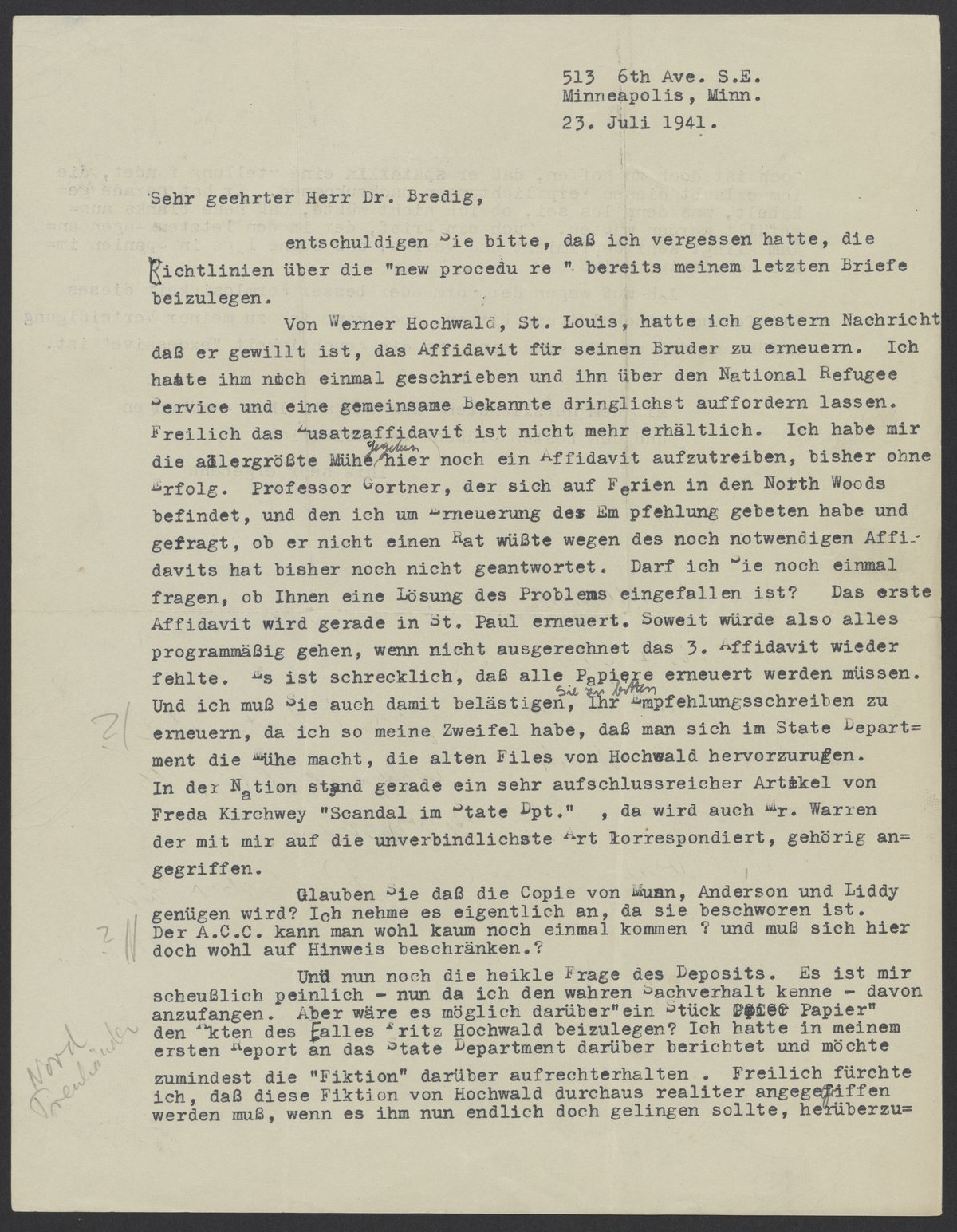 Yesterday, I received news from Werner Hochwald in St. Louis that he is willing to renew the affidavit for his brother. I wrote to him again and urged him to contact the National Refugee Service and a mutual acquaintance. Of course, the additional affidavit is no longer available. I have unsuccessfully tried very hard to find an affidavit here. I have requested that Professor Gortner, who is on vacation in the North Woods, renew his recommendation letter and asked whether he would have any advice regarding the required affidavit. He has not yet responded. May I ask you again if you have come up with a solution to the problem? The first affidavit is currently being renewed in St. Paul. So far, everything would be going according to plan, if, of all the things, the third affidavit was not missing again. It is awful that all the documents must be renewed. Moreover, I must inconvenience you by asking you to renew your letter of recommendation. I doubt that the State Department is attempting to find Hochwald’s old files. A very informative article by Freda Kirchwey “Scandal in the State Department” just appeared in Nation, in which Mr. Warren, who corresponds with me without obligation, is endlessly criticized.