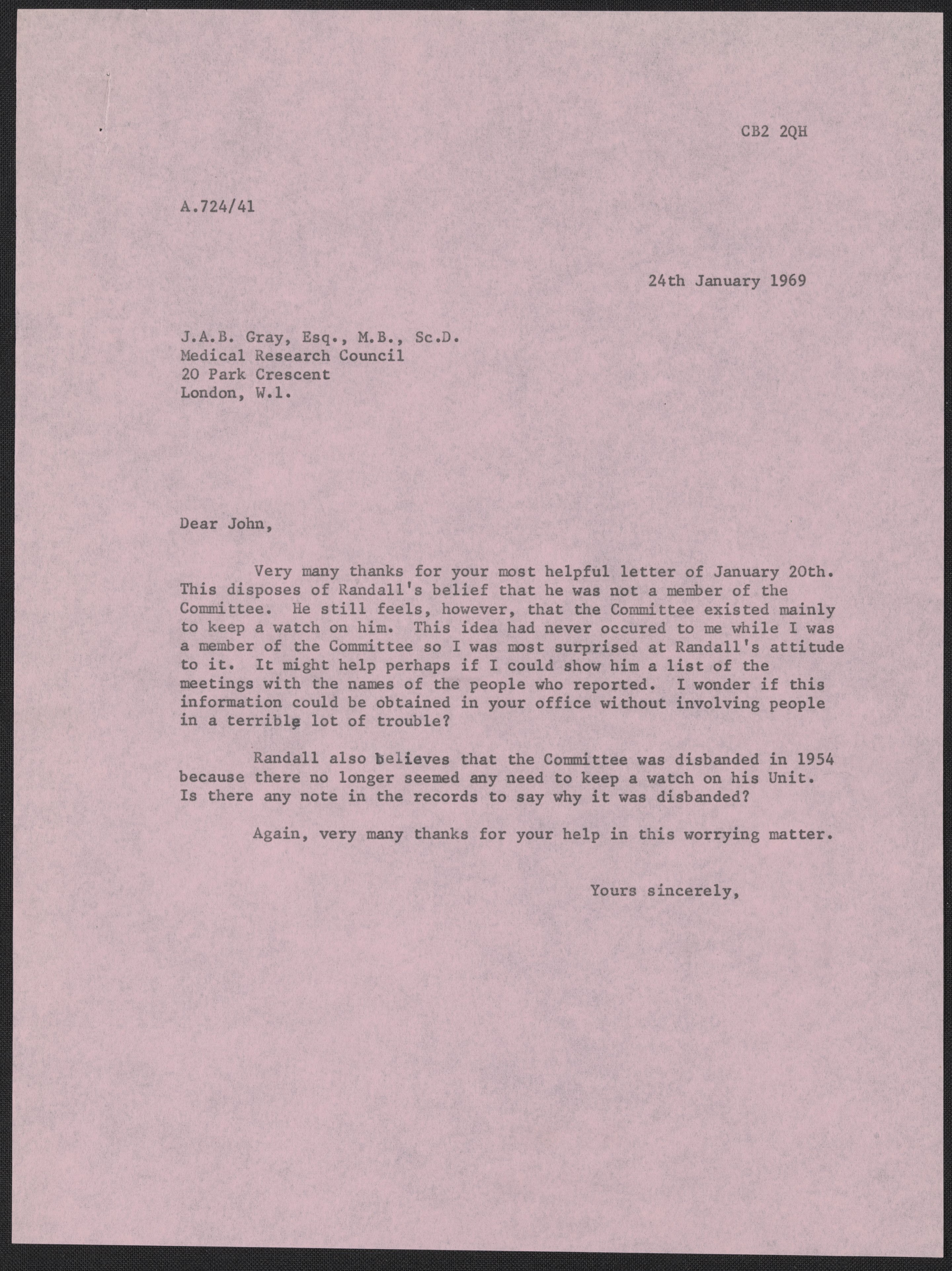 Letter from Max Perutz to J.A.B. Gray, January 24, 1969