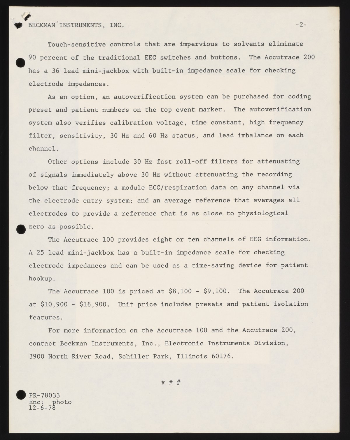 Small JPG1200 x 1506px — 215 KBFull-sized JPG2787 x 3498px — 778 KBOriginal fileTIFF — 2787 x 3498px — 28.0 MBThe press release discusses the Accutrace 100 and Accutrace 200 Electroencephalographs, including specifications, options, and pricing.