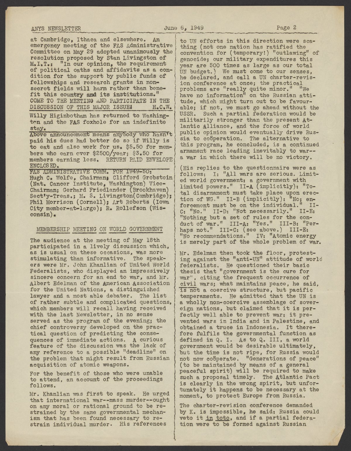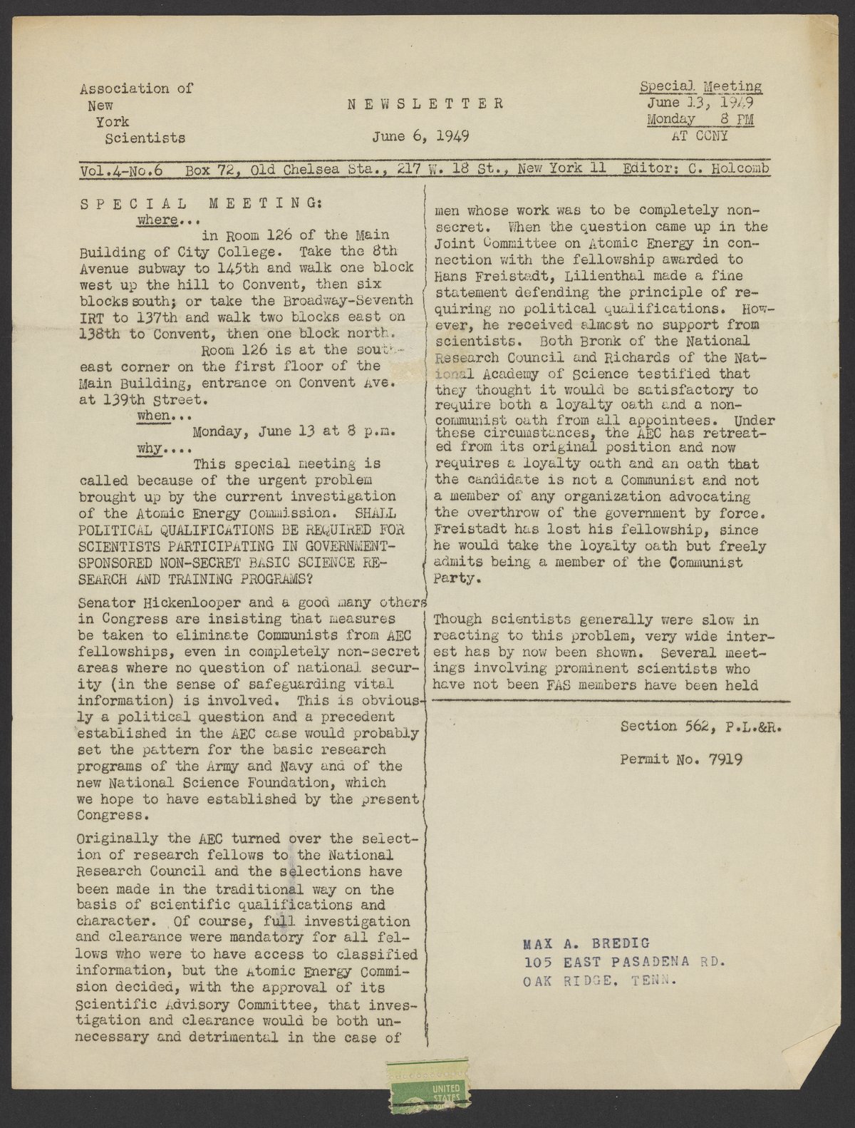 Association of New York Scientists. “Association of New York Scientists Newsletter, June 6, 1949,” June 6, 1949. Papers of Georg and Max Bredig, Box 10, Folder 3. Science History Institute. Philadelphia. https://digital.sciencehistory.org/works/s7e16mw.