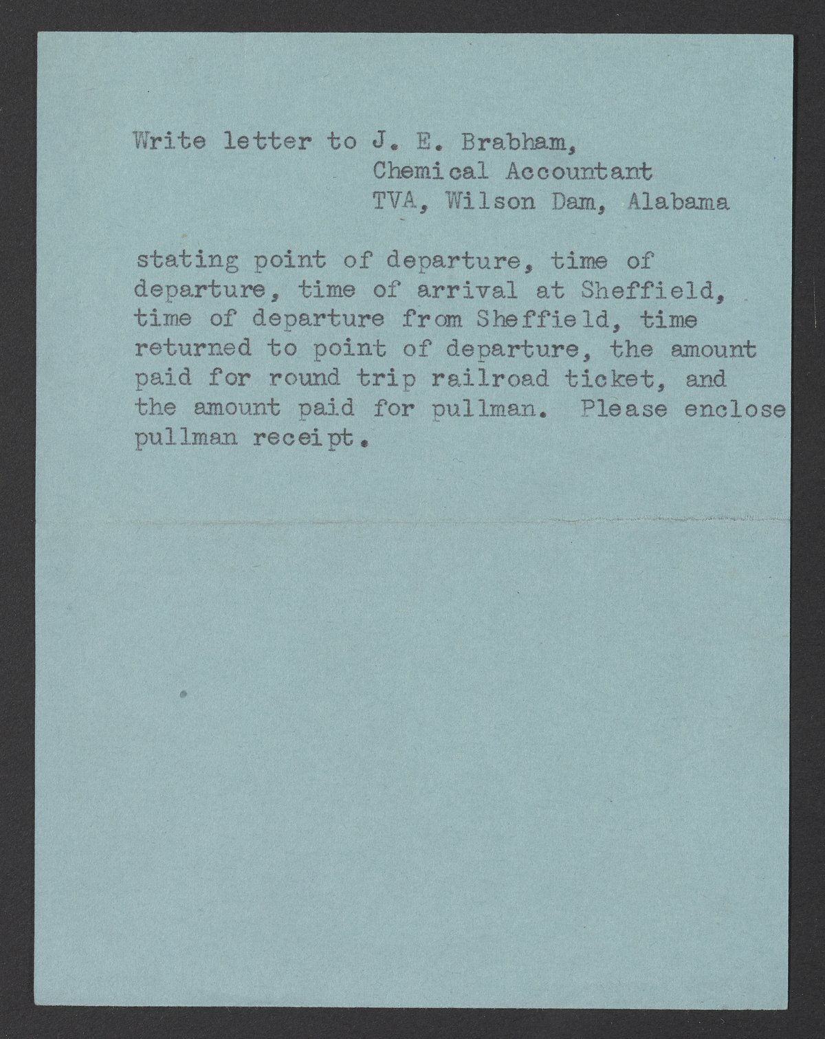 Small JPG1200 x 1511px — 273 KBFull-sized JPG2818 x 3549px — 1.7 MBOriginal fileTIFF — 2818 x 3549px — 28.7 MBMemo, presumably from Max Albert Bredig (1902-1977), about writing a letter to J.E. Brabham from the Tennessee Valley Authority. The memo indicates that the letter should include Bredig's travel information and a receipt.