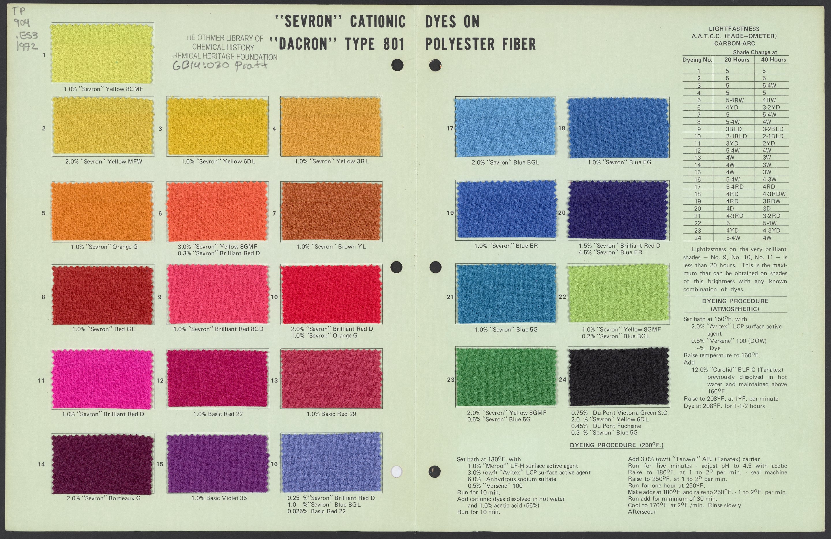 E.I. du Pont de Nemours & Company. Organic Chemicals Department. "Sevron" Cationic Dyes on "Dacron" Type 801 Polyester Fiber. Wilmington, Delaware: E.I. du Pont de Nemours & Company, 1972. https://digital.sciencehistory.org/works/s8fi8zt.