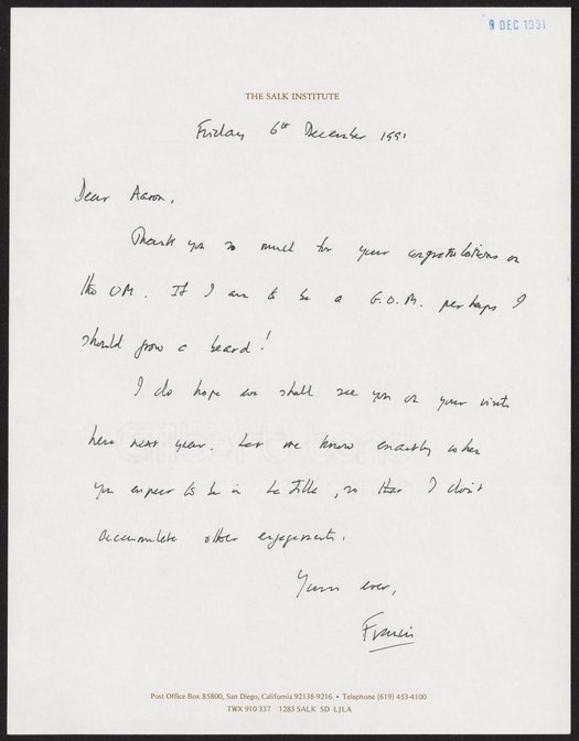 Crick, Francis. “Letter from Francis Crick to Aaron Klug, December 6, 1991,” December 6, 1991. History of Molecular Biology Collection, Box 20, Folder 5. Science History Institute. Philadelphia. https://digital.sciencehistory.org/works/s8txxb2.