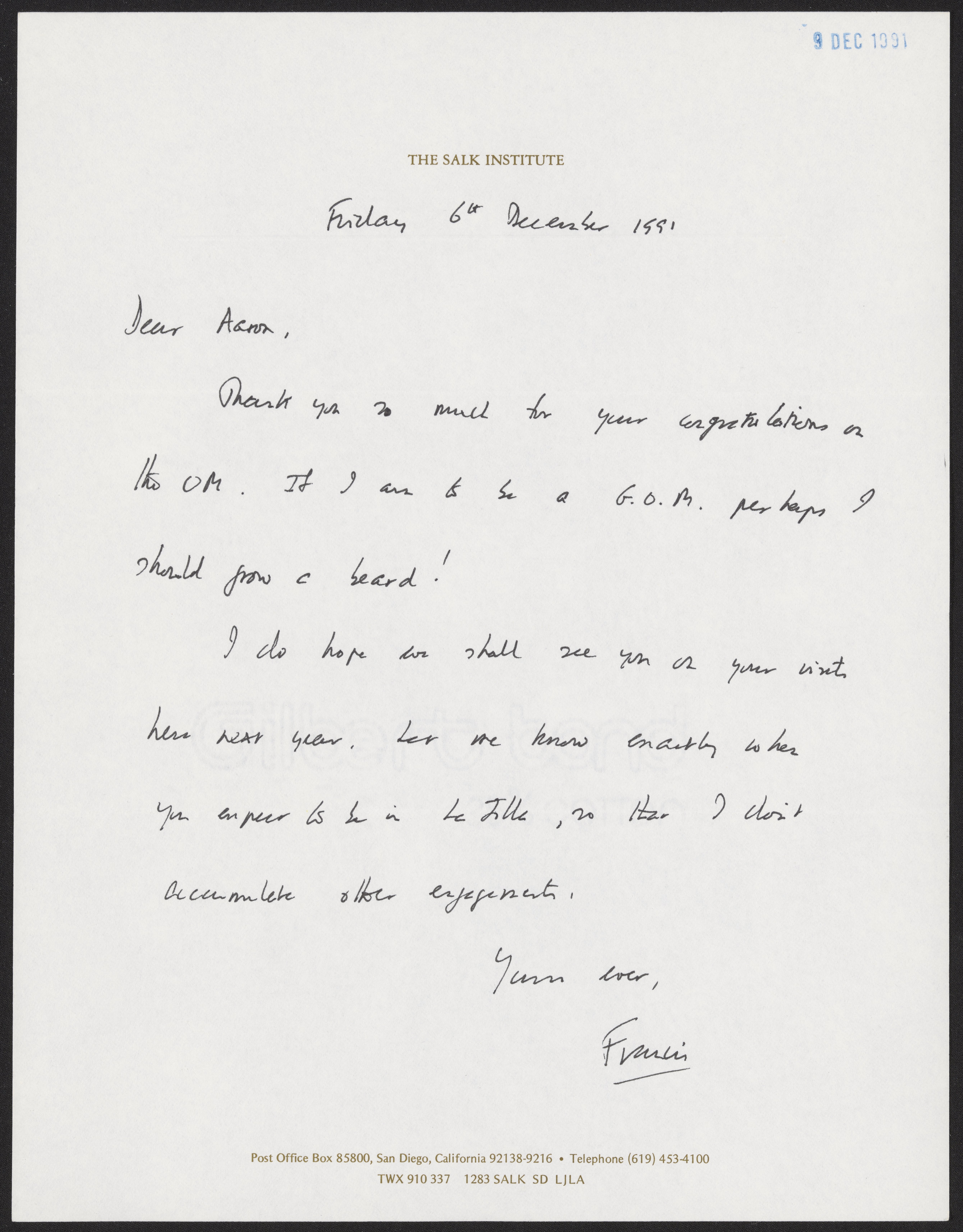 Letter from Francis Crick to Aaron Klug, December 6, 1991