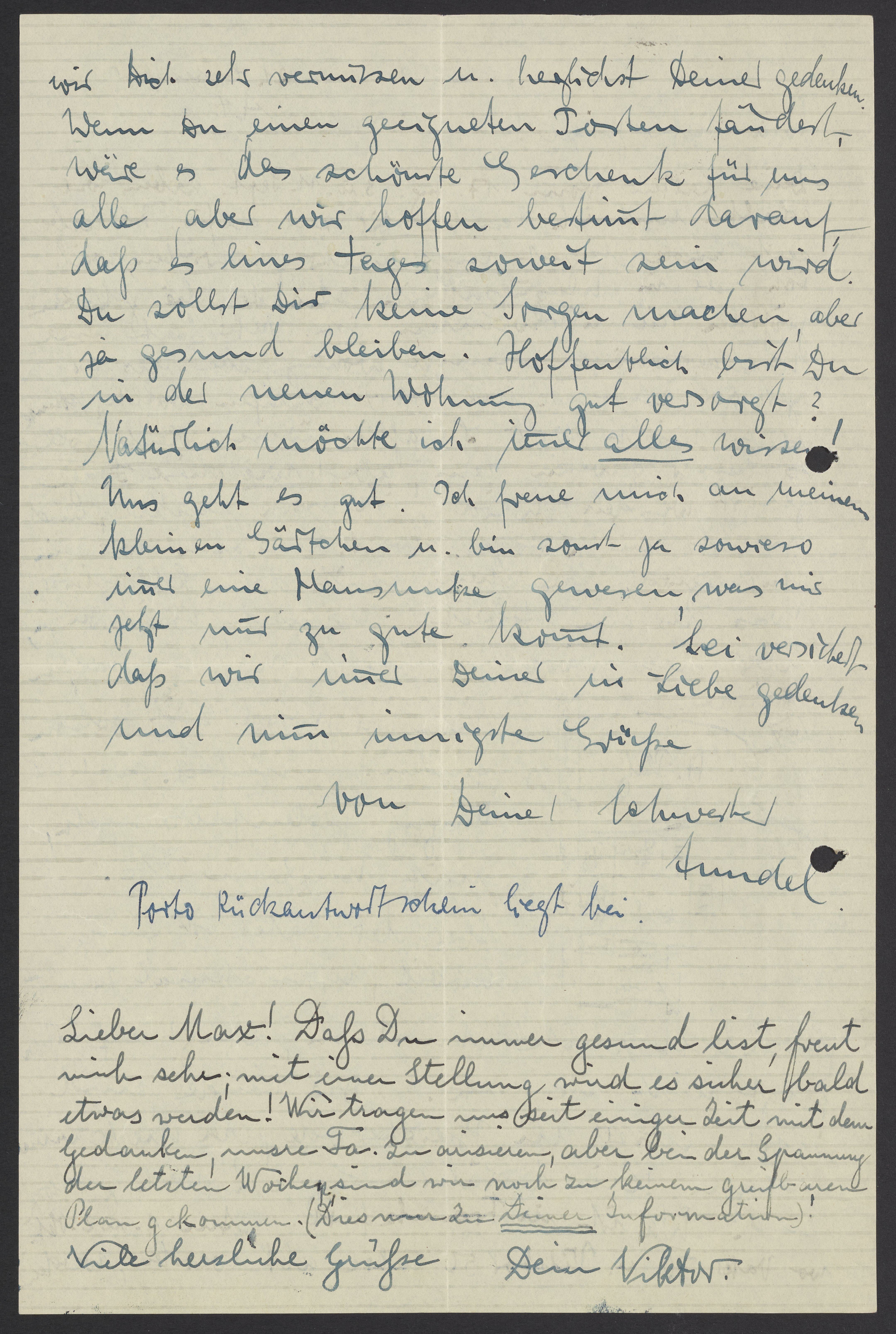 Lieber Max! Daß Du immer gesund bist, freut mich sehr; mit einer Stellung wird es sicher bald etwas werden! Wir tragen uns seit einiger Zeit mit dem Gedanken, unsere Pa. zu arisieren, aber bei der Spannung der letzten Wochen sind wir noch zu keinem greifbaren Plan gekommen (Dies nur zu Deiner Information)!