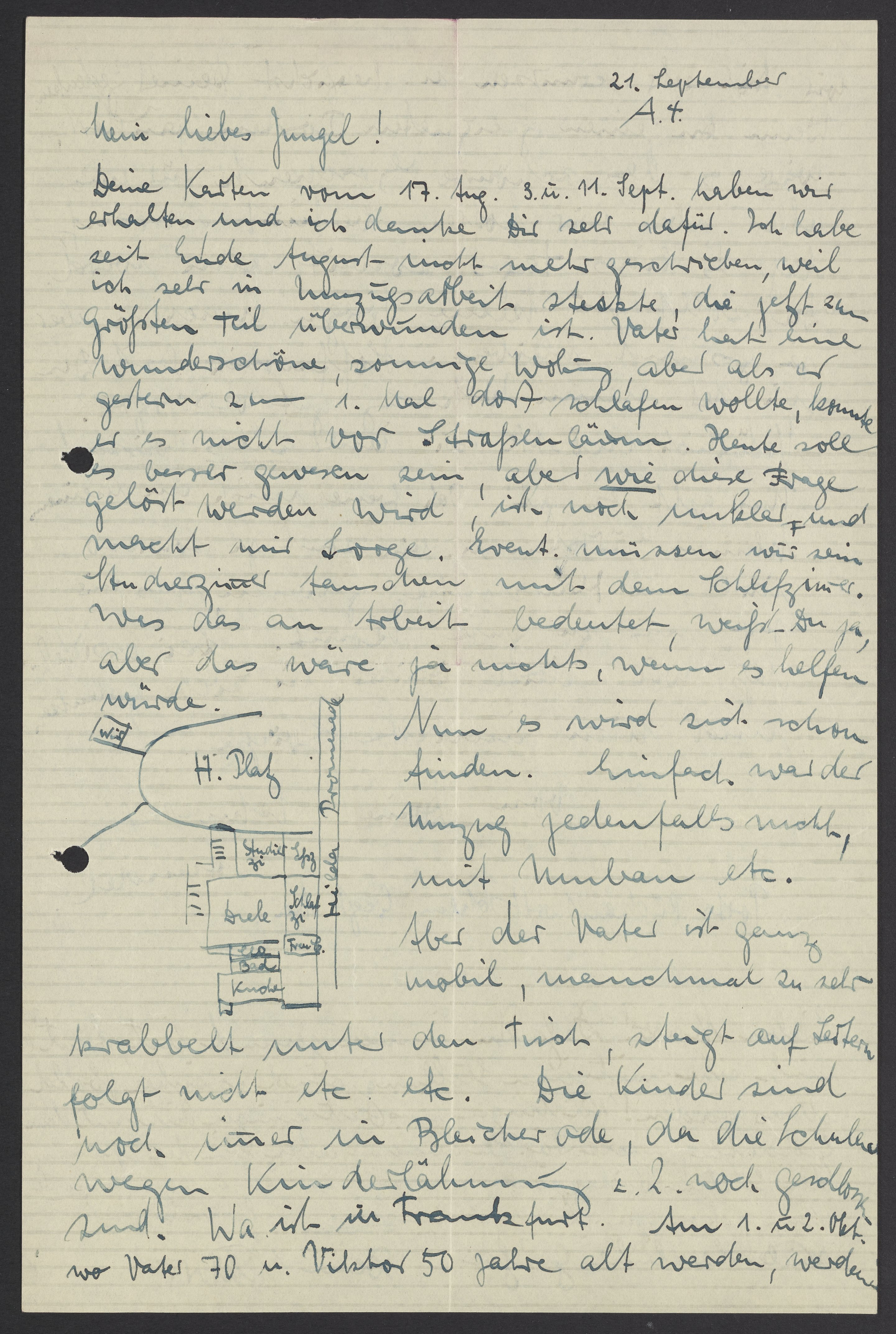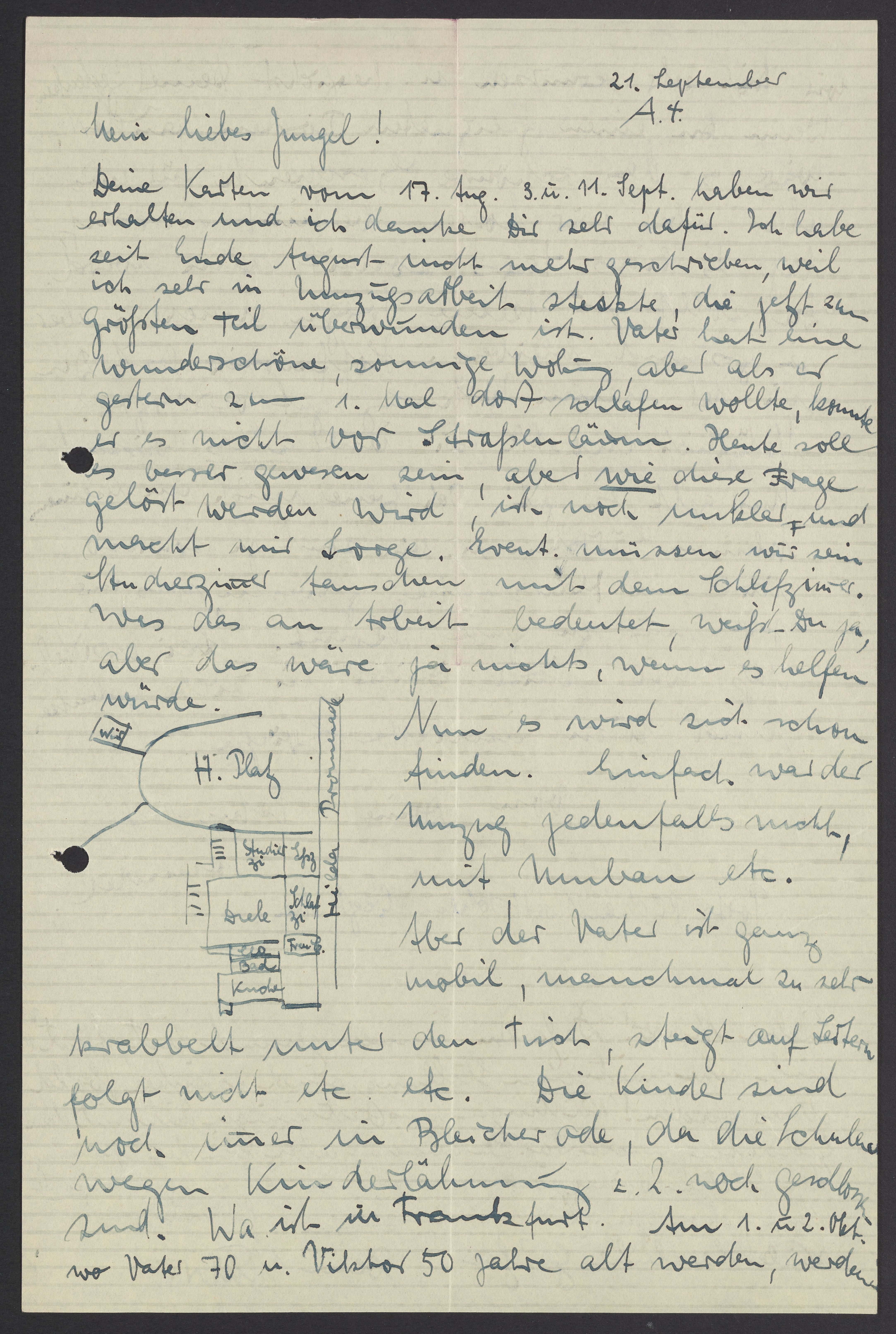 Deine Karte vom 17. Aug. u. 11. Sept. haben wir erhalten und ich danke Dir sehr dafür. Ich habe seit Ende August nicht mehr geschrieben, weil ich sehr in Umzugsarbeiten steckte, die jetzt zum größten Teil überwunden ist. Vater hat eine wunderschöne, sonnige Wohnung, aber als er gestern zum 1. Mal dort schlafen wollte, konnte er es nicht vor Straßenlärm. Heute soll es besser gewesen sein, aber wie diese Frage gelöst werden wird, ist noch unklar und macht mir Sorge. Event. müssen wir sein Studienzimmer tauschen mit dem Schlafzimmer. Was das an Arbeit macht, weißt Du ja, aber das wäre ja nichts, wenn es helfen würde.