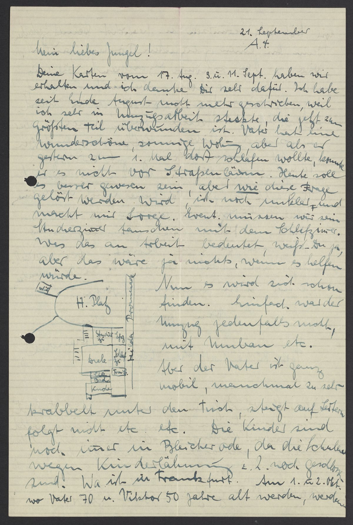 Nun es wird sich schon finden. Einfach war der Umzug nicht, mit Umbau etc. Aber der Vater ist ganz mobil, manchmal zu sehr krabbelt unter den Tisch, steigt auf Leitern, folgt nicht etc etc. Die Kinder sind immer in Bleicherode, da die Schulen wegen Kinderlähmung z.Z noch geschlossen sind. Wa. ist in Frankfurt. Am 1. u. 2. Okt., wo Vater 70 u. Viktor 50 Jahre alt werden, werden