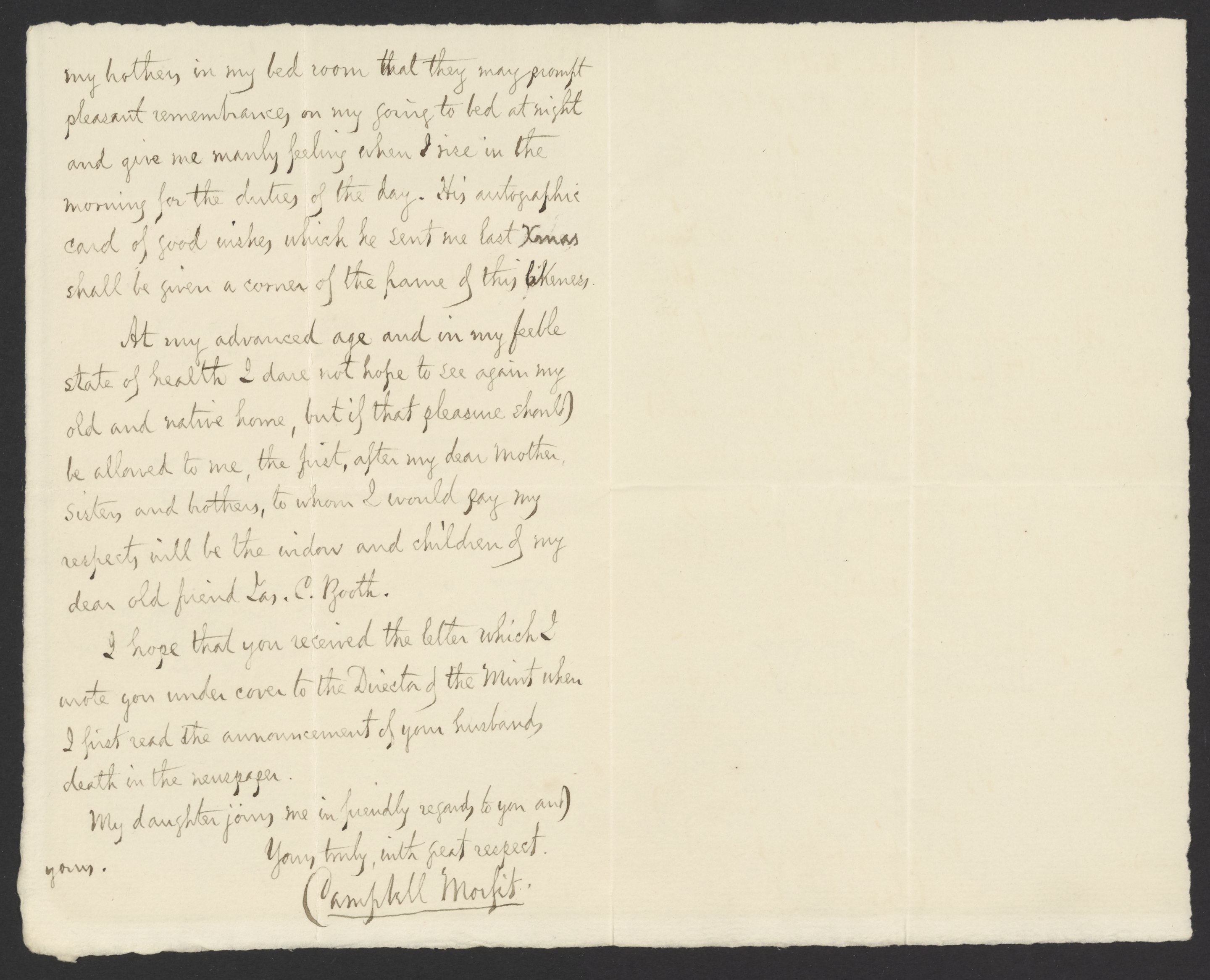 Small JPG1200 x 1849px — 249 KBFull-sized JPG1972 x 3038px — 543 KBOriginal fileTIFF — 1972 x 3038px — 17.2 MBCampbell Morfit (1820-1897), a distinguished chemist from the United States and co-editor with James Curtis Booth (1810-1888) of the Encyclopedia of Chemistry (1850), writes to Margaret M. Booth née Cardeza to mourn her late husband's death.
