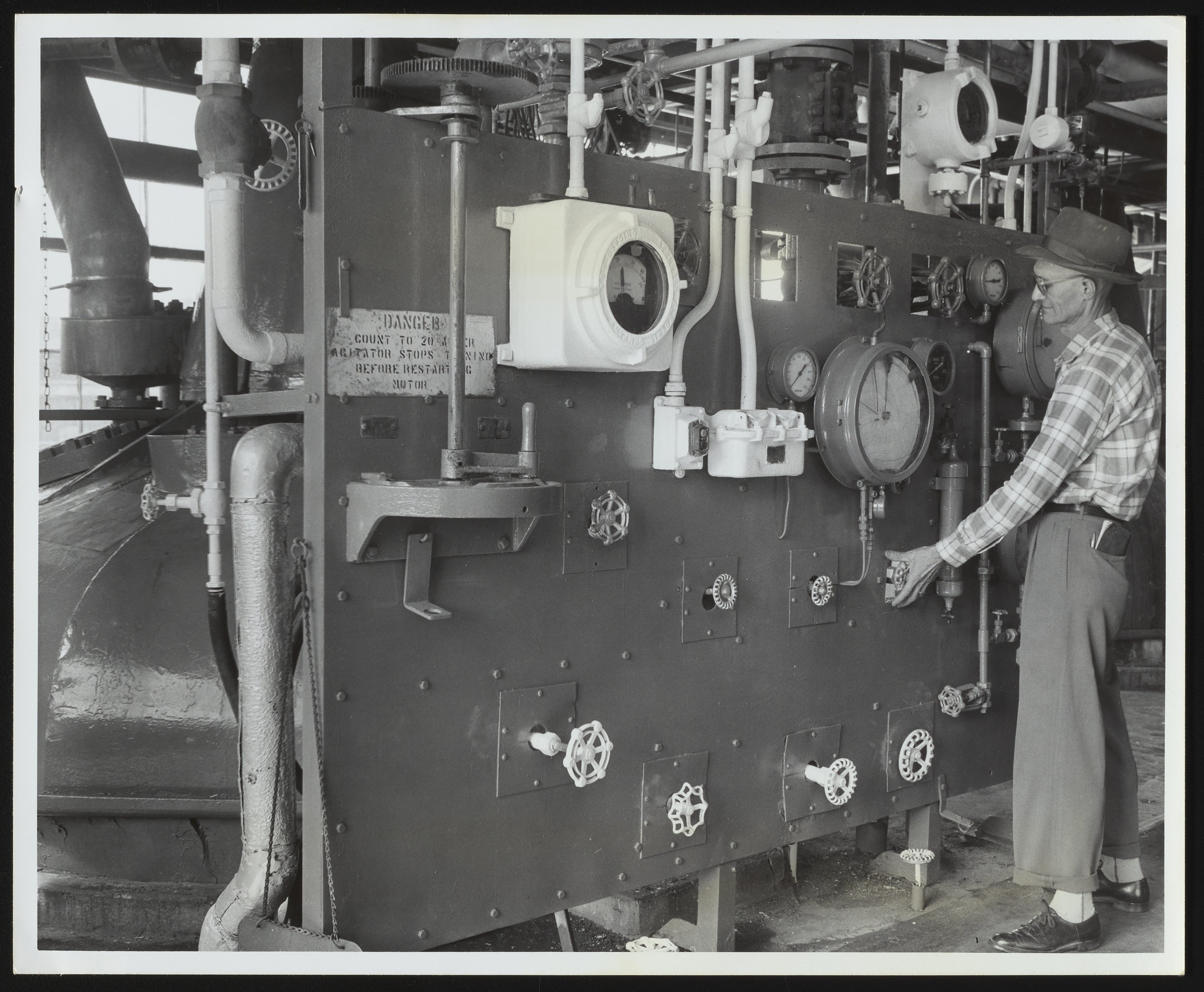 Employee operating autoclave control panel at Hercules Hopewell plant