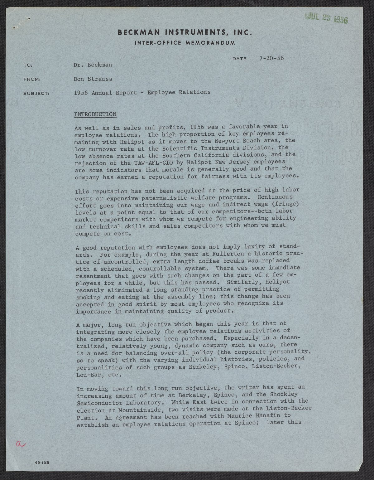 Strauss, Don. “Memo from Don Strauss to Arnold O. Beckman,” July 20, 1956. Beckman Historical Collection, Box 14, Folder 27. Science History Institute. Philadelphia. https://digital.sciencehistory.org/works/sb3979160.