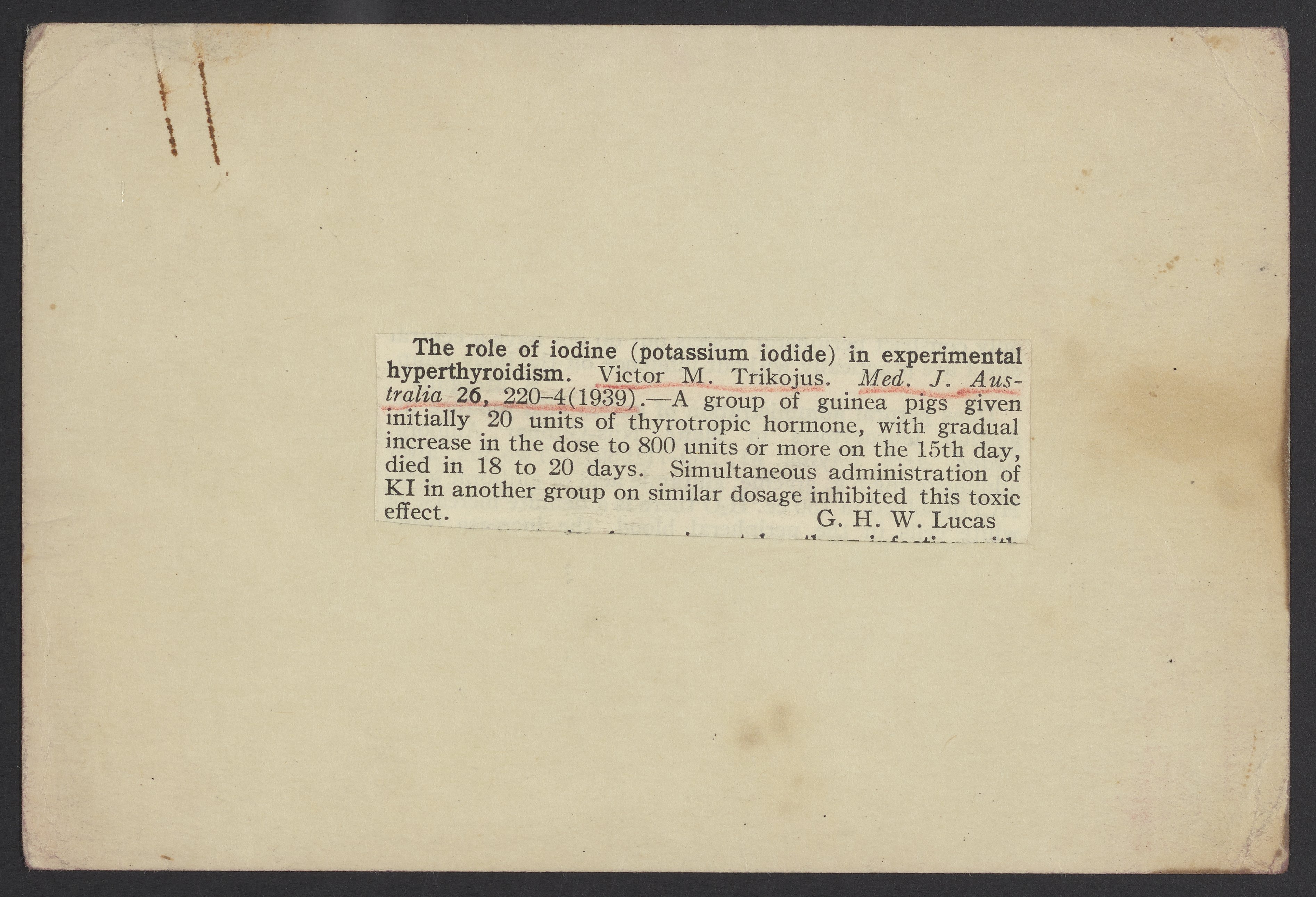 Clipping pasted to a note card with information about an article titled The role of iodine (potassium iodide) in experimental hyperthyroidism by Viktor M. Trikojus.