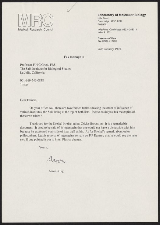 Klug, A. (Aaron), Sir. “Letter from Aaron Klug to Francis Crick, January 26, 1995,” January 26, 1995. History of Molecular Biology Collection, Box 20, Folder 5. Science History Institute. Philadelphia. https://digital.sciencehistory.org/works/sc6cbxx.