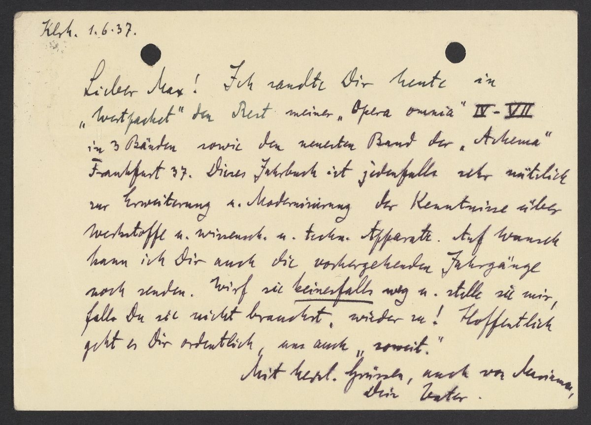 Lieber Max! Ich sandte Dir heute in „Wertpacket“ den Rest meiner „Opera Omnia“ IV-VII in 3 Bänden sowie den neunten Band der „Akema“ Frankfurt 37. Dieses Jahrbuch ist jedenfalls sehr nützlich zur Erweiterung u. Modernisierung der Kenntnisse über Werkstoffe u. wissensch. U. techn. Apparate. Auf Wunsch kann ich Dir auch die vorhergehenden Jahrgänge noch senden. Wirf sie keinesfalls weg u. stelle sie mir, falls Du sie nicht brauchst, wieder zu! Hoffentlich geht es Dir ordentlich, uns auch soweit.