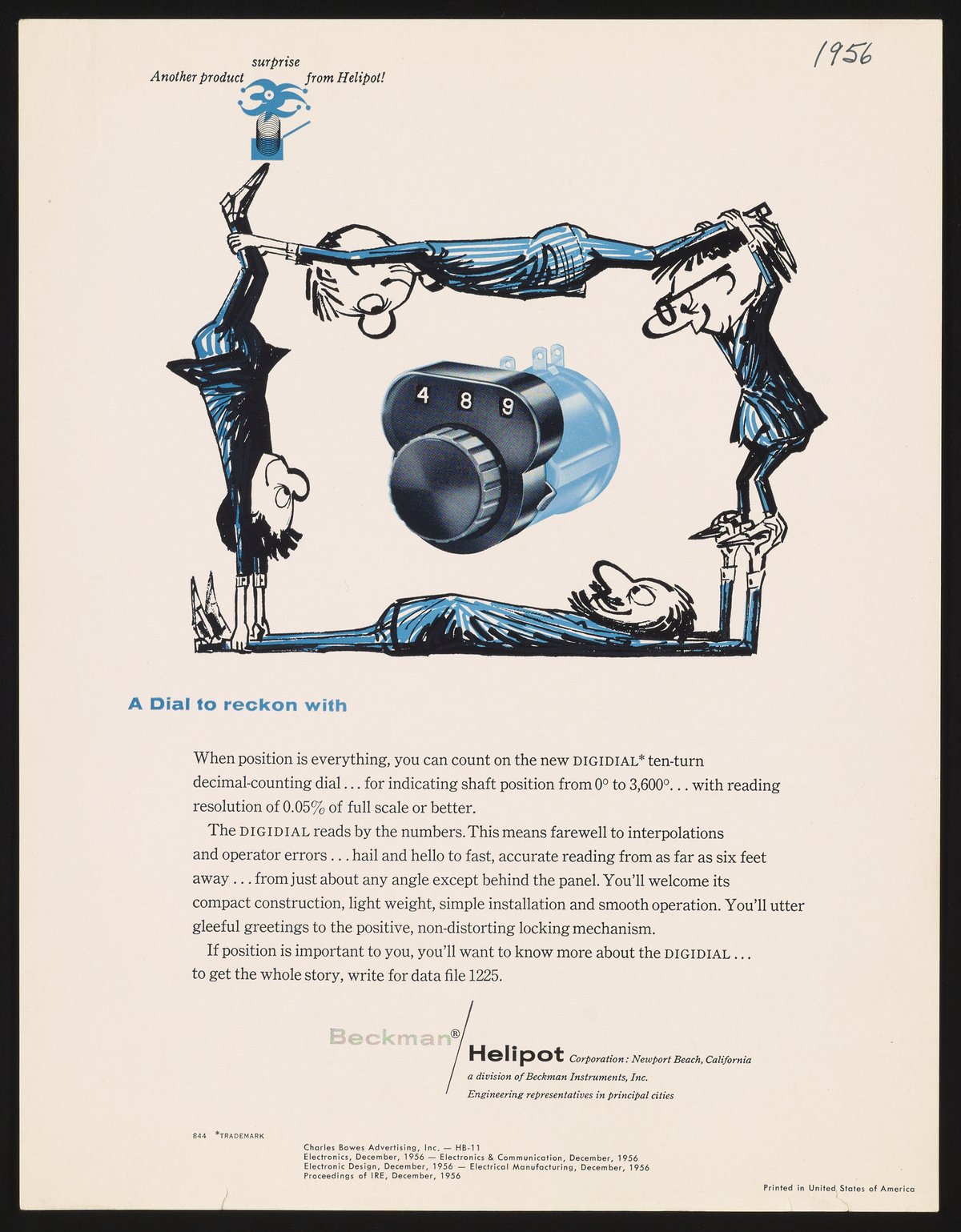 Beckman Instruments, Inc., and Charles Bowes Advertising. “A Dial to Reckon With,” 1956. Beckman Historical Collection, Box 49, Folder 13. Science History Institute. Philadelphia. https://digital.sciencehistory.org/works/sf268508b.