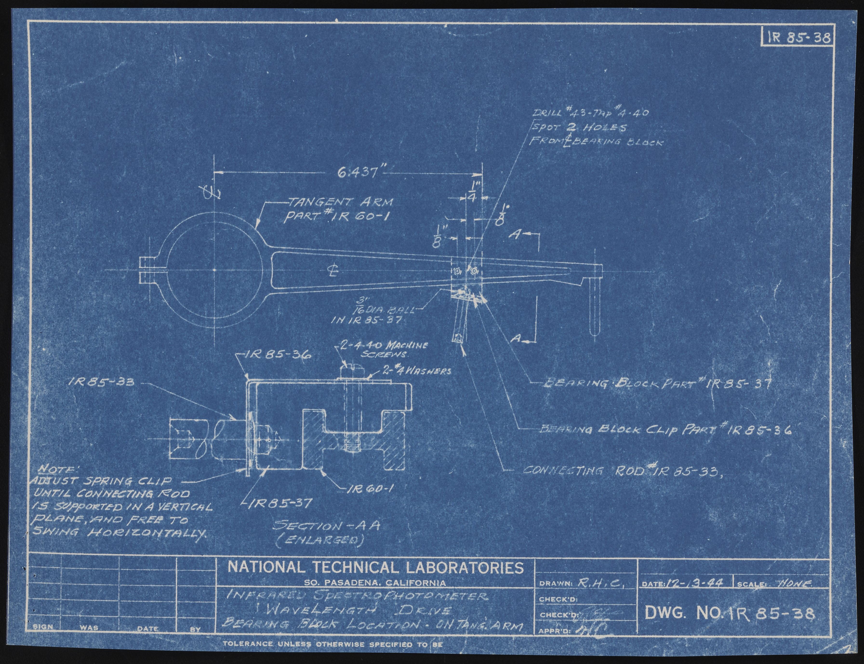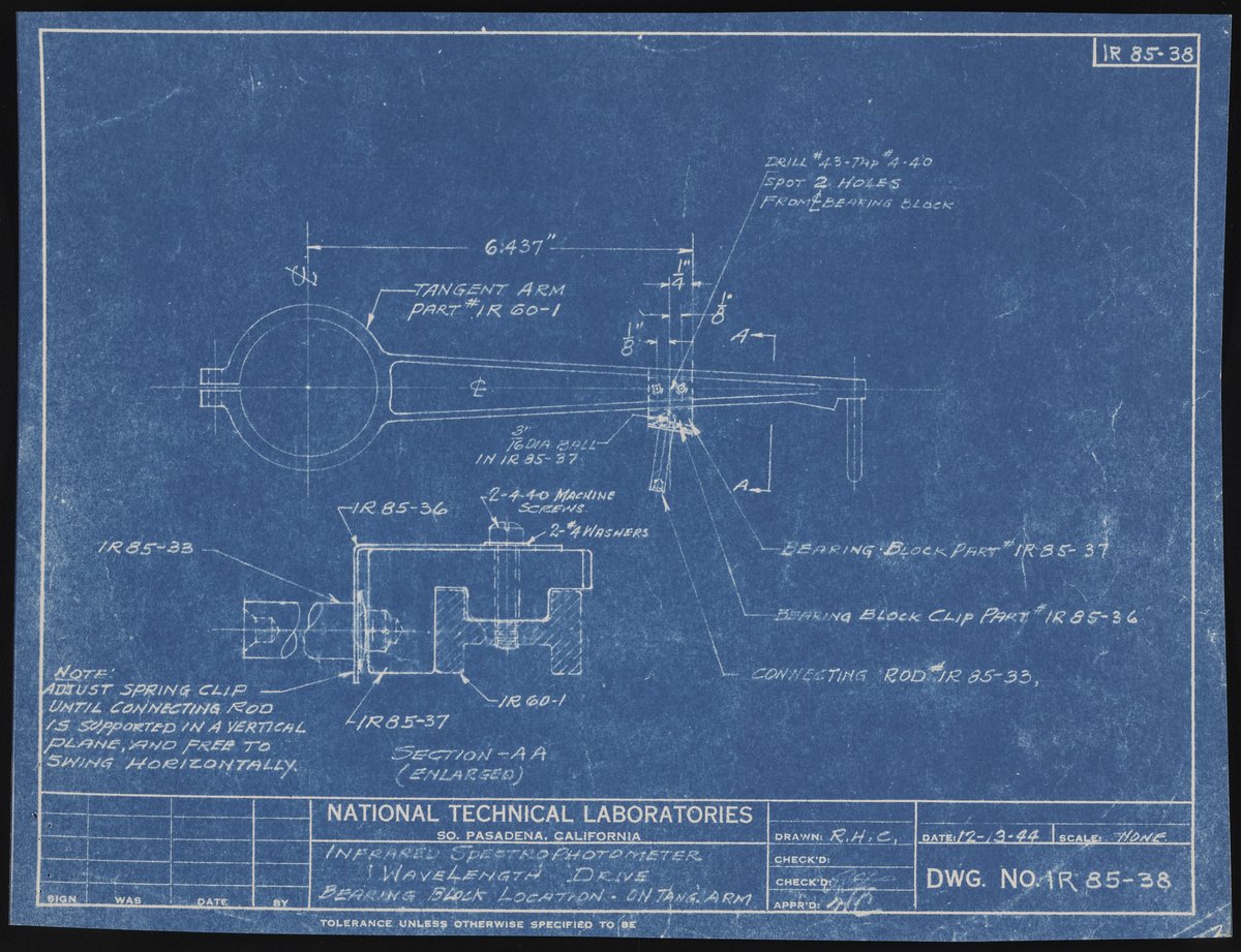 Beckman Instruments, Inc. “Beckman IR Spectrophotometer Wavelength Drive Bearing Block Location,” December 13, 1944. Beckman Historical Collection, Box 18, Folder 9. Science History Institute. Philadelphia. https://digital.sciencehistory.org/works/sf268512x.