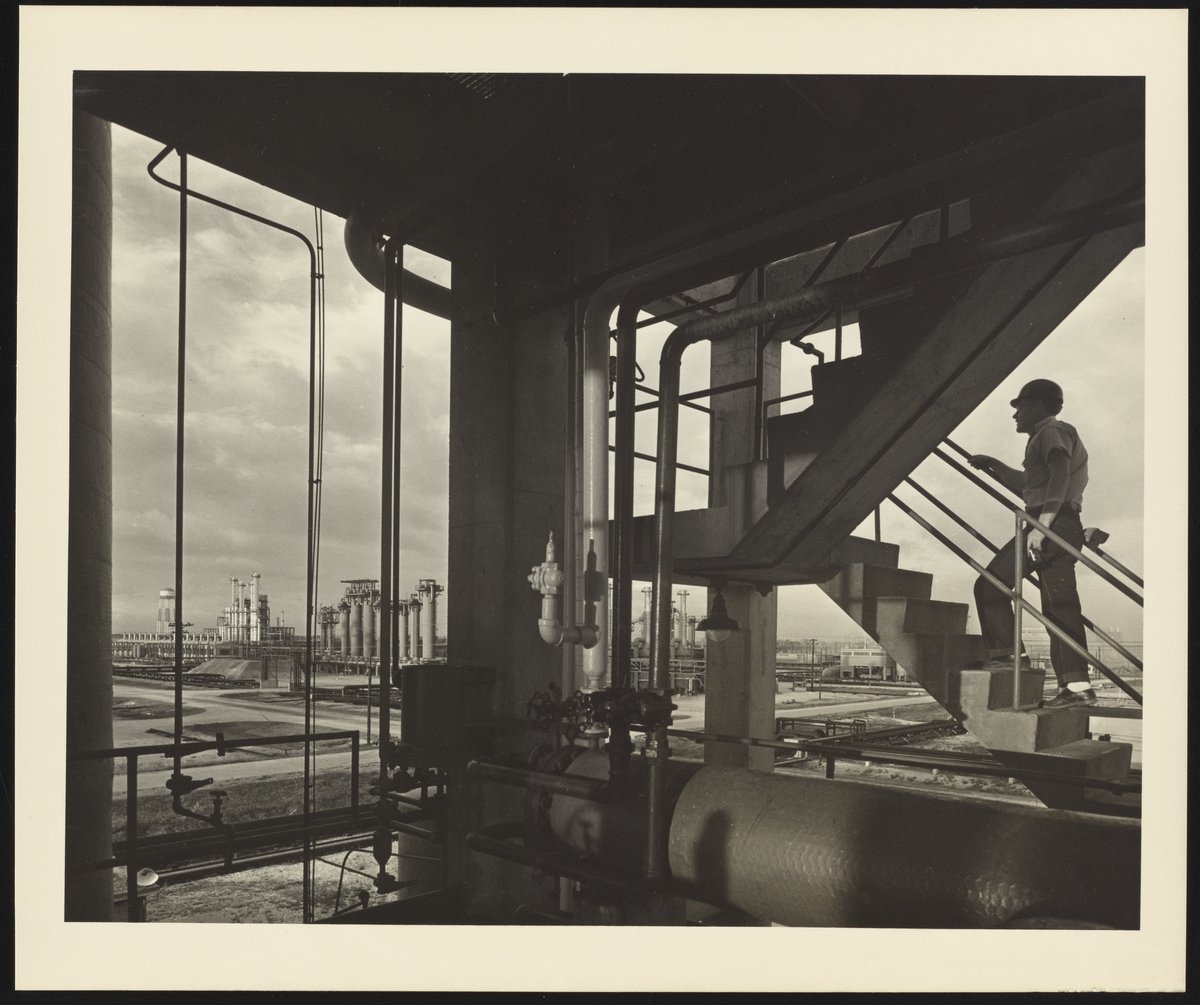 General view of an unidentified employee climbing stairs at the Dow Chemical Company's Styrene plant located in Freeport, Texas. An organic compound derived from benzene, styrene is a precursor to polystyrene and was popularized in the 1940's as a feedstock for synthetic rubber.