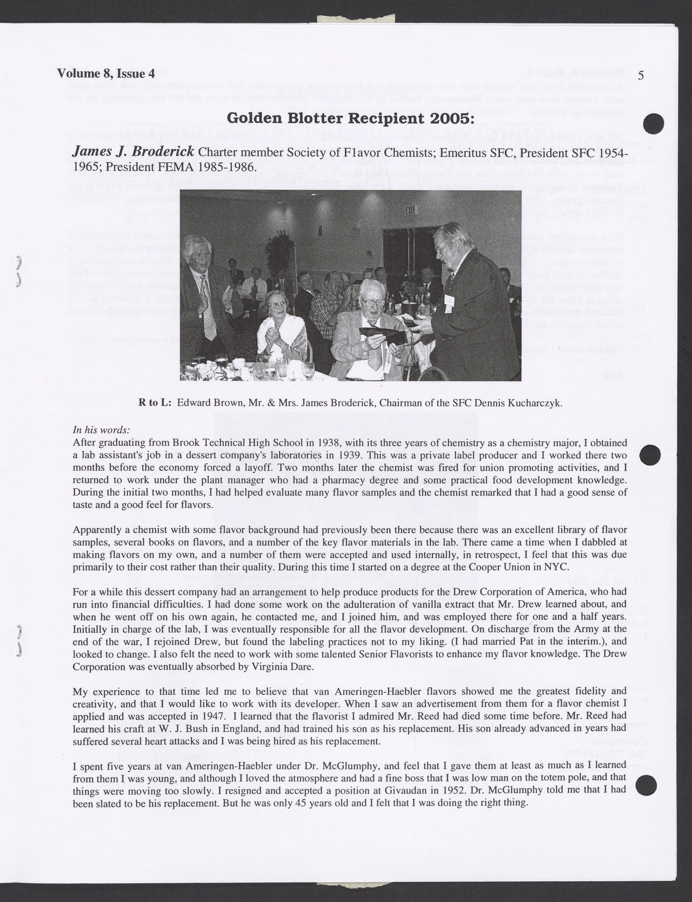 Society of Flavor Chemists. “Society News, Volume 8, Issue 4,” 2005. Society of Flavor Chemists, Society News, Box 1, Folder 2. Science History Institute. Philadelphia. https://digital.sciencehistory.org/works/shxxfa3.