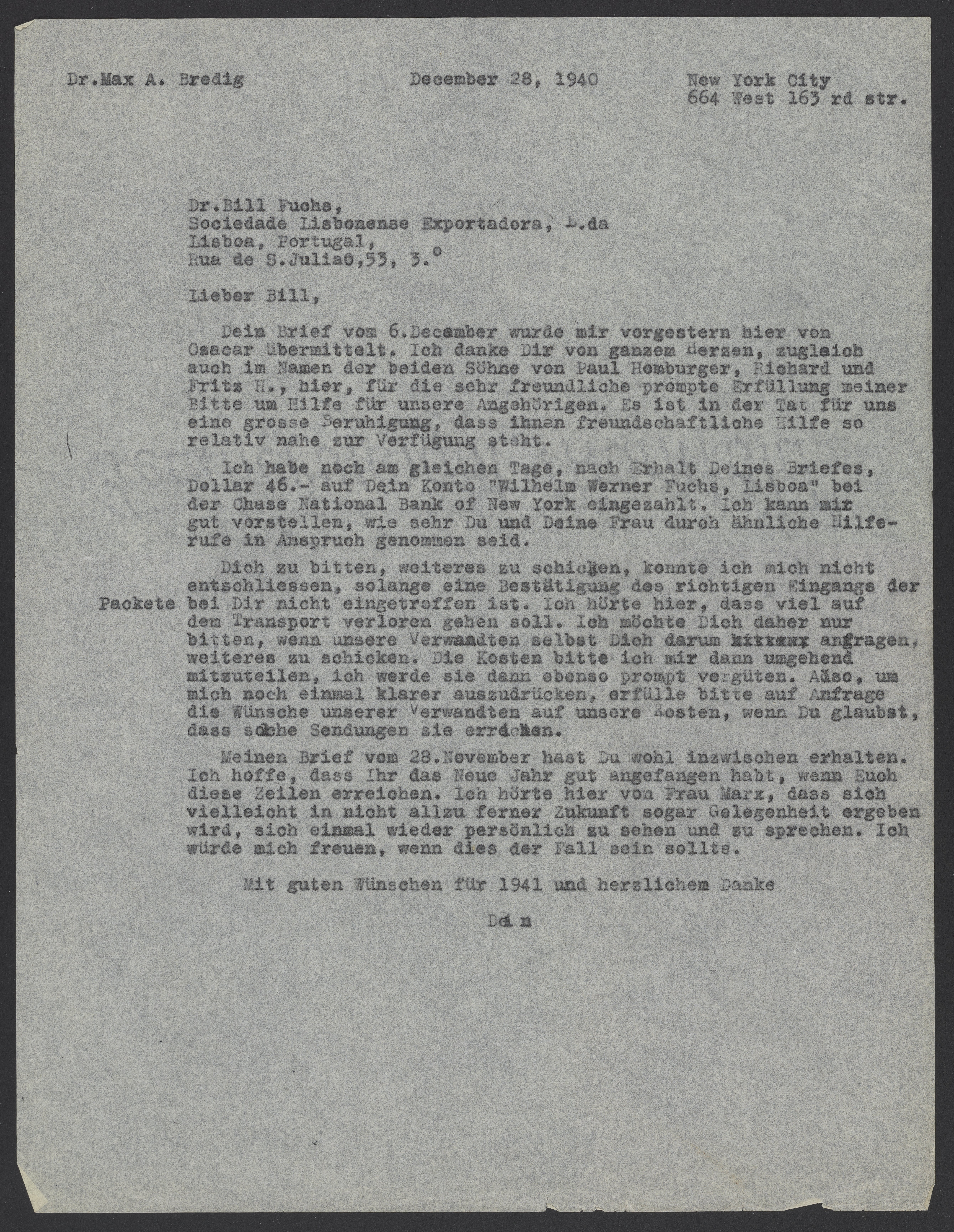 Letter from Max Bredig to Bill Fuchs, December 28, 1940