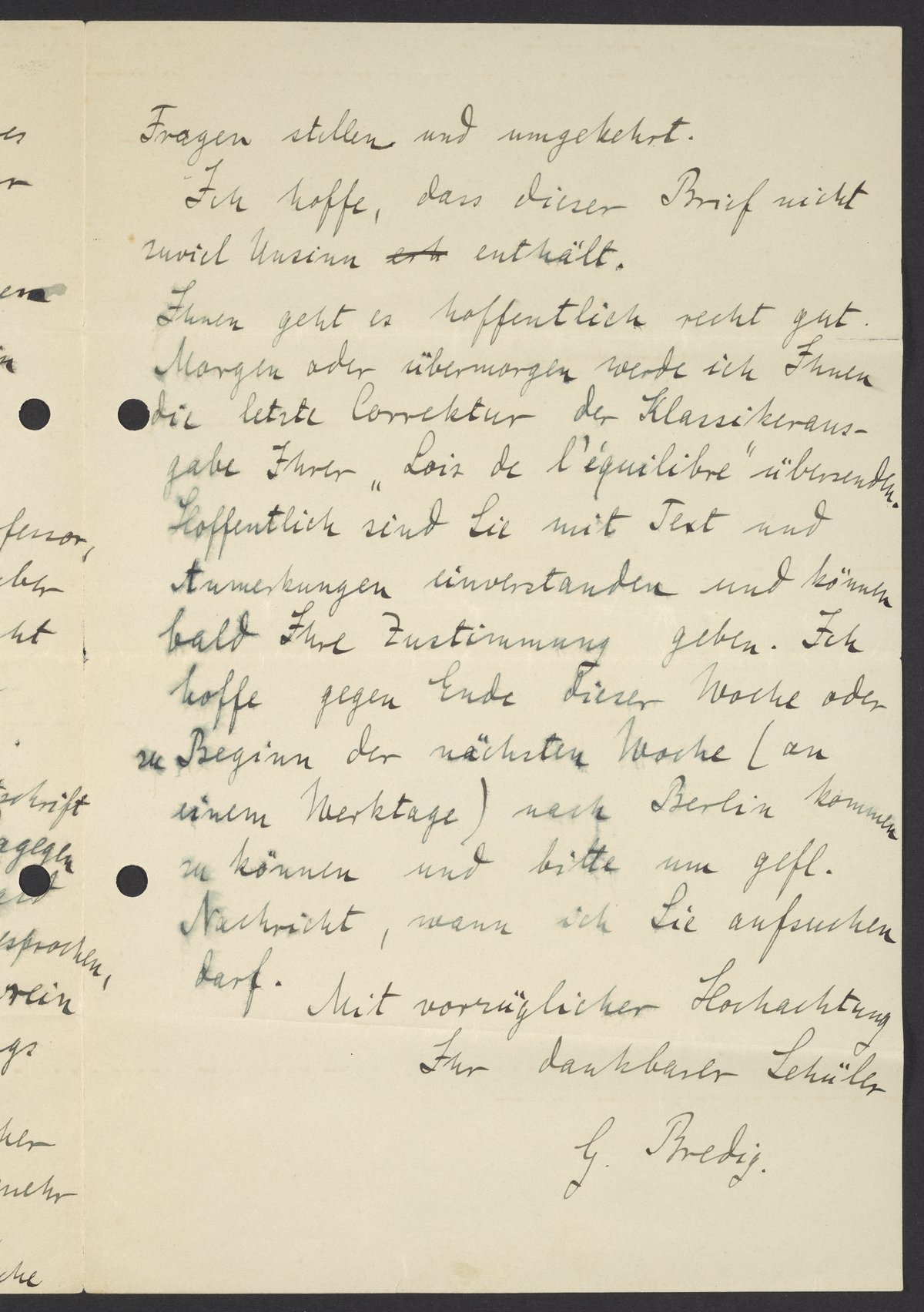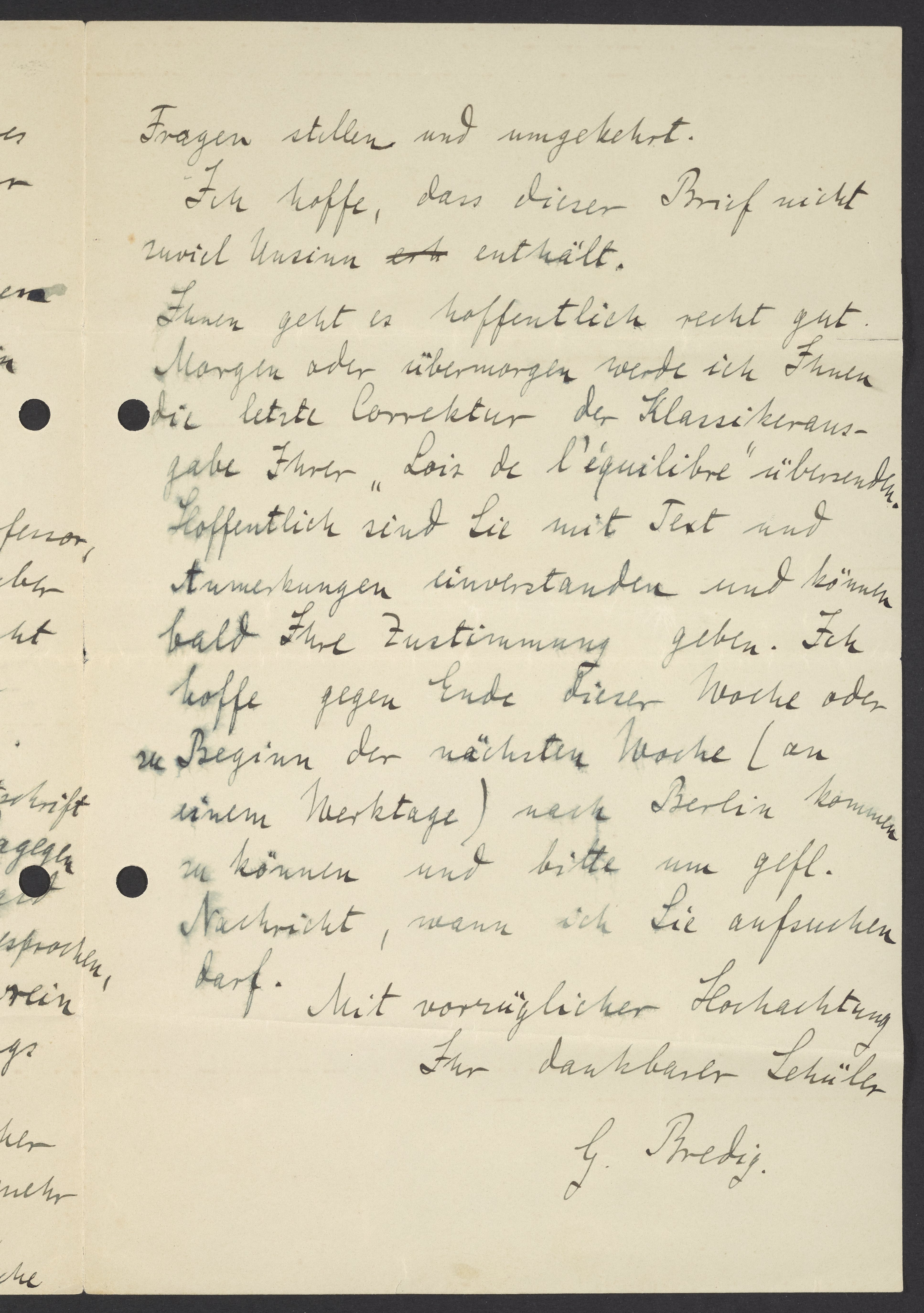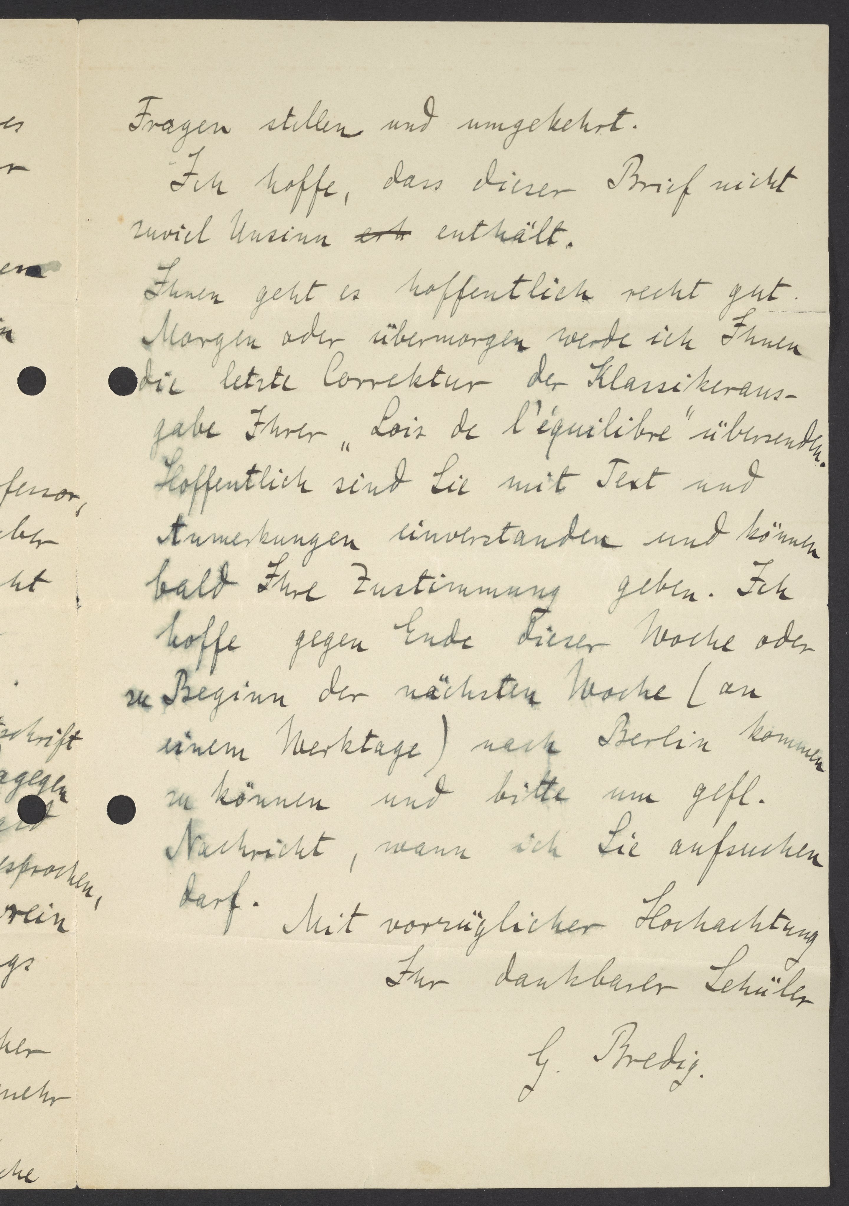 Ihnen geht es hoffentlich recht gut. Morgen oder übermorgen werde ich Ihnen die letzte Correktur der Klassikherausgabe Ihrer „Lois de l’equiblibre“ übersenden. Hoffentlich sind Sie mit Text und Anmerkungen einverstanden und können bald Ihre Zustimmung geben. Ich hoffe gegen Ende dieser Woche oder zu Beginn der nächsten Woche (an einem Werktage) nach Berlin kommen zu können und bitte um gefl. Nachricht, wann ich Sie aufsuchen darf.
