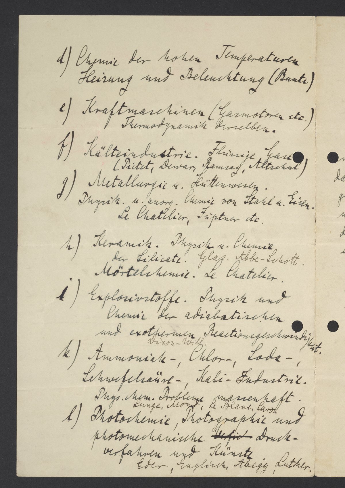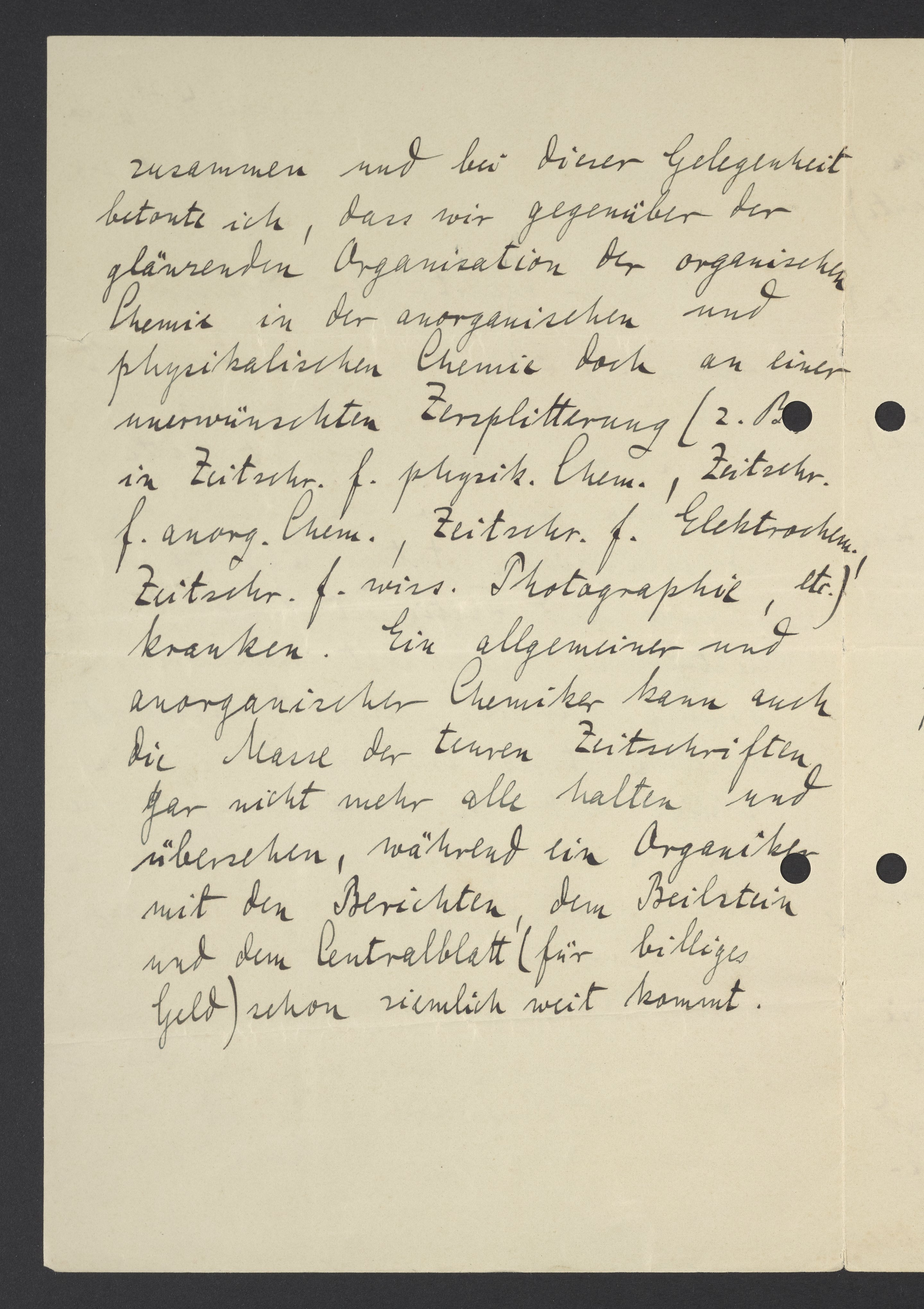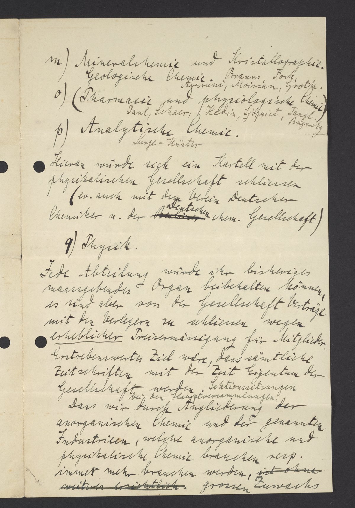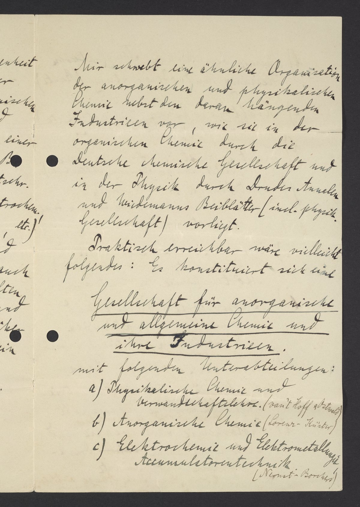 Mir schwebt eine ähnliche Organisation der anorganischen und physikalischen Chemie nebst den daran hängenden Industrien vor, wie sie in der organischen Chemie durch die Deutsche chemische Gesellschaft und in der Physik durch Drudes Annalen und Weidemanns Beiblätter (incl. physik. Gesellschaft) vorliegt.