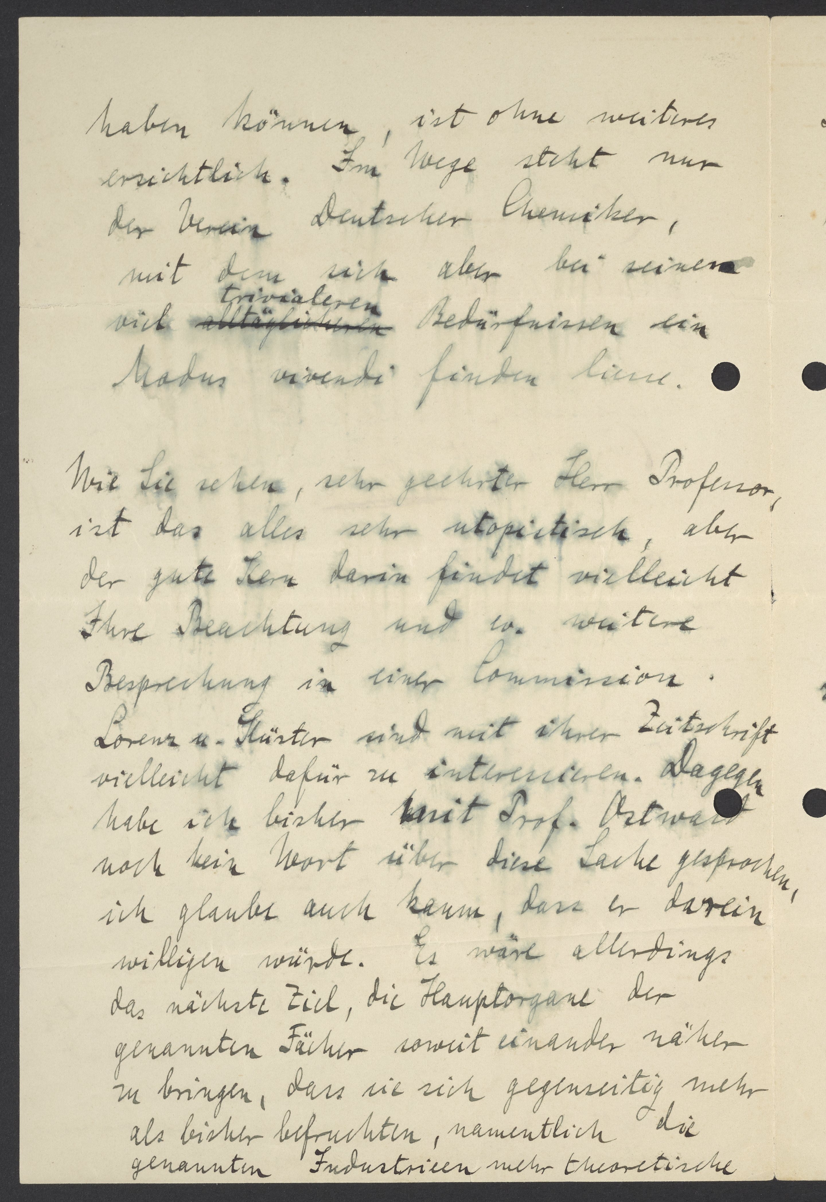 Wie Sie sehen, sehr geehrter Herr Professor, ist das alles sehr utopisch, aber der gute Kern darin findet vielleicht Ihre Beachtung und ev. weitere Besprechung in einer Commision. Lorenz u. Küster sind mit ihrer Zeitschrift vielleicht dafür zu interessieren. Dagegen habe ich bisher mit Prof. Ostwald noch kein Wort über diese Sache gesprochen, ich glaube auch kaum, dass er darein willigen würde. Es wäre allerdings das nächste Ziel, die Hauptorgane der genannten Fächer soweit einander näher zu bringen, dass sich gegenseitig mehr als bisher befruchten, namentlich die genannten Industrien mehr theoretische