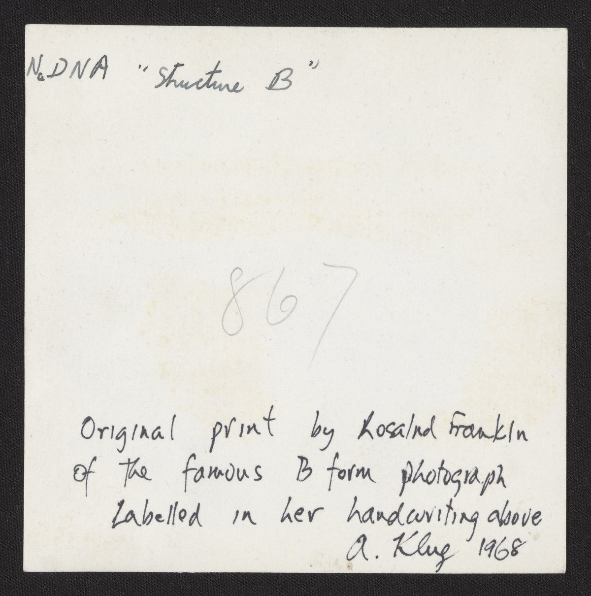 Small JPG1200 x 1221px — 228 KBFull-sized JPG2687 x 2733px — 887 KBOriginal fileTIFF — 2687 x 2733px — 21.0 MBPhotographic print of a DNA X-ray diffraction pattern known as Photograph 51 with annotations by Rosalind Franklin (1920-1958) and Aaron Klug (1926-2018). The original image was made by Franklin and her student Raymond Gosling (1926-2015) at King’s College London in 1952 and it was published in their 1953 Nature article “Molecular Configuration in Sodium Thymonucleate” alongside the article in which James Watson (1928-2025) and Francis Crick (1916-2004) proposed the double-helix structure of DNA. The photo contains three annotations on the reverse. An unsigned pen inscription reads “NaDNA ‘Structure B.’” Another pen inscription reads “Original print by Rosalind Franklin of the famous B form photograph. Labelled in her handwriting above. A. Klug 1968.” A pencil annotation reads “867.”