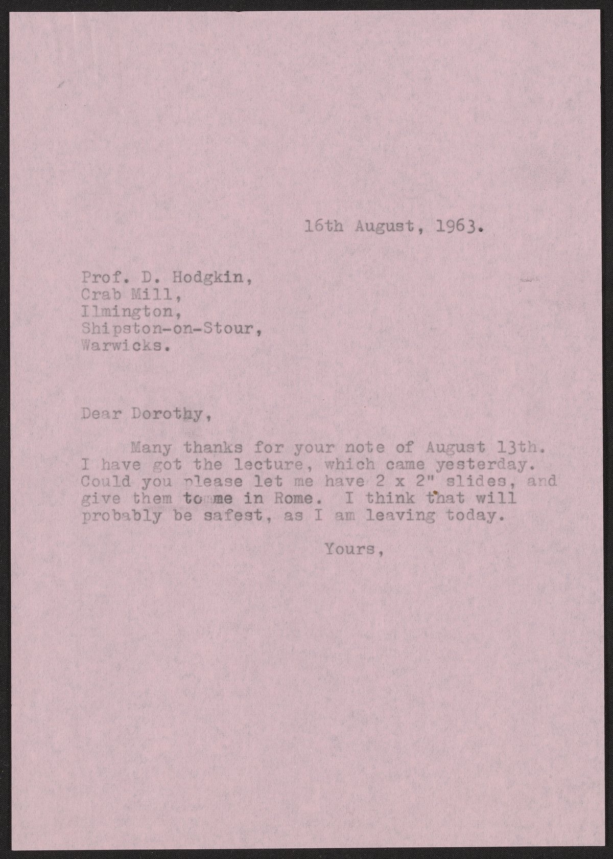 Letter from Max Perutz to Dorothy Hodgkin, August 16, 1963