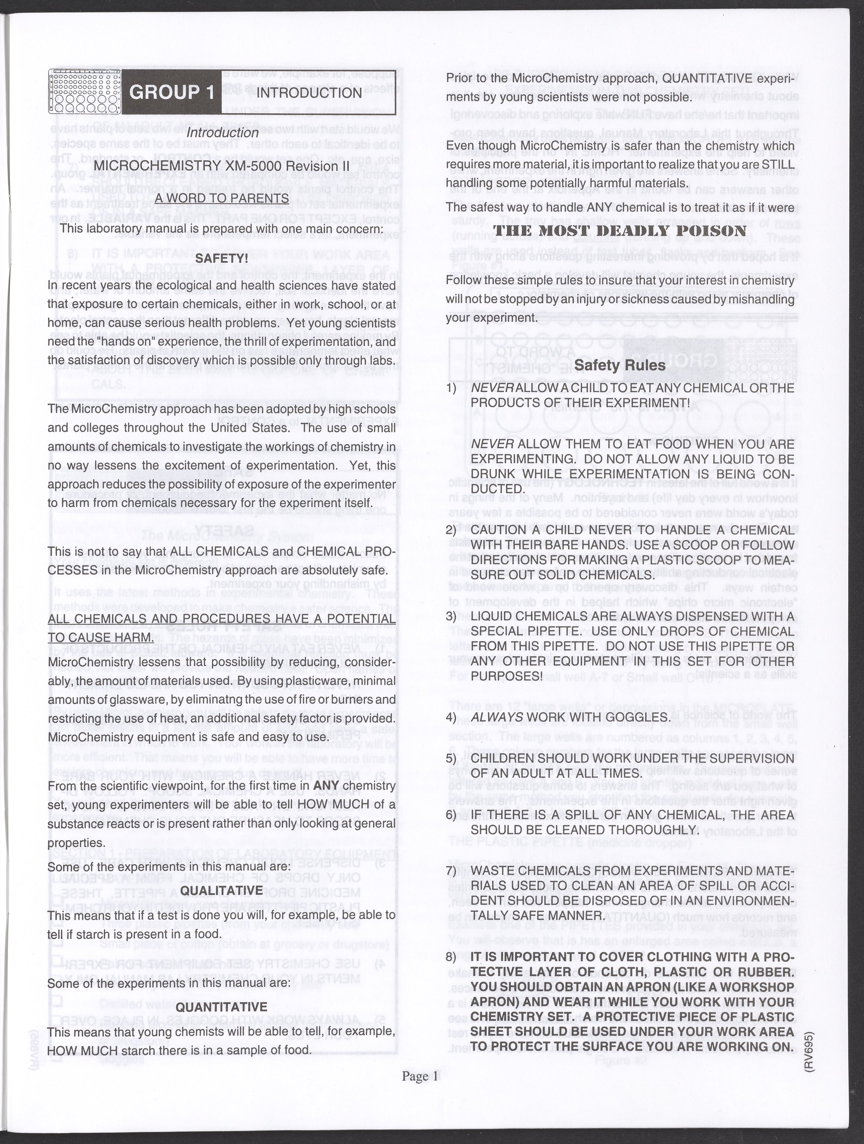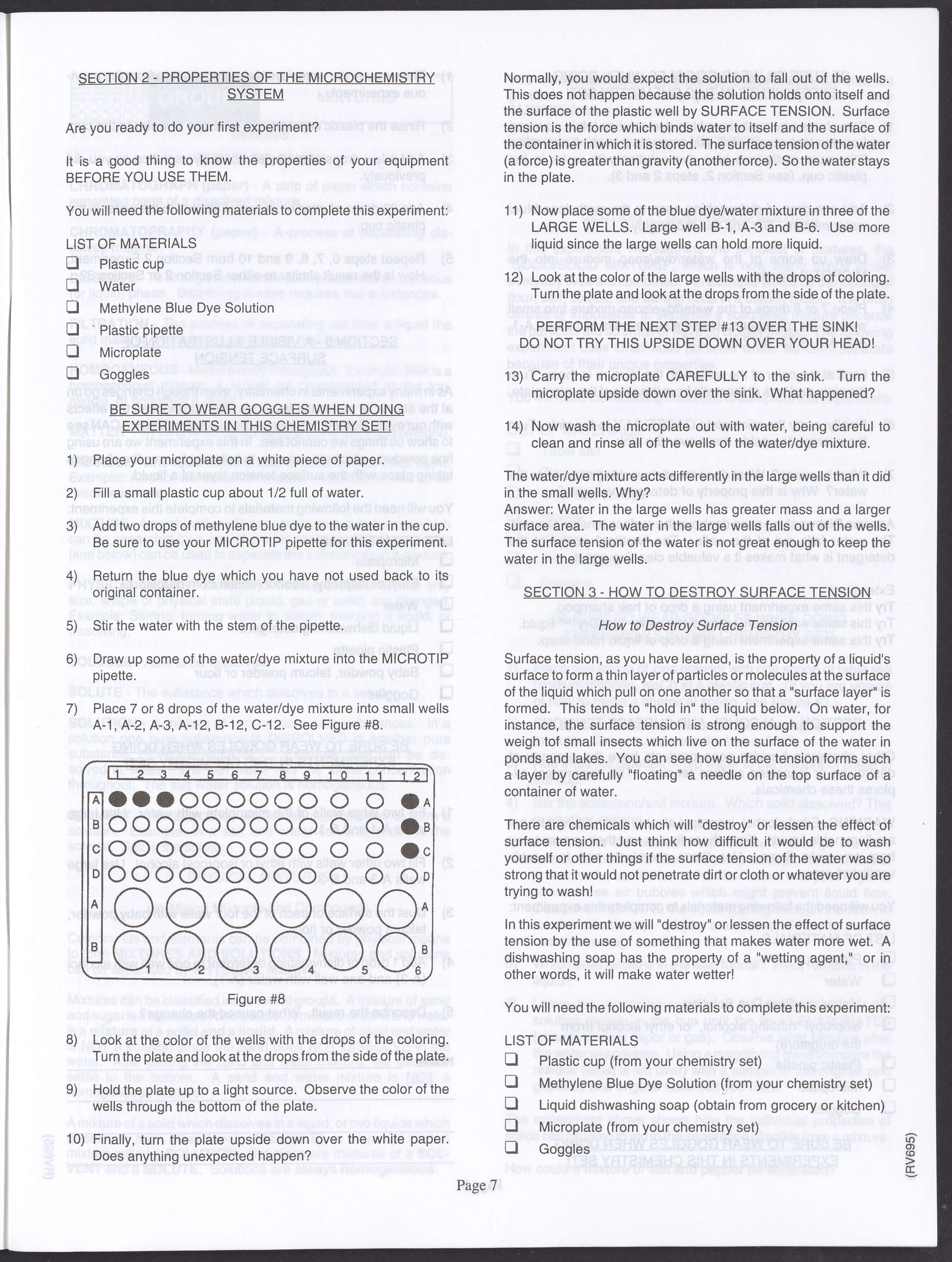Small JPG1200 x 1571px — 264 KBLarge JPG2880 x 3771px — 1.1 MBFull-sized JPG3520 x 4609px — 1.5 MBOriginal fileTIFF — 3520 x 4609px — 46.5 MBAn instruction manual written to accompany the Smithsonian MicroChemistry XM 5000 chemistry set. Intended for use by children ages 10 and older, the manual describes how to use the set's tools, then outlines a series of experiments designed to convey the key concepts of chemical reactions, conservation of matter, phases of matter, acid-base chemistry, electrochemistry, organic chemistry, and biochemical reactions.