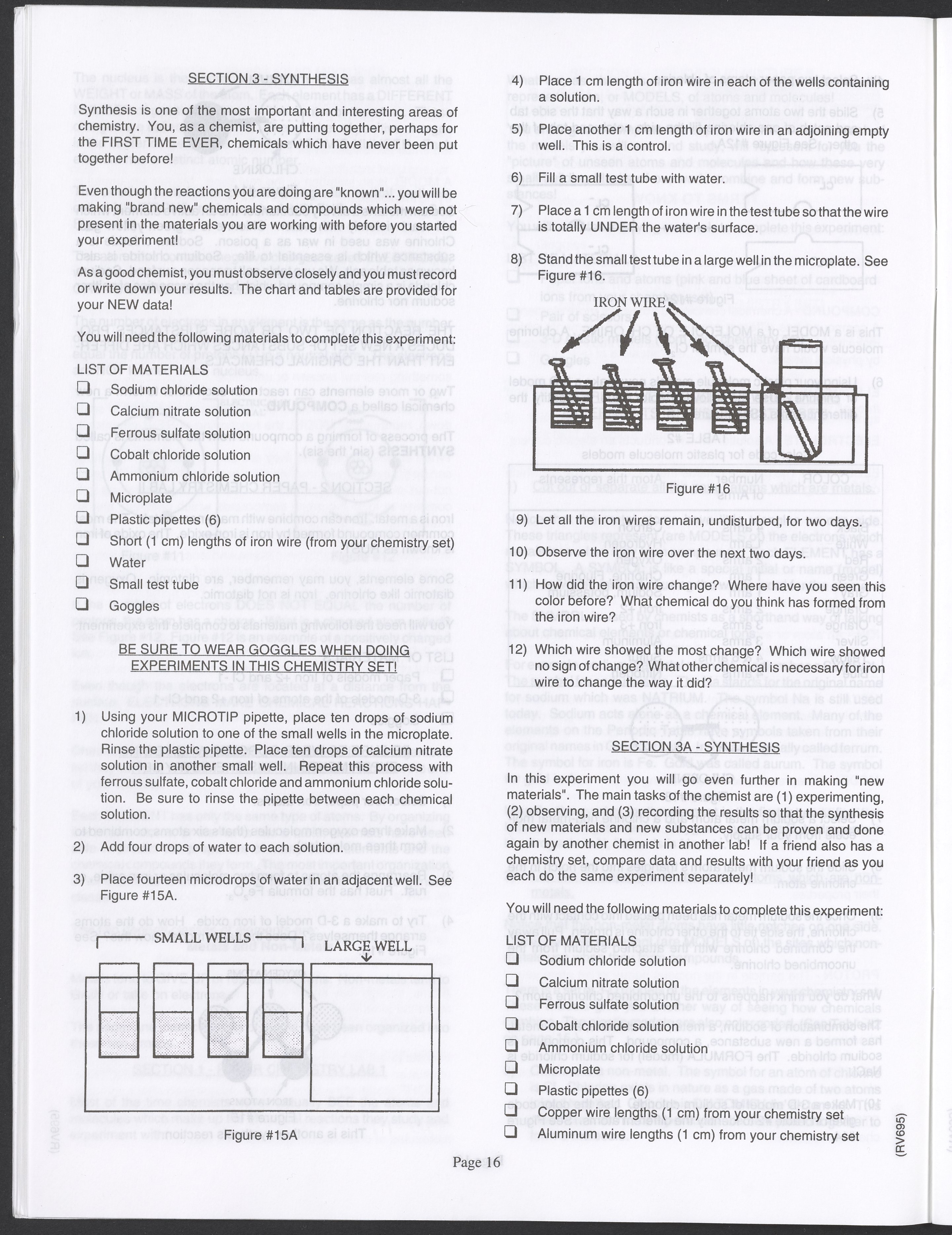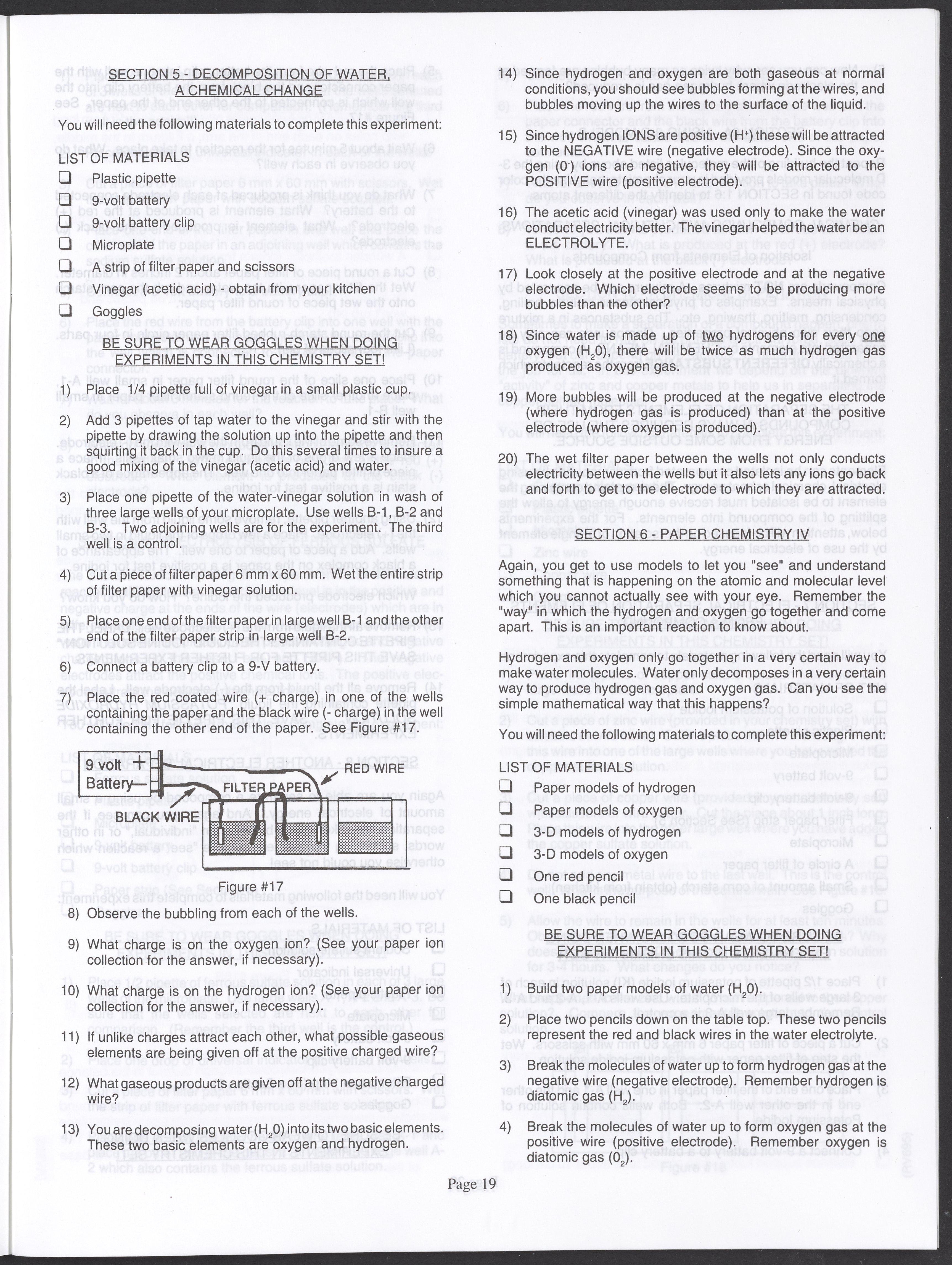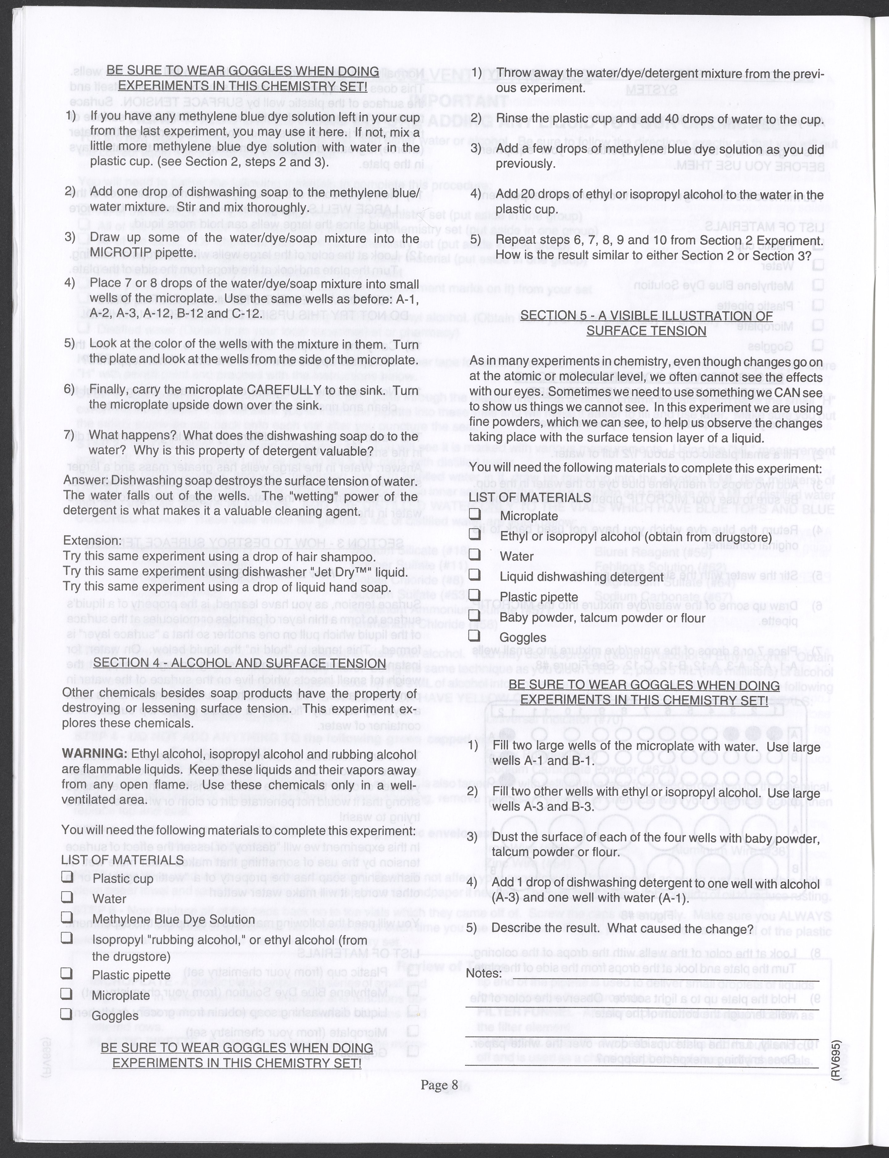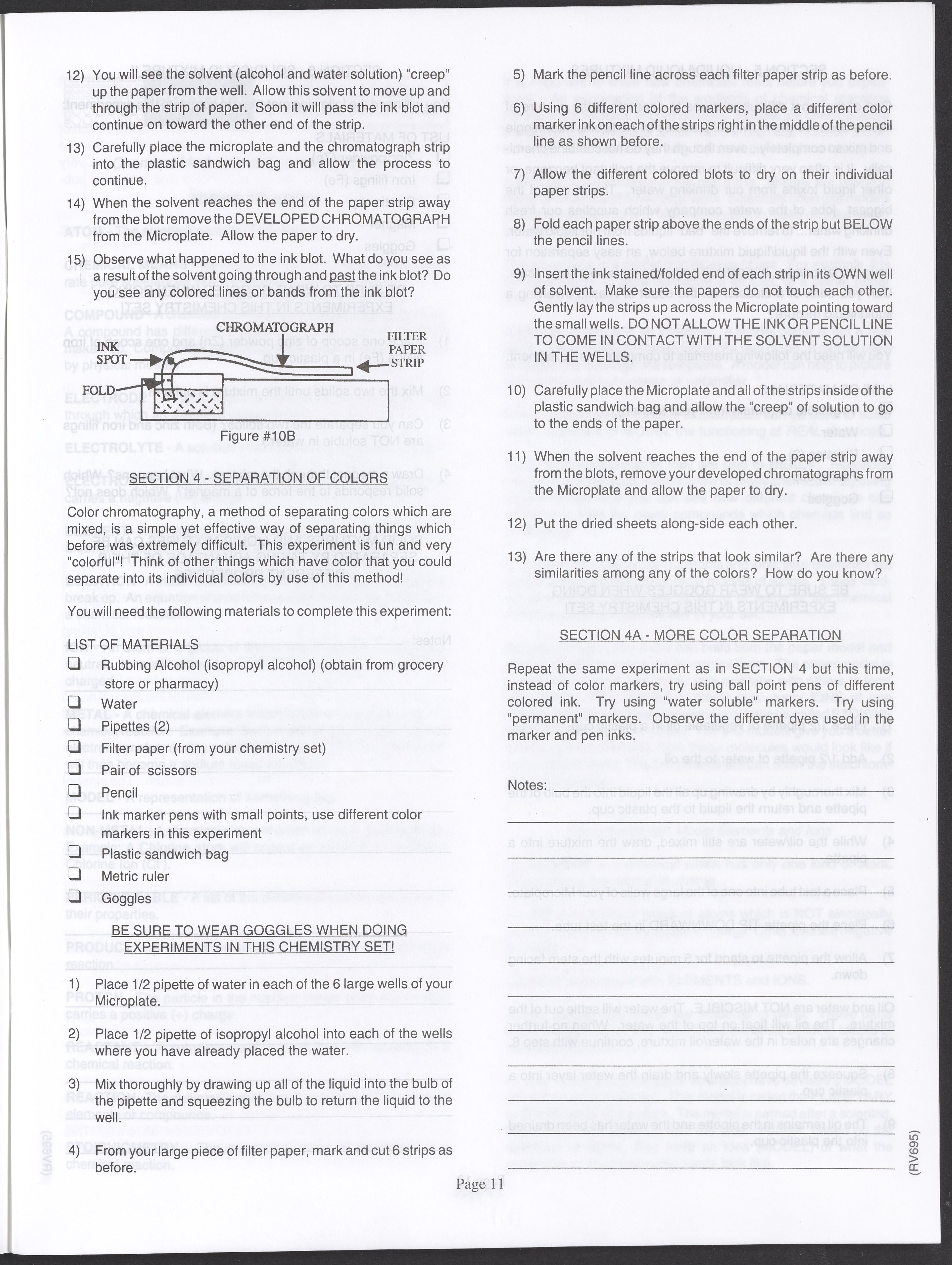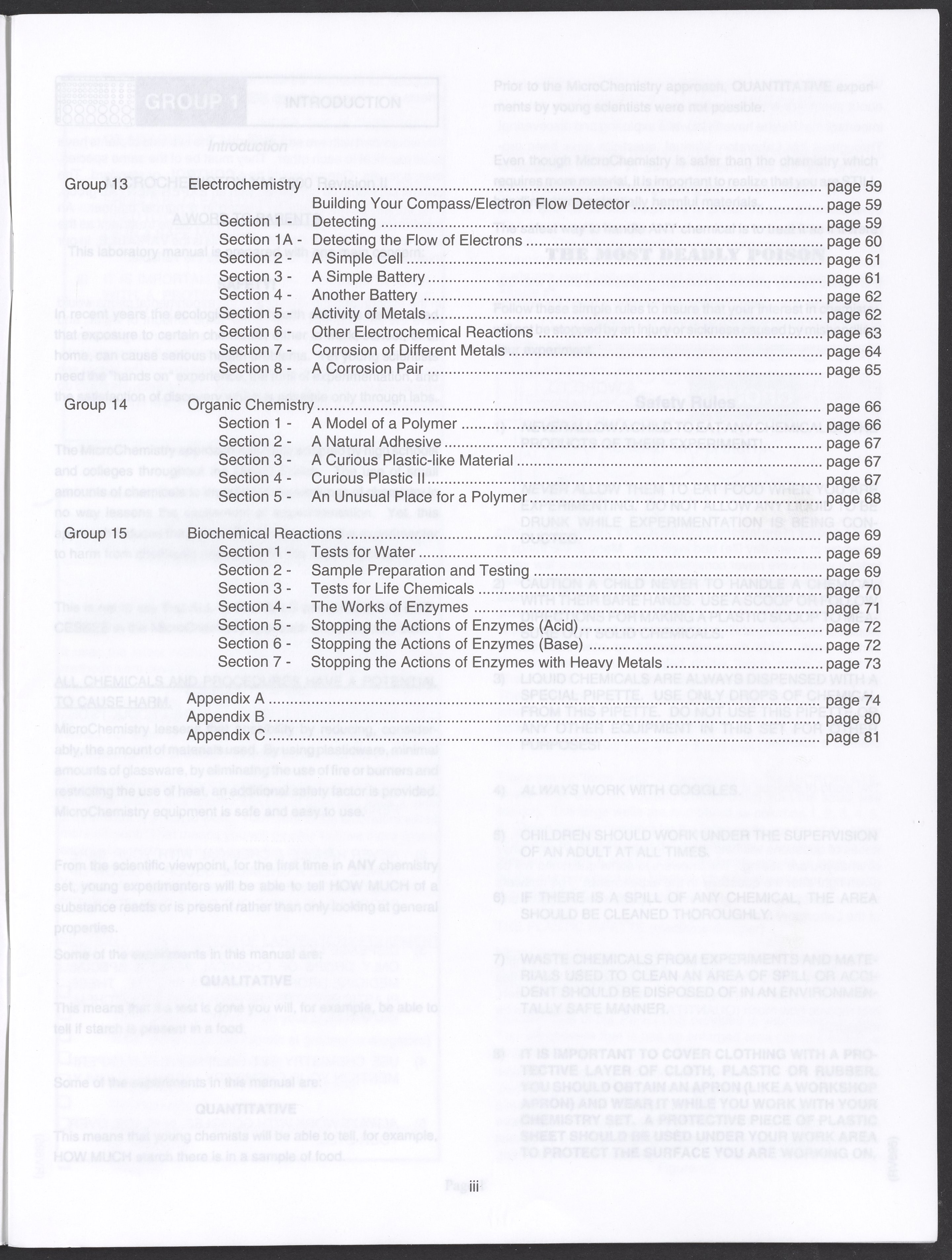 Small JPG1200 x 1571px — 264 KBLarge JPG2880 x 3771px — 1.1 MBFull-sized JPG3520 x 4609px — 1.5 MBOriginal fileTIFF — 3520 x 4609px — 46.5 MBAn instruction manual written to accompany the Smithsonian MicroChemistry XM 5000 chemistry set. Intended for use by children ages 10 and older, the manual describes how to use the set's tools, then outlines a series of experiments designed to convey the key concepts of chemical reactions, conservation of matter, phases of matter, acid-base chemistry, electrochemistry, organic chemistry, and biochemical reactions.