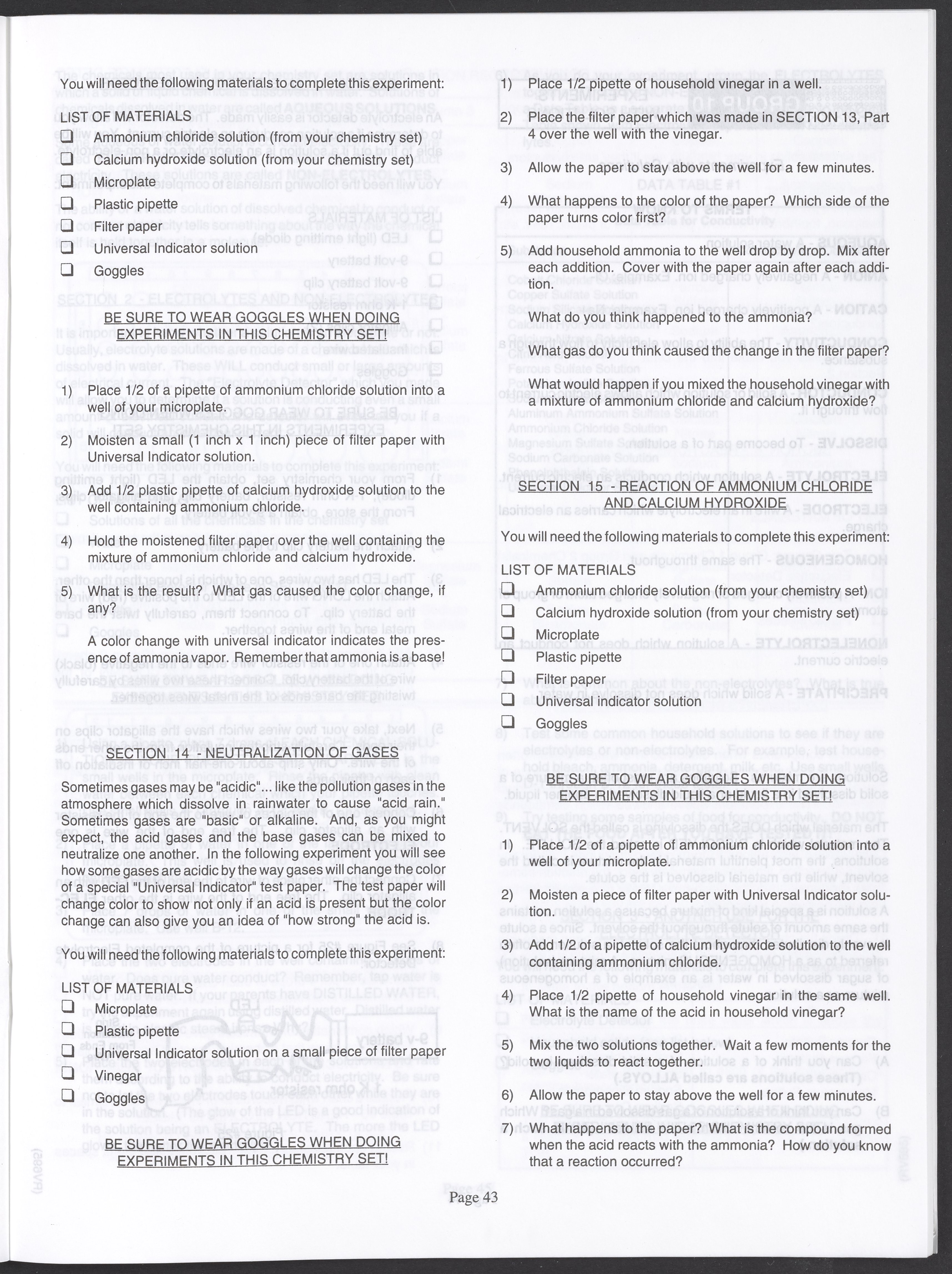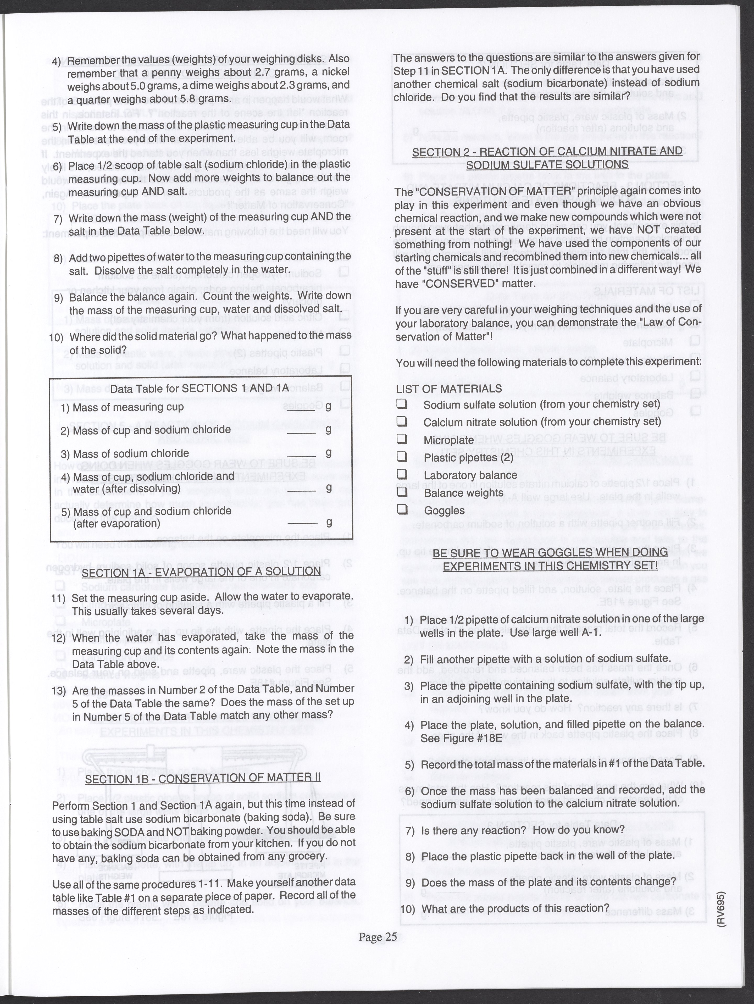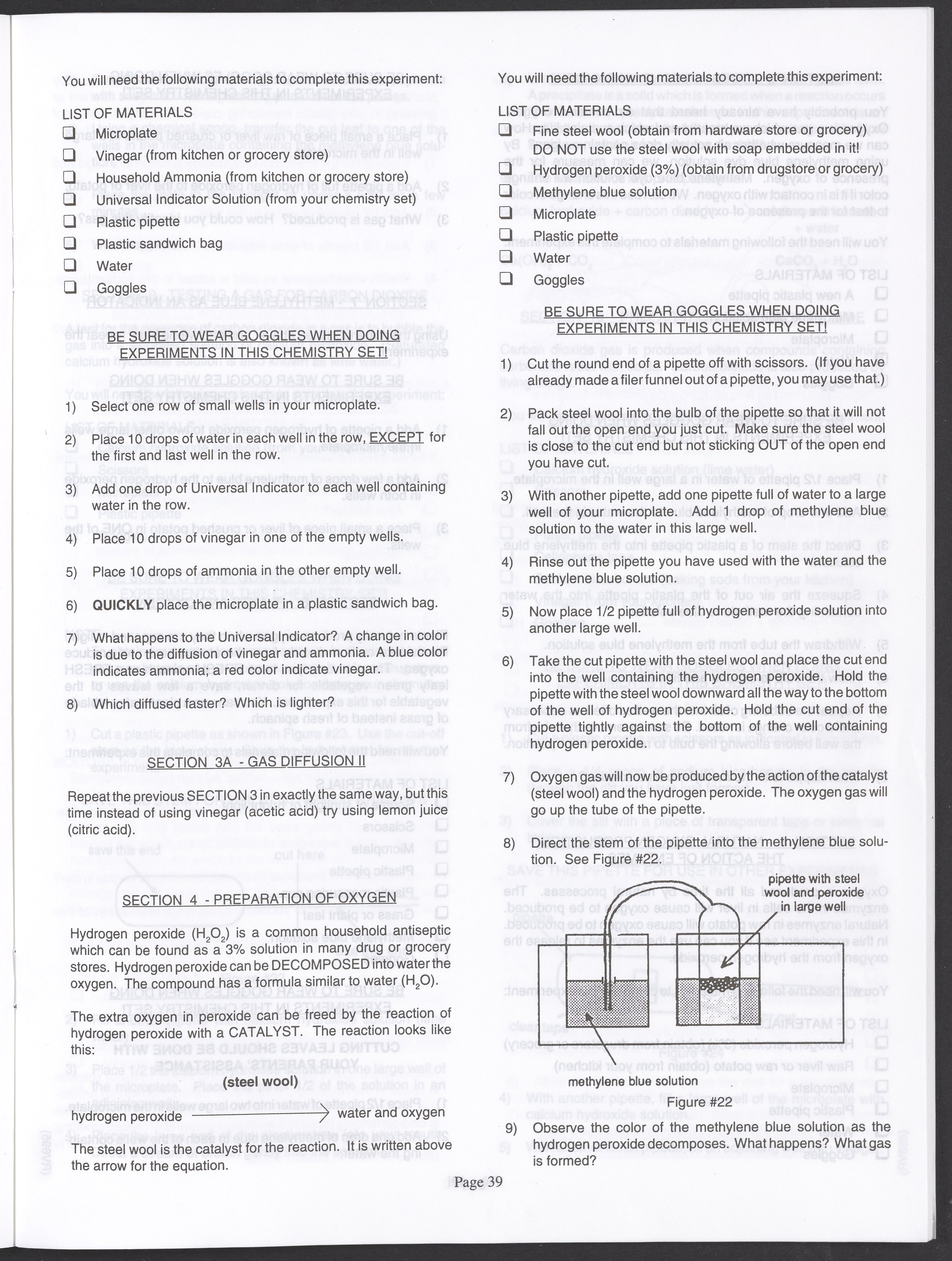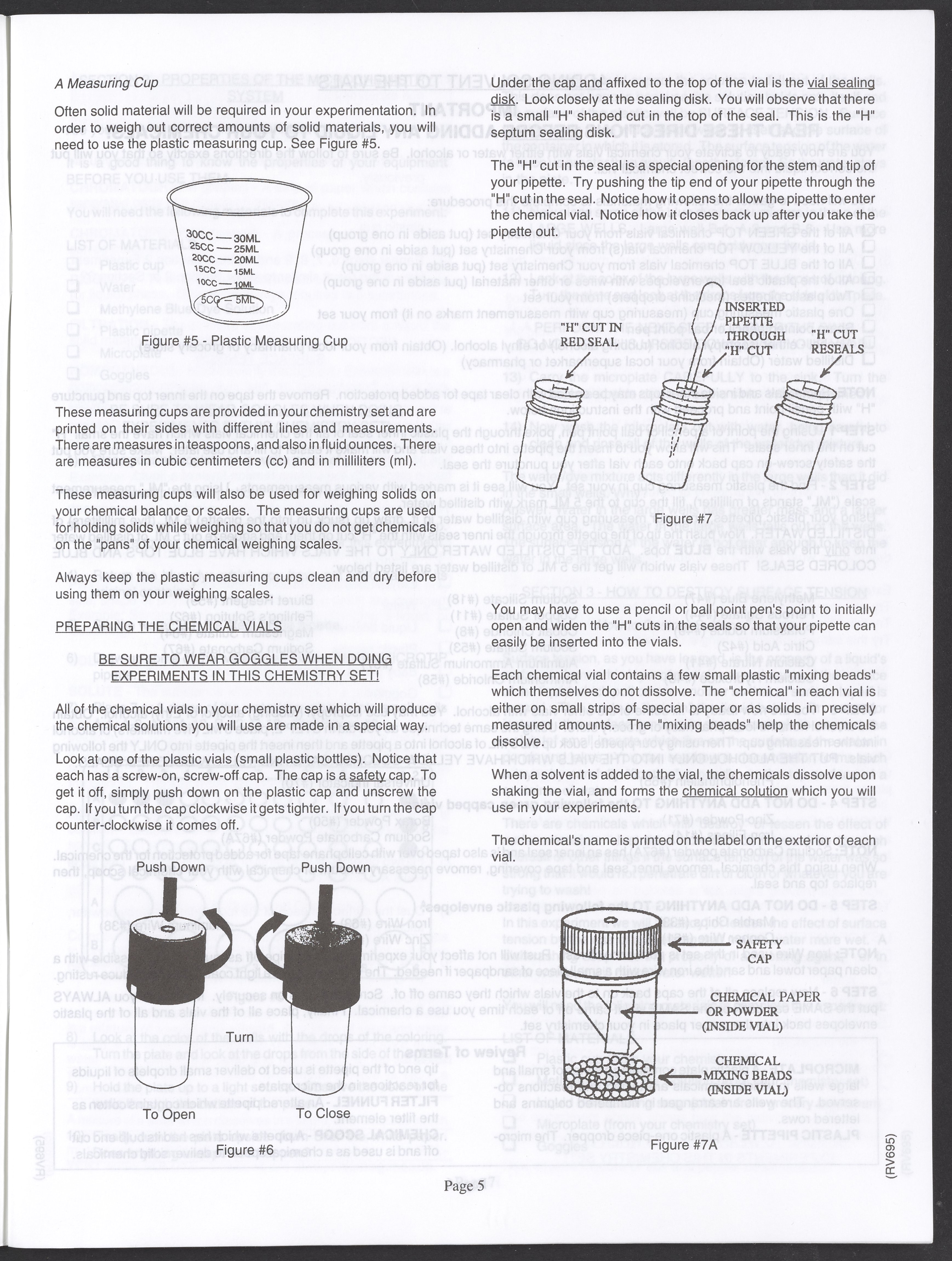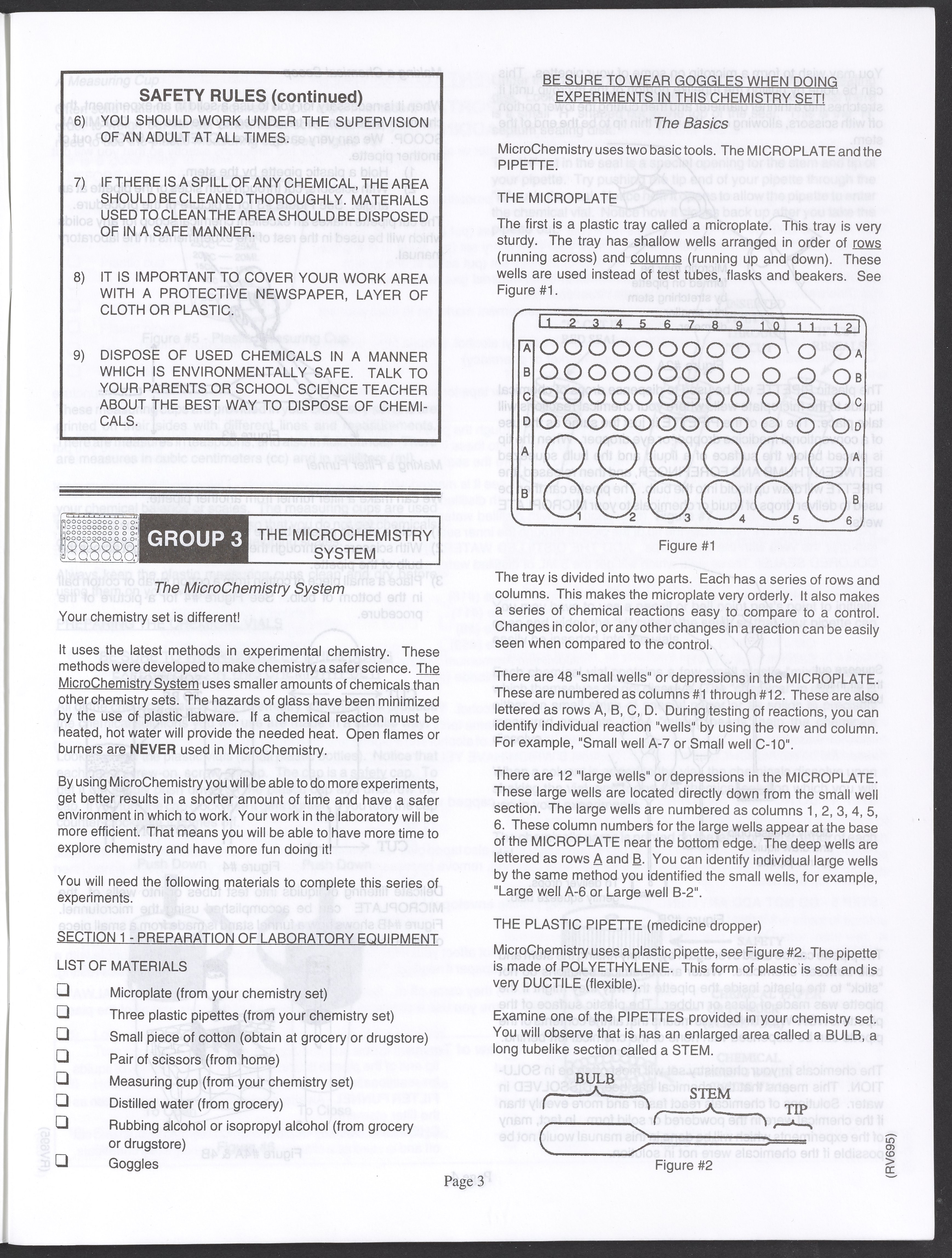 Small JPG1200 x 1571px — 264 KBLarge JPG2880 x 3771px — 1.1 MBFull-sized JPG3520 x 4609px — 1.5 MBOriginal fileTIFF — 3520 x 4609px — 46.5 MBAn instruction manual written to accompany the Smithsonian MicroChemistry XM 5000 chemistry set. Intended for use by children ages 10 and older, the manual describes how to use the set's tools, then outlines a series of experiments designed to convey the key concepts of chemical reactions, conservation of matter, phases of matter, acid-base chemistry, electrochemistry, organic chemistry, and biochemical reactions.