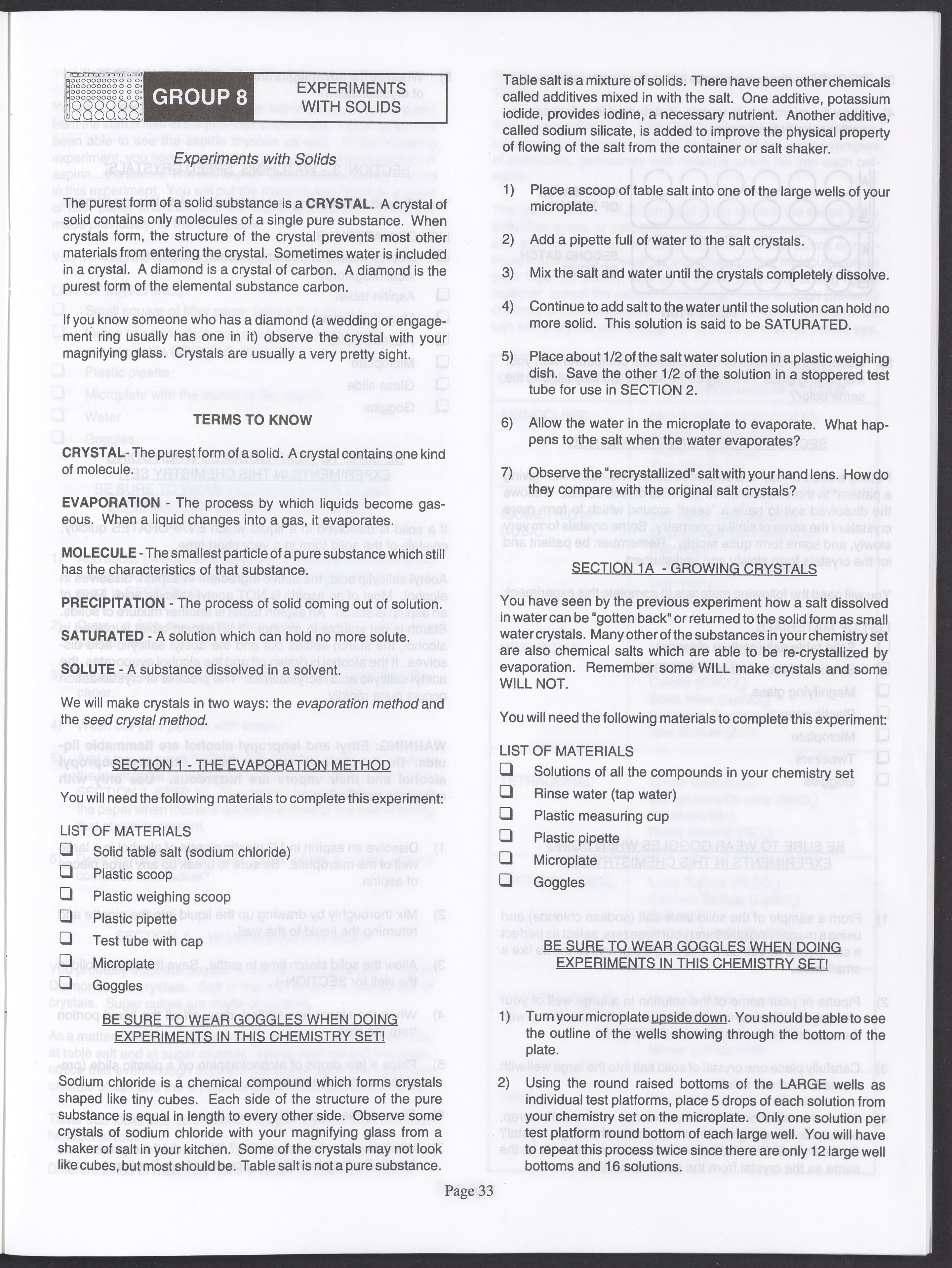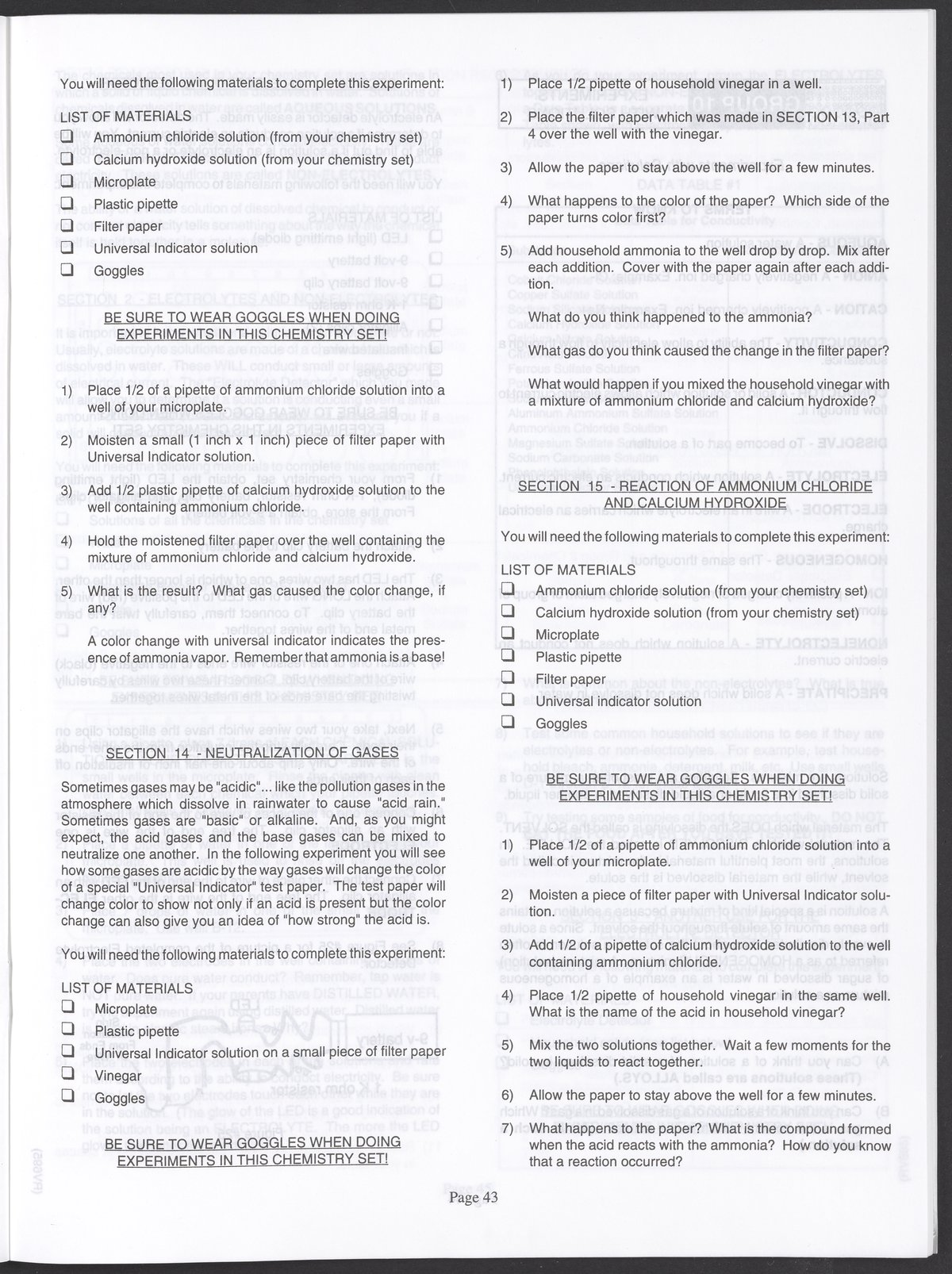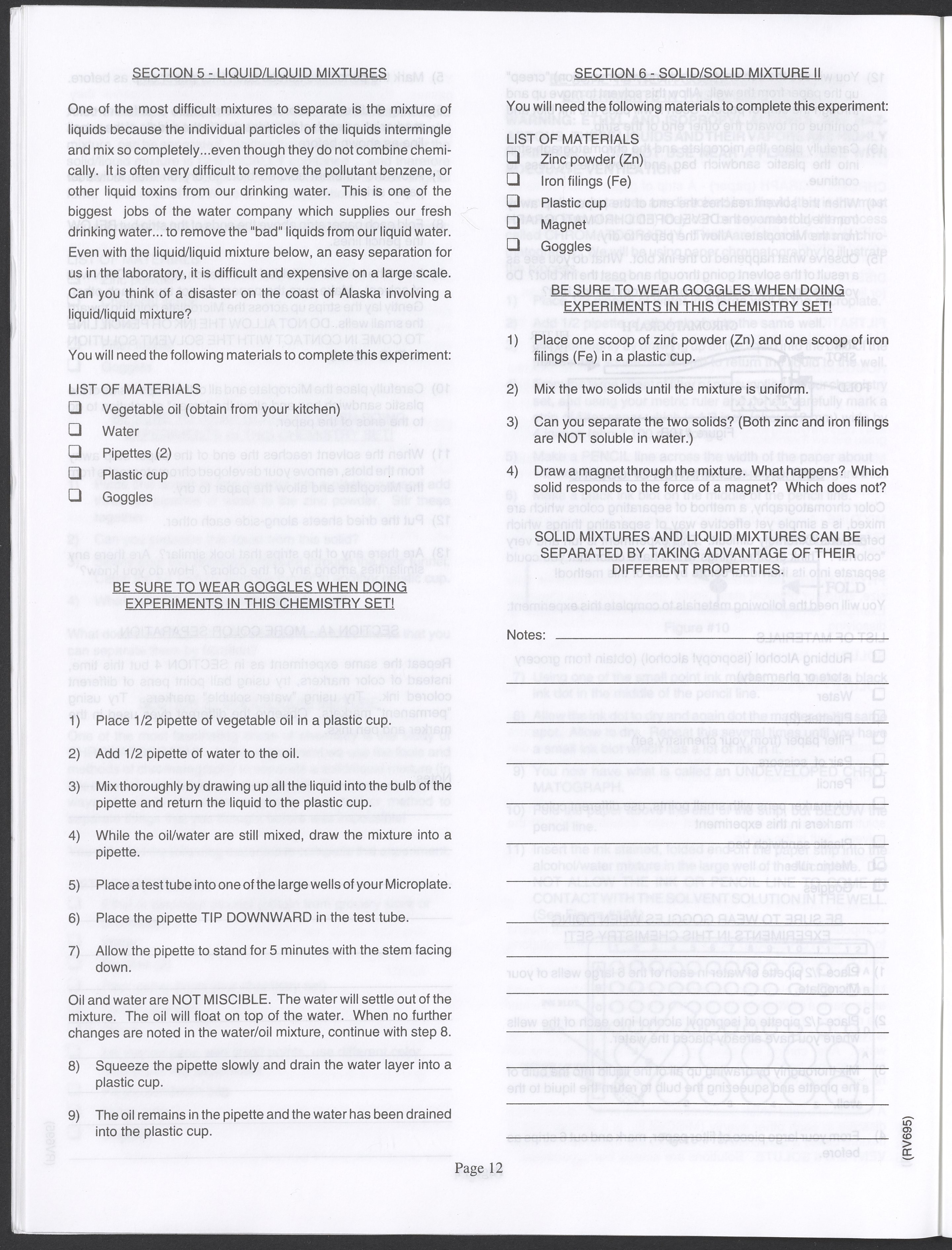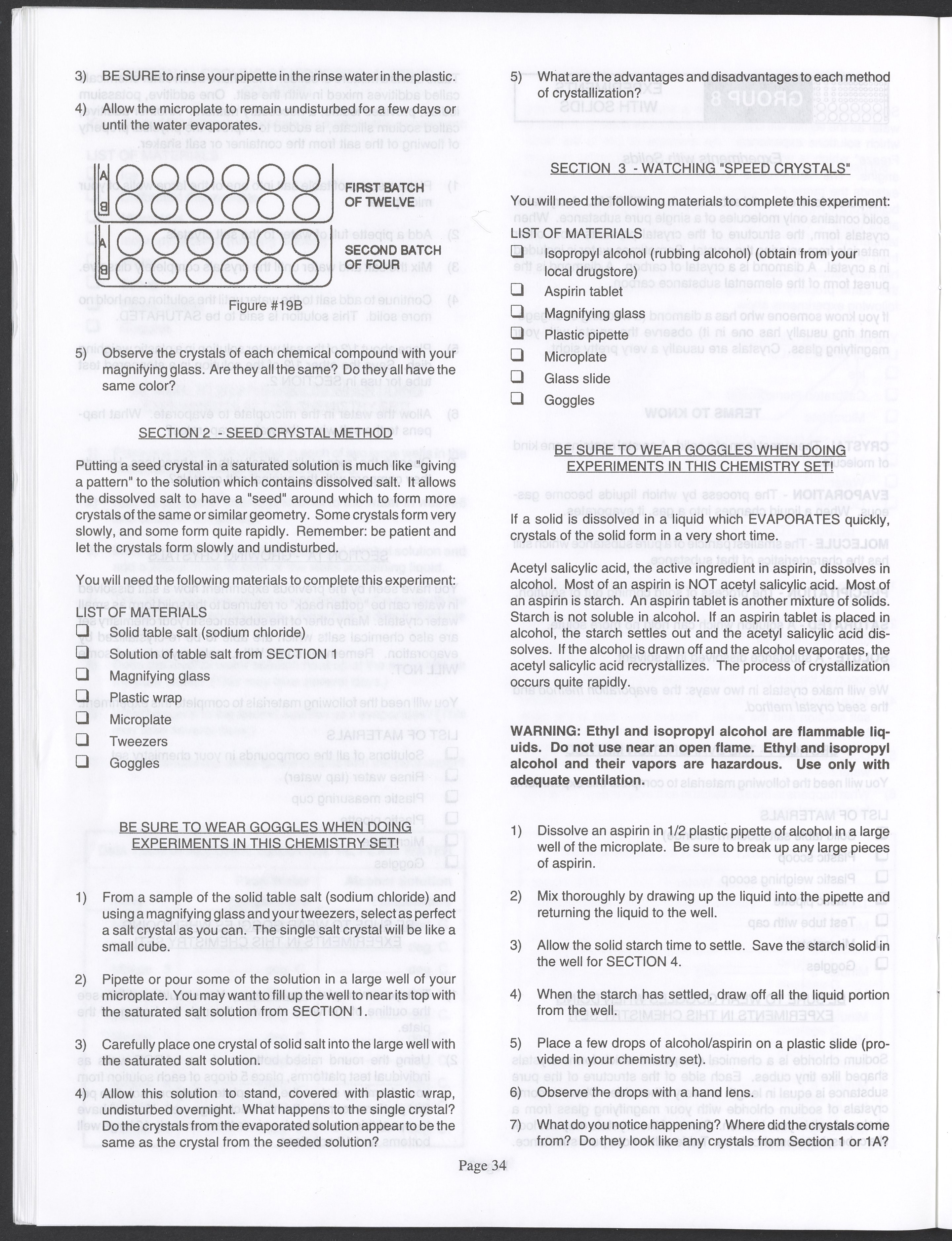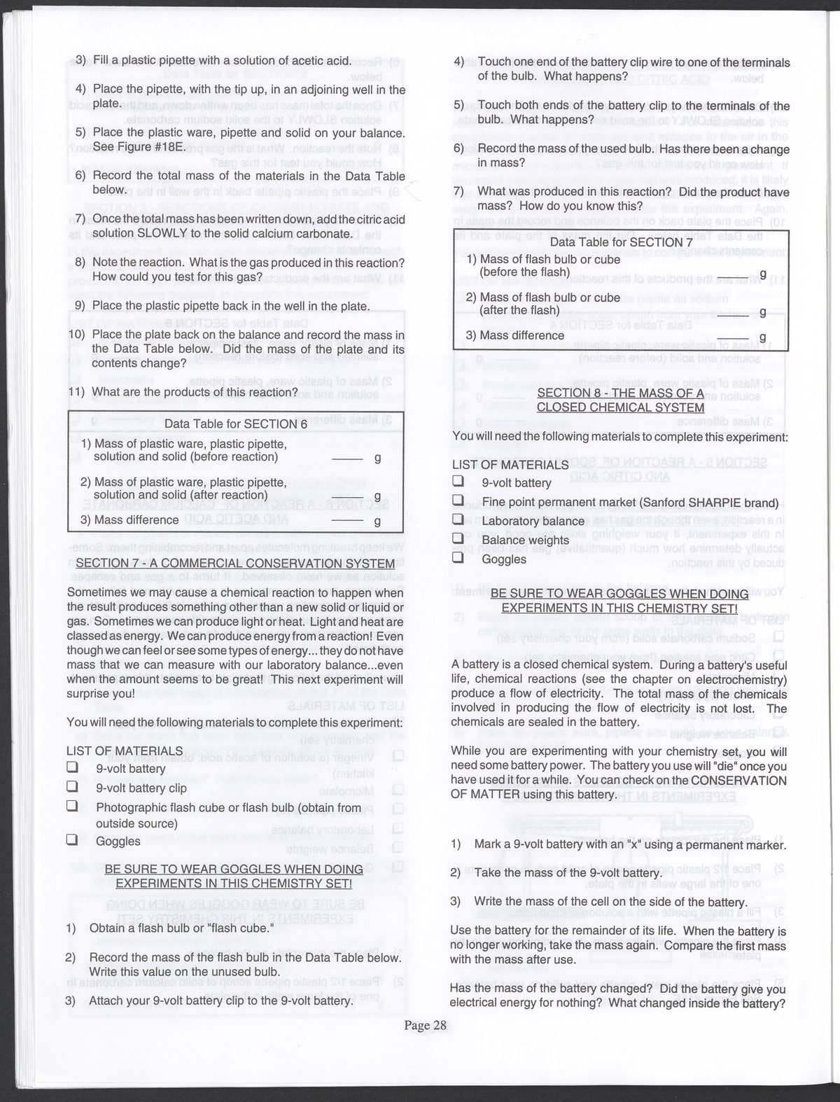 Small JPG1200 x 1571px — 264 KBLarge JPG2880 x 3771px — 1.1 MBFull-sized JPG3520 x 4609px — 1.5 MBOriginal fileTIFF — 3520 x 4609px — 46.5 MBAn instruction manual written to accompany the Smithsonian MicroChemistry XM 5000 chemistry set. Intended for use by children ages 10 and older, the manual describes how to use the set's tools, then outlines a series of experiments designed to convey the key concepts of chemical reactions, conservation of matter, phases of matter, acid-base chemistry, electrochemistry, organic chemistry, and biochemical reactions.