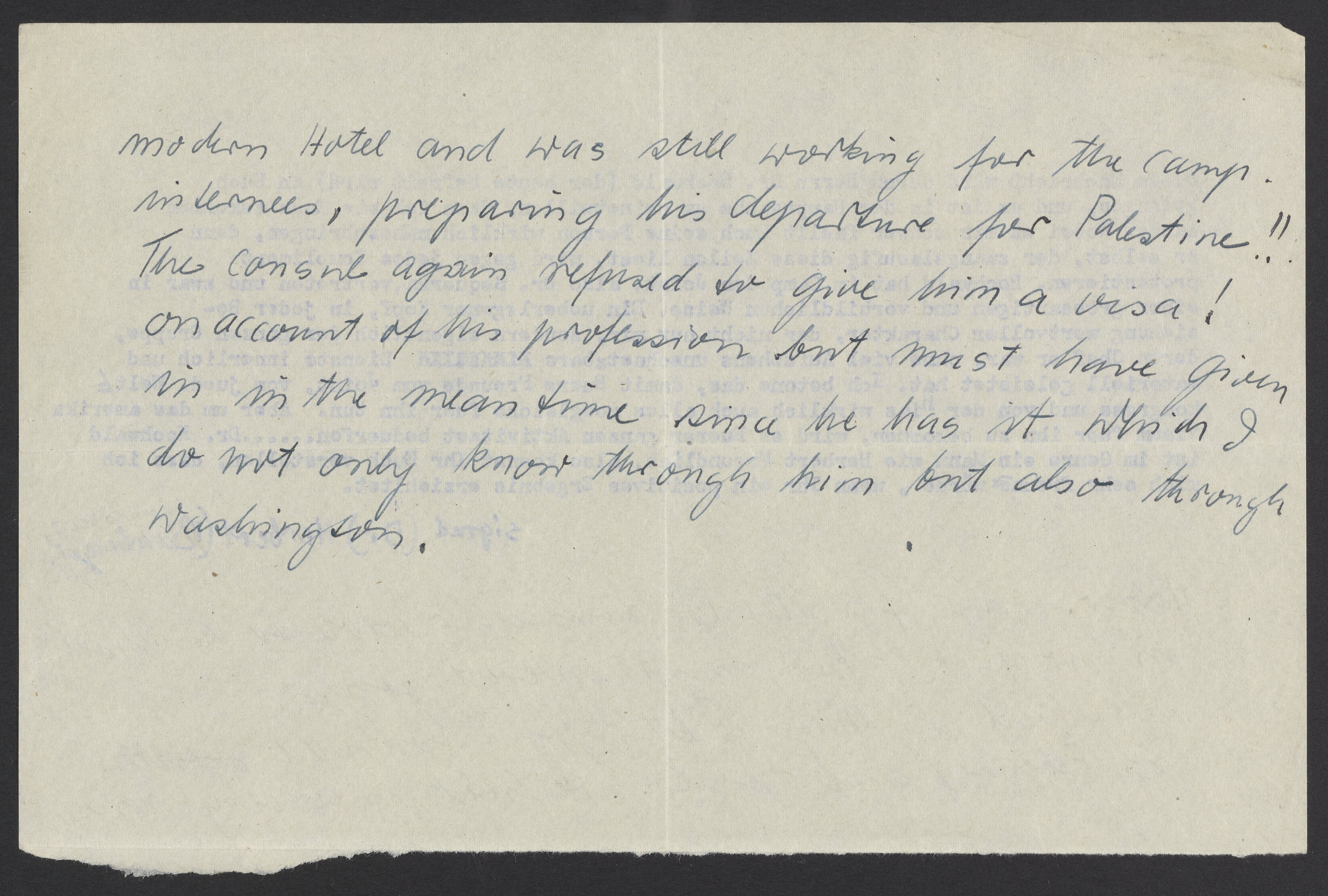 In English below the typed message is a handwritten note, possibly written by Max Bredig. The note gives more information about Hochwald trying to obtain a visa.