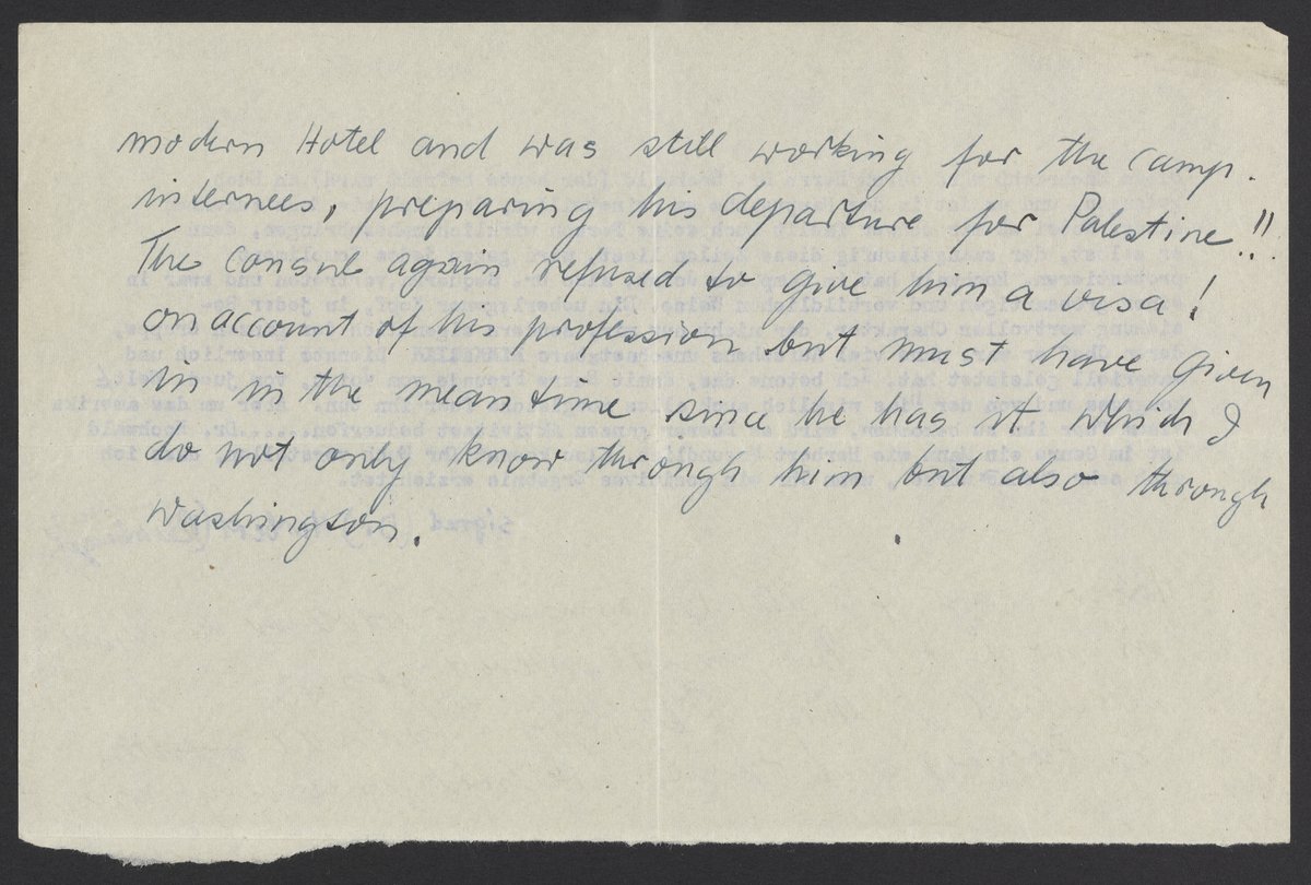 Diese Nachricht wird durch Herrn Dr. Hochwald (der heute befreit wird) an Euch gelangen, und es ist in der Hauptsache um seinetwillen, dass ich sie Euch zukommen lasse. Wobei es mir schwer faellt Euch seine Person wirklich nahezubringen, denn er selbst, der zwangslaeufig diese Zeilen liest, wird gegen jedes Kompliment protestieren. Hochwald hat im Camp den Joint, also Dr. Sequerra, vertreten und zwar in einer grossartigen und vorbildlichen Weise. Ein ueberlegener Kopf, in jeder Beziehung wertvoller Charakter, der nicht nur mir sondern eigentlich der ganzen Gruppe, deren Chef er war, ohne viel Aufsehens unschaetzbare Dienste innerlich und materiell geleistet hat. Ich betonte das, damit Euere Freunde vom Joint, vom jued. Weltkongress und von der Hias wirklich auch alles moegliche fuer ihn tun. Aber um das amerika Visum fuer ihn zu bekommen, wird es Euerer ganzen Aktivitaet beduerfen…Dr. Hochwald ist im Genre ein Mann wie Herbert Freundlich, also koennte Ihr Euch vorstellen, dass ich mich sehr freuen würde, wenn Ihr ein positives Ergebnis erziehltet.