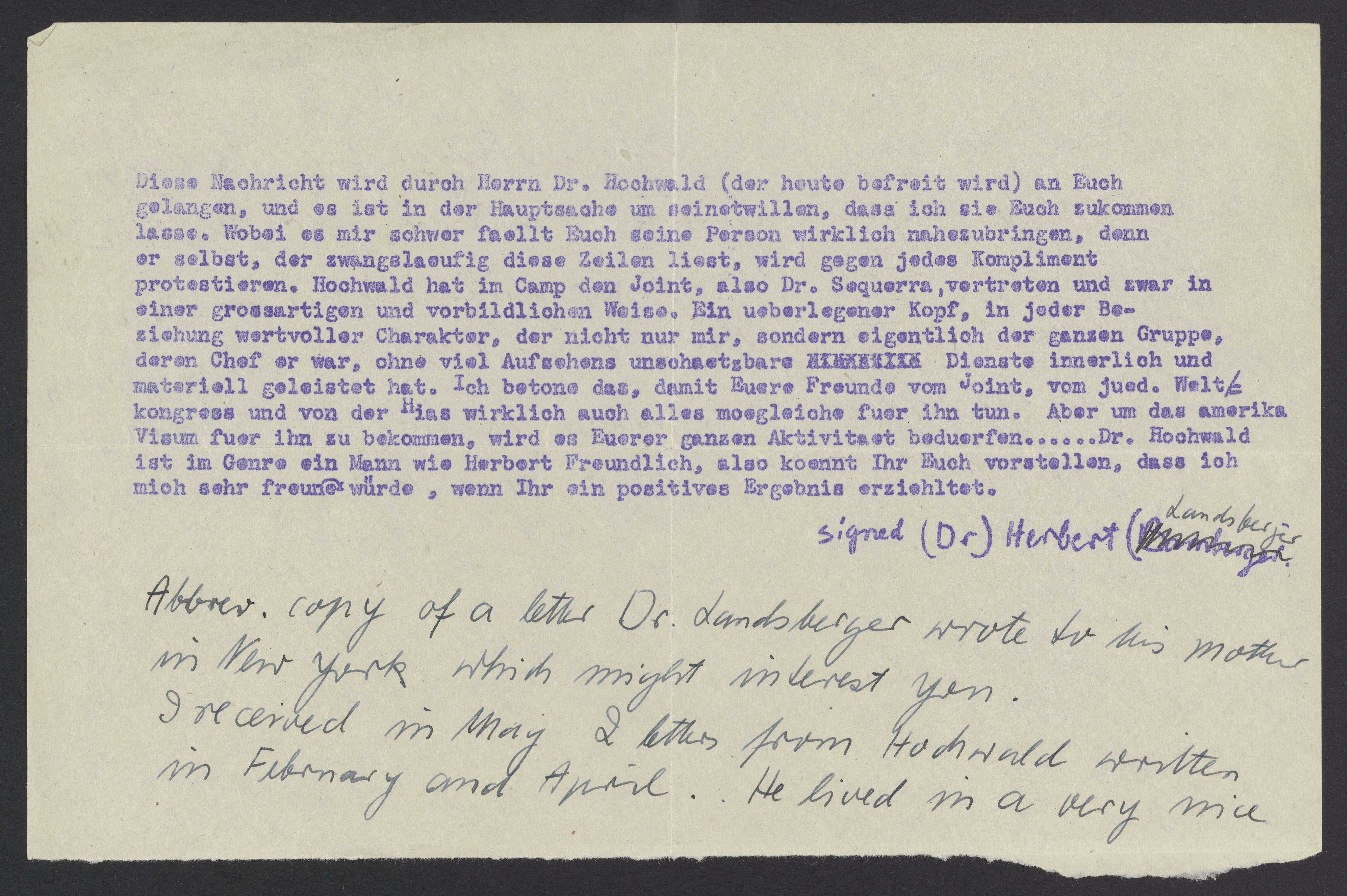 This message will reach you through Dr. Hochwald (who will be liberated today). It is mainly for his sake that I am sending it to you. It is difficult for me to really describe his personality to you because he, who will inevitably read these lines, will object to any compliment. Like Dr. Sequerra, Hochwald represented Joint in the camp in an admirable and exemplary way. In every respect, he is an outstanding leader of upmost integrity. He rendered invaluable personal and material services not only to me, but the entire group, which he led, without complaining. I emphasized this so that your friends at Joint, the Jewish World Congress, and Hias really do as much as possible for him. To obtain an American visa for him, it will require all your efforts. Dr. Hochwald is like Herbert Freundlich. You can imagine that I would be very pleased if you achieve a successful outcome.