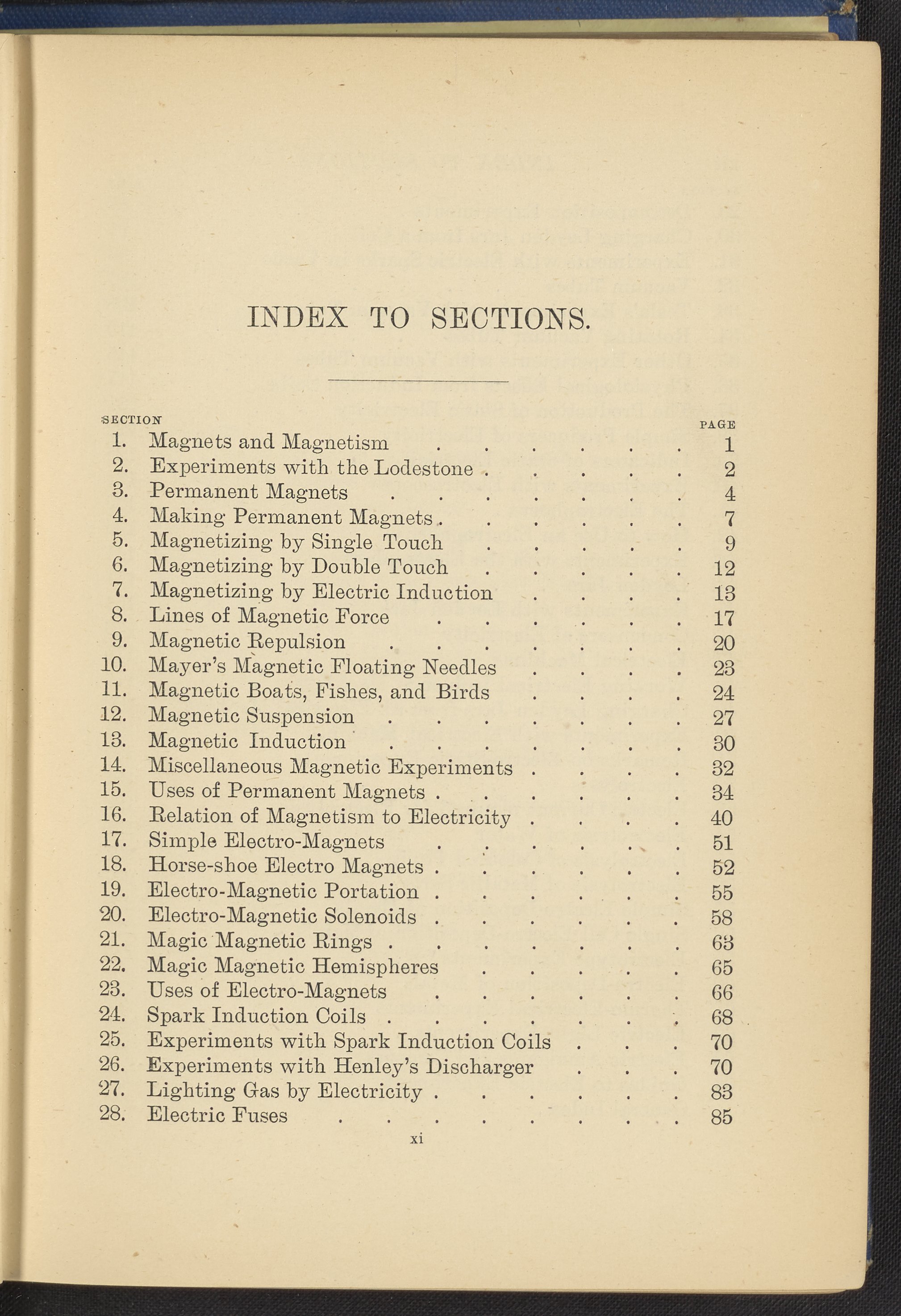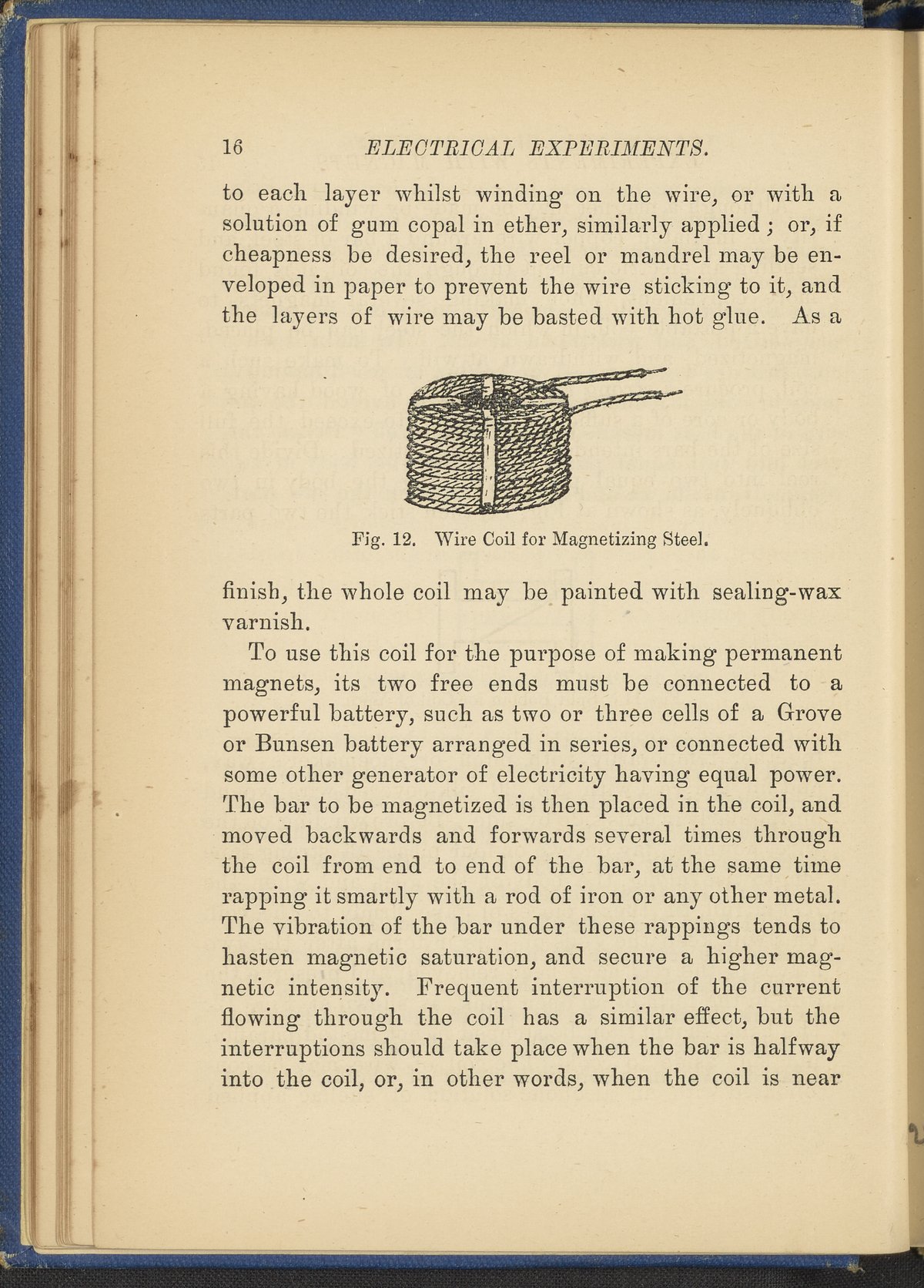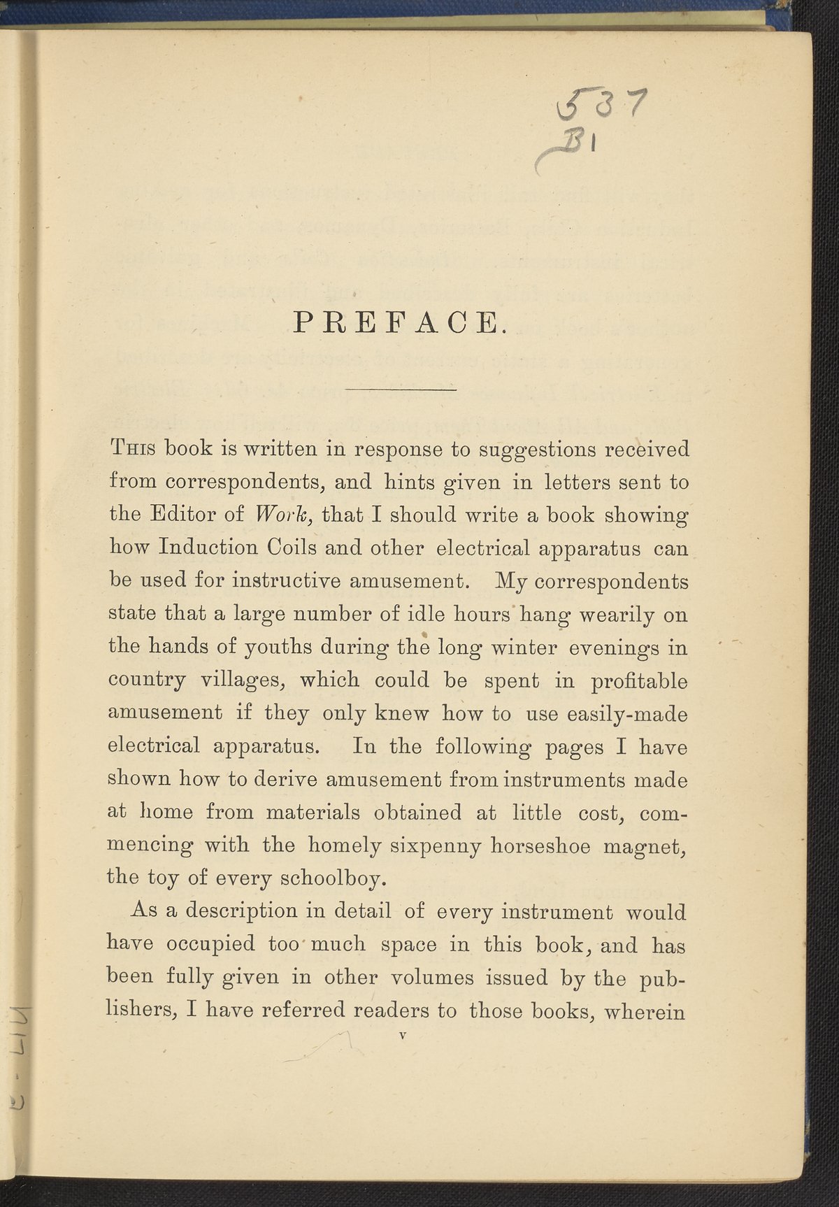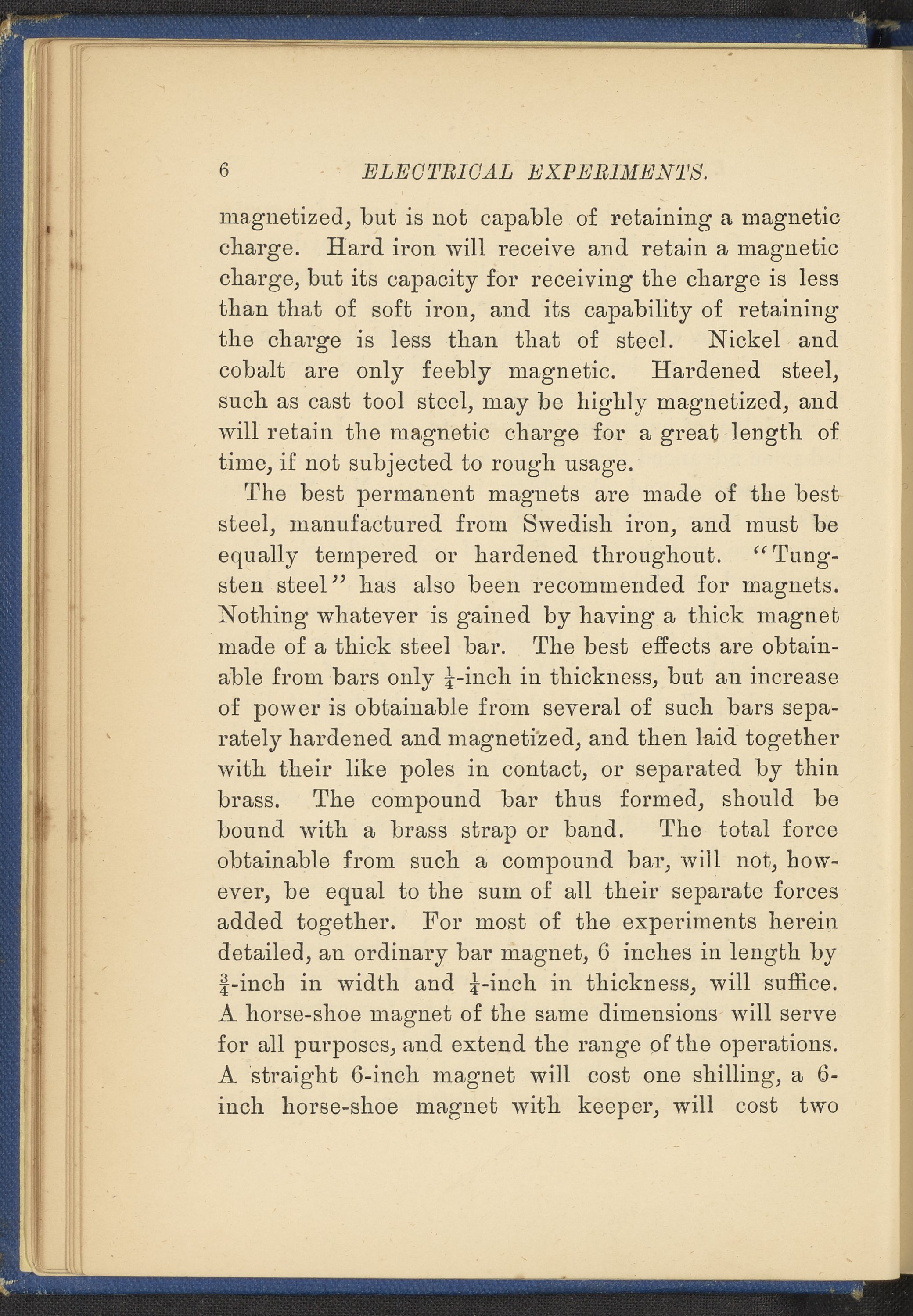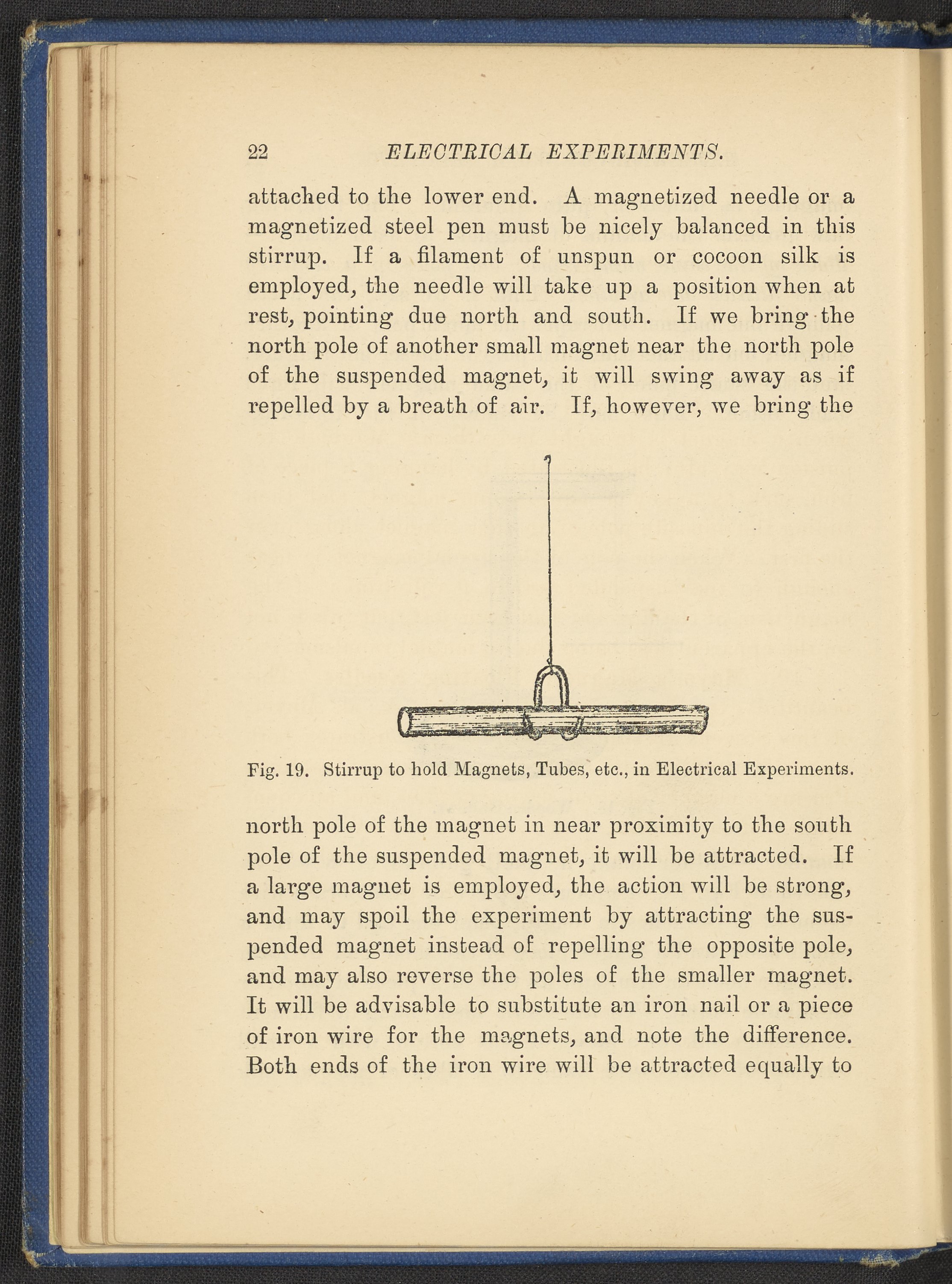 Small JPG1200 x 1571px — 494 KBFull-sized JPG2284 x 2991px — 1.5 MBOriginal fileTIFF — 2284 x 2991px — 19.6 MBWritten to show how electrical apparatus can be assembled at little cost for engaging instruction of scientifically-curious youth, this work includes descriptions of simple experiments that demonstrate elementary concepts of magnetism and electricity. Work is thoroughly illustrated and digitized in its entirety.