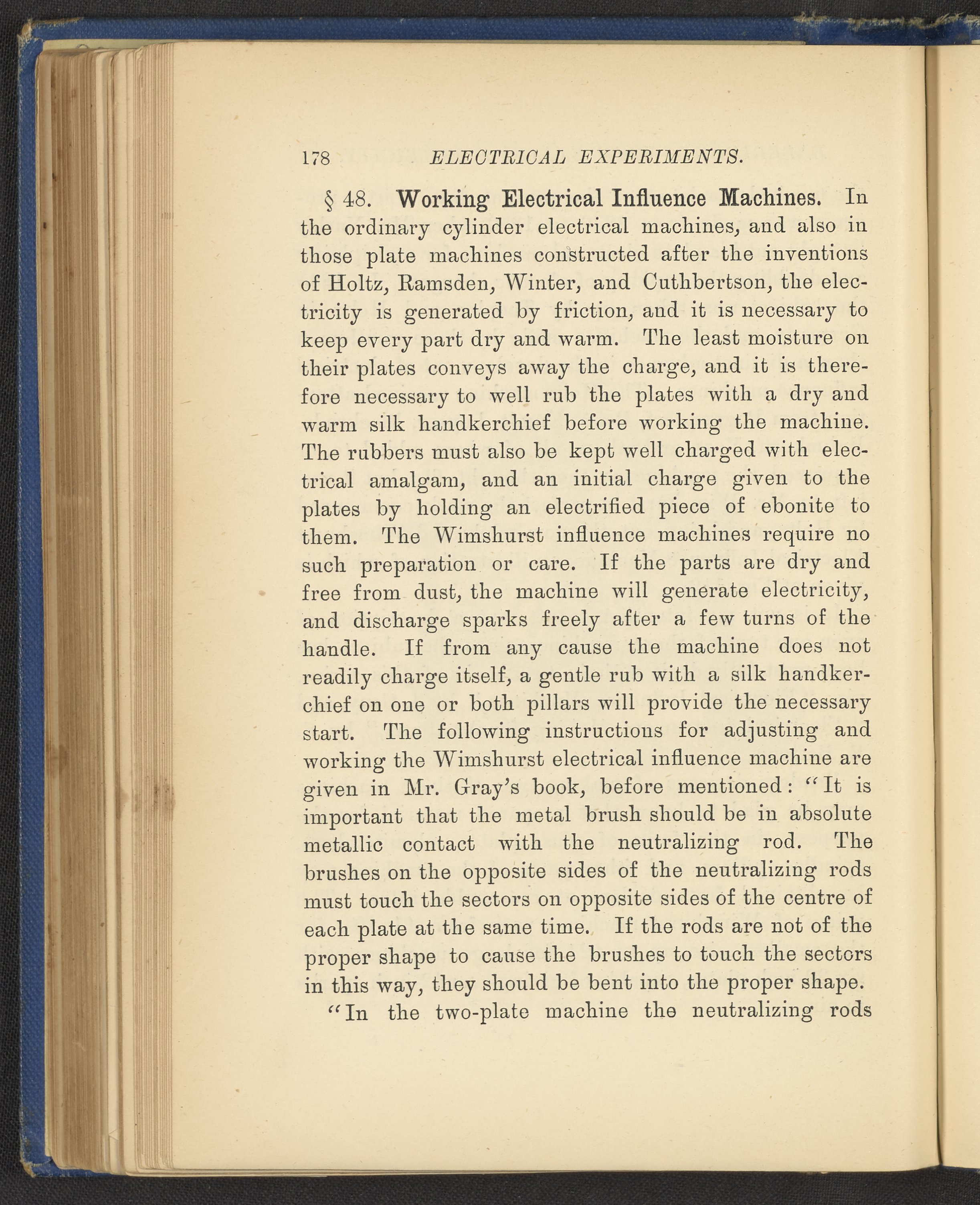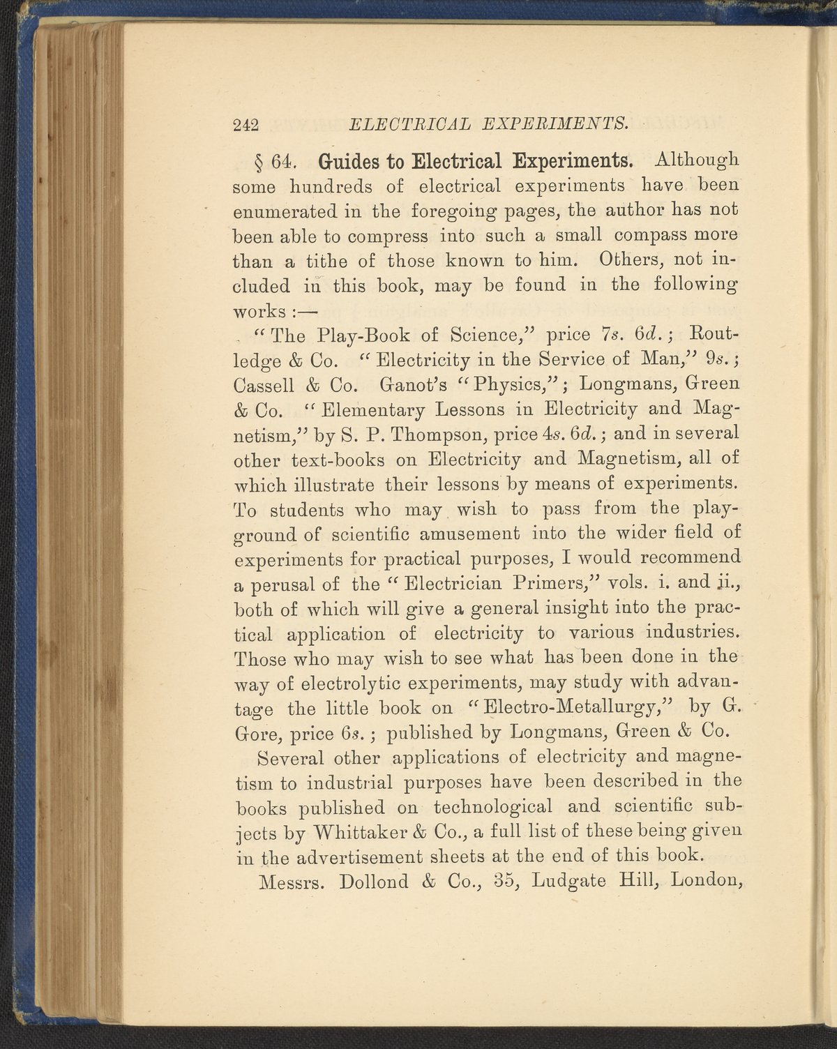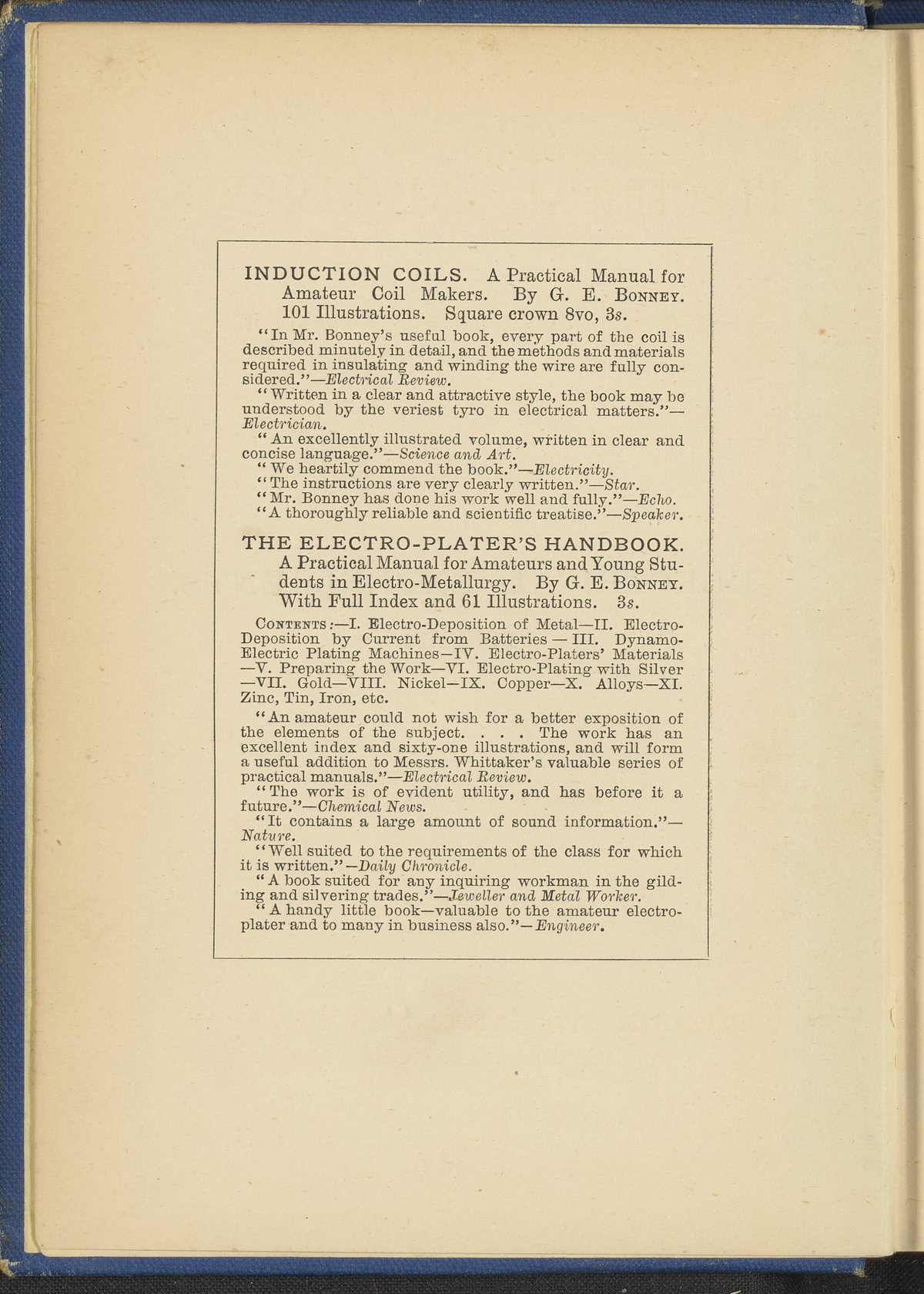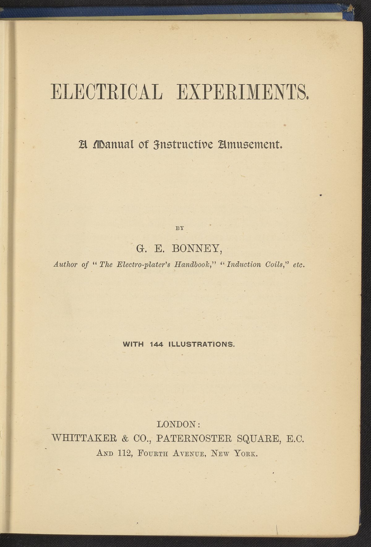 Bonney, G. E. “Electrical Experiments: A Manual of Instructive Amusement.” London, England: Whittaker & Co., 1891. QC533 .B66. Science History Institute. Philadelphia. https://digital.sciencehistory.org/works/ssax7fn.