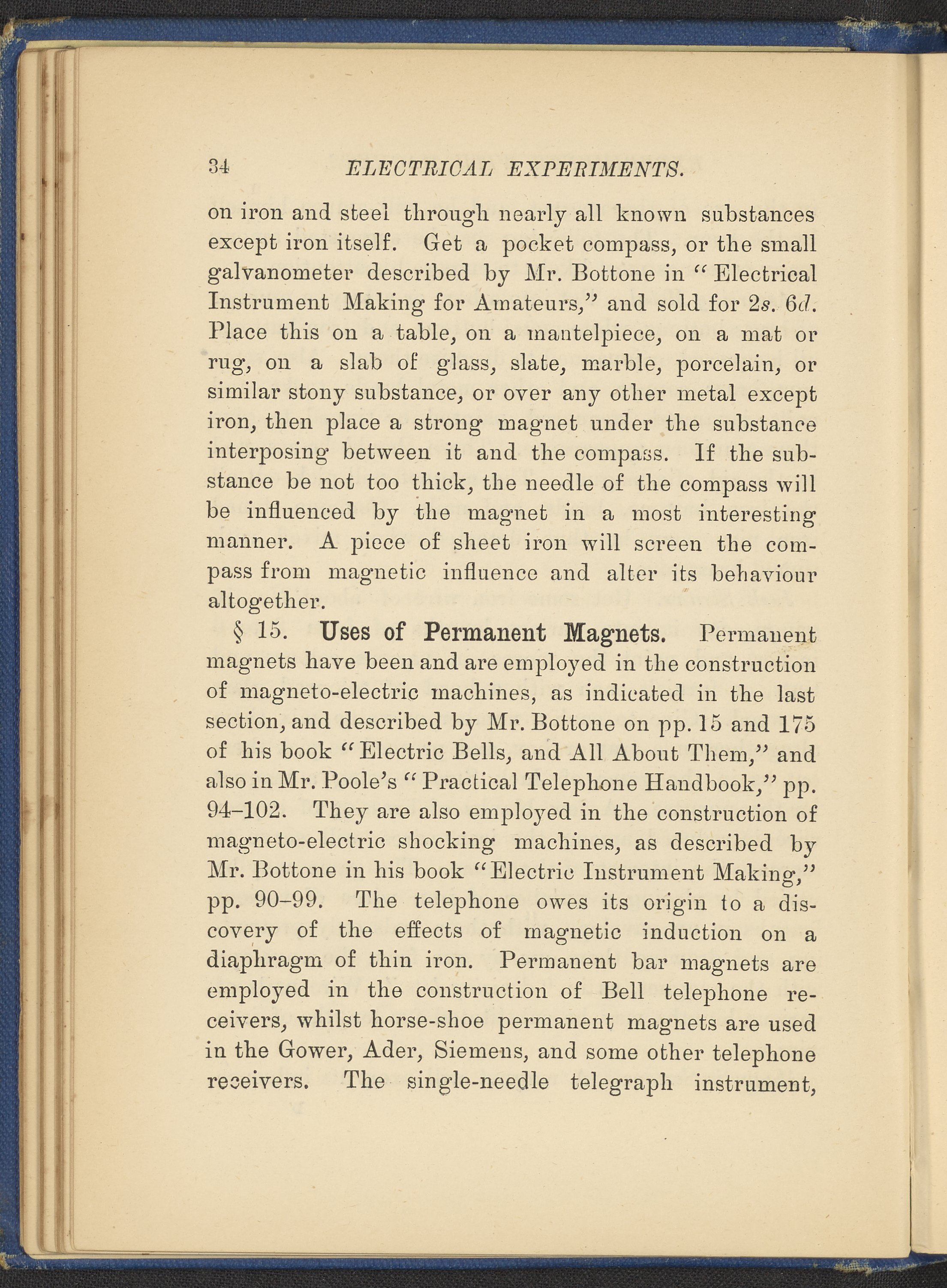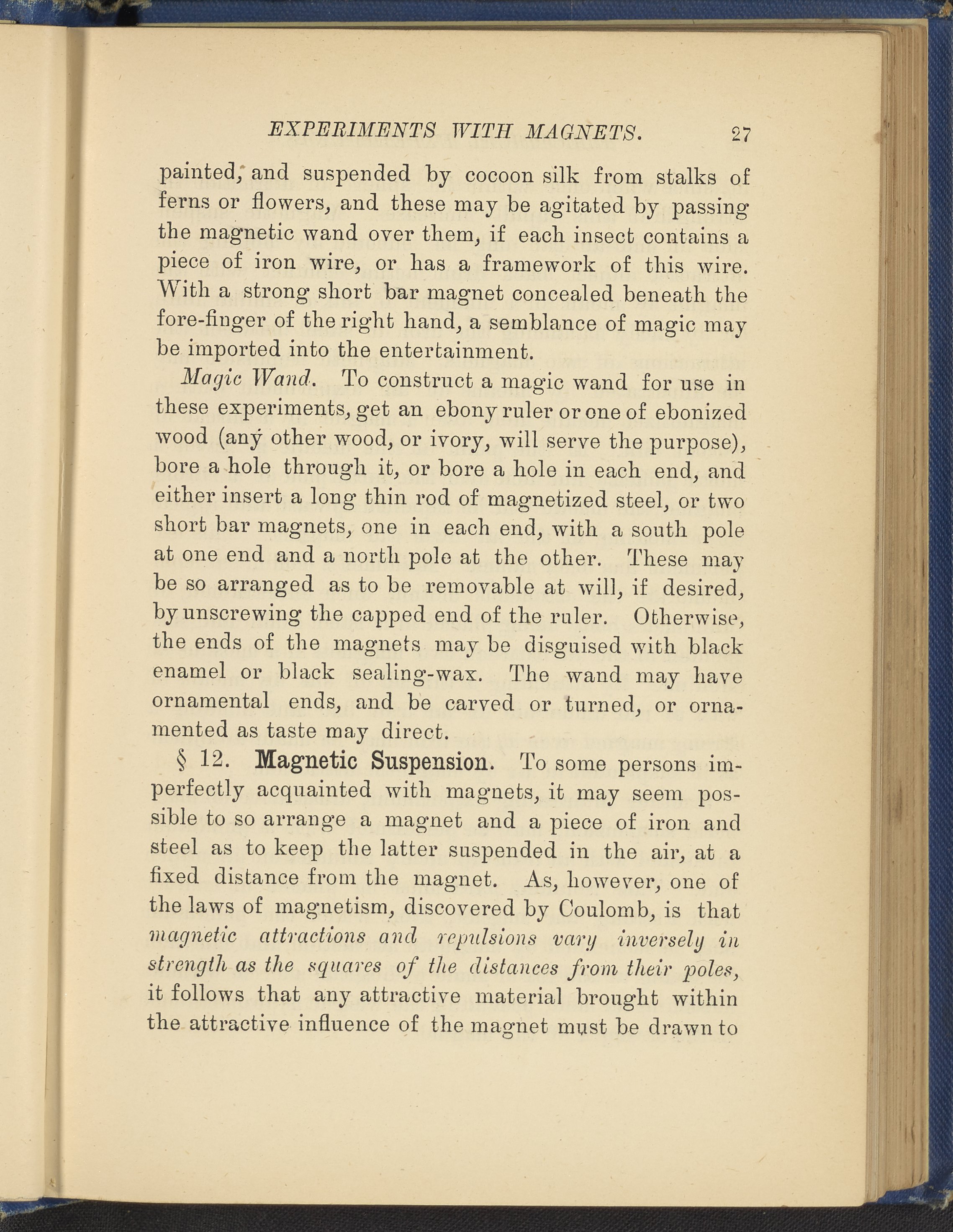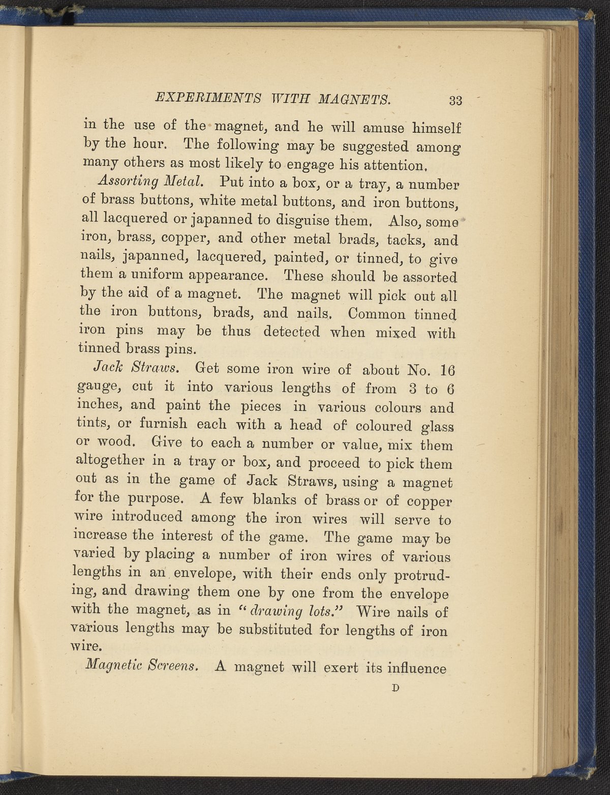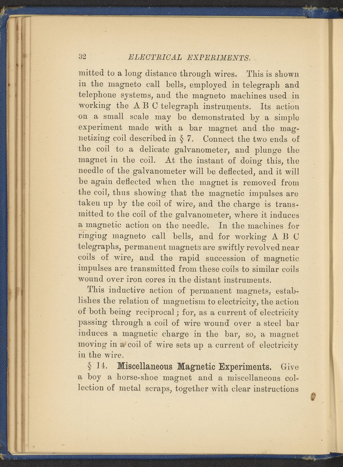 Small JPG1200 x 1571px — 494 KBFull-sized JPG2284 x 2991px — 1.5 MBOriginal fileTIFF — 2284 x 2991px — 19.6 MBWritten to show how electrical apparatus can be assembled at little cost for engaging instruction of scientifically-curious youth, this work includes descriptions of simple experiments that demonstrate elementary concepts of magnetism and electricity. Work is thoroughly illustrated and digitized in its entirety.