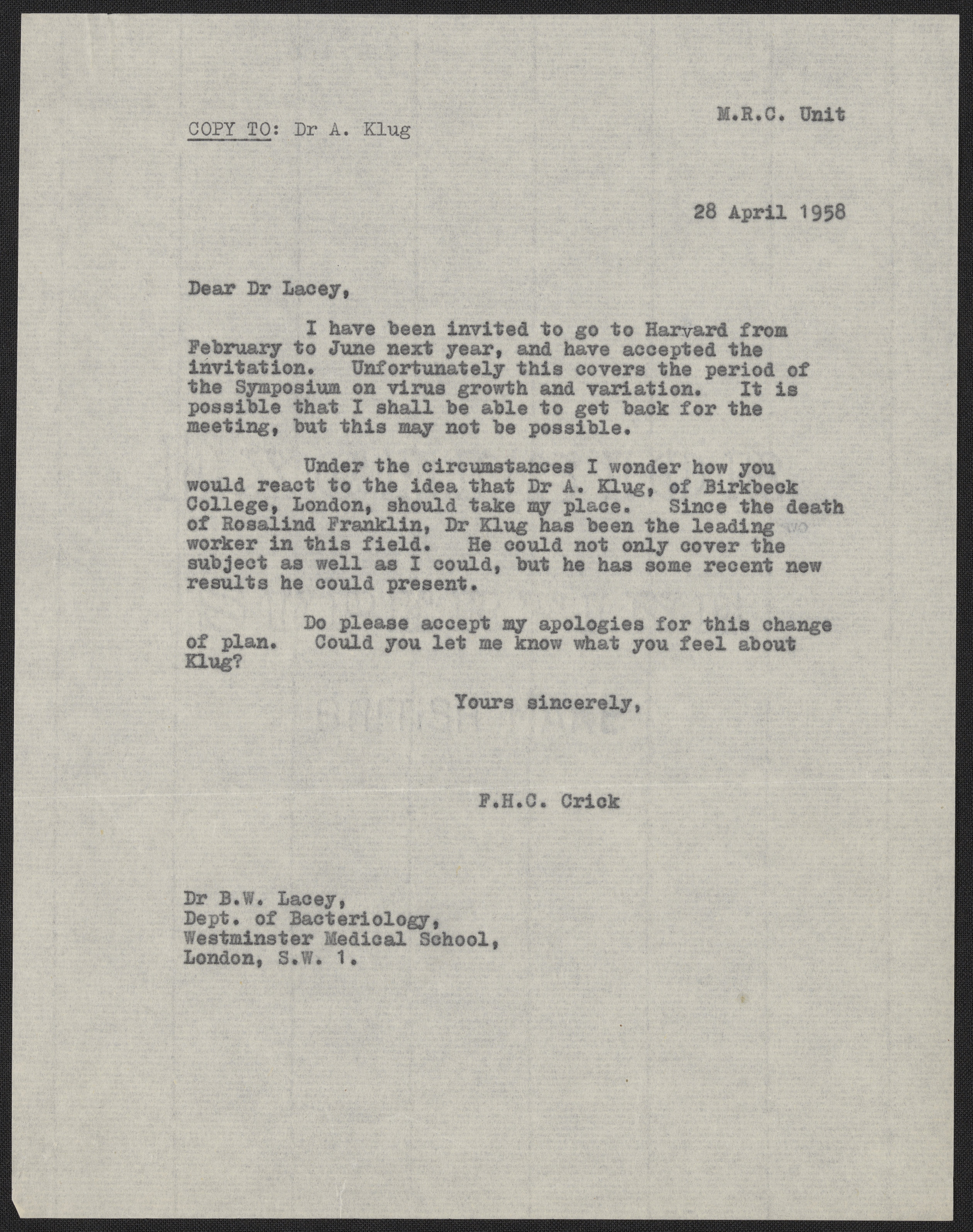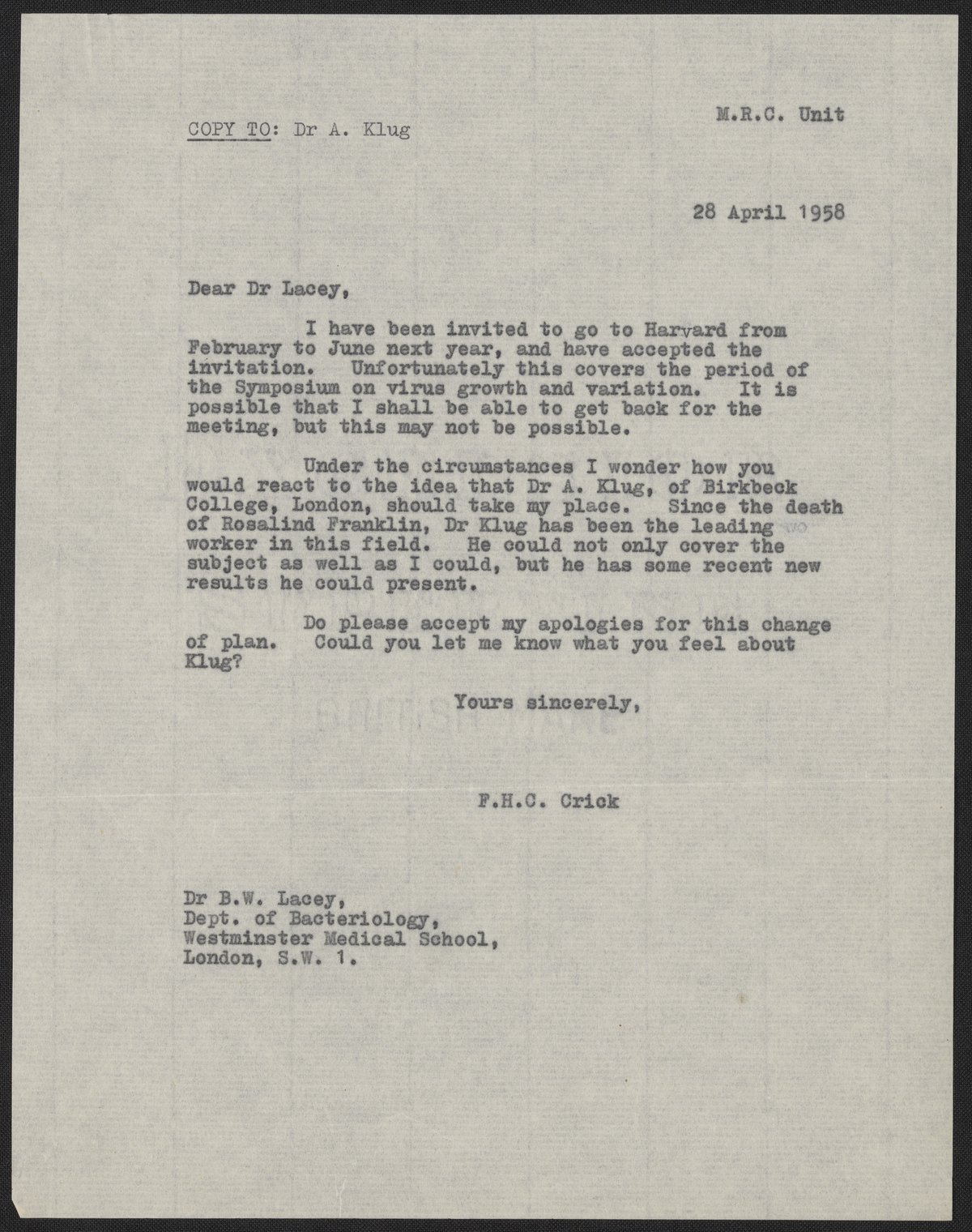 Letter from Francis Crick to Brian Westgarth Lacey, April 28, 1958
