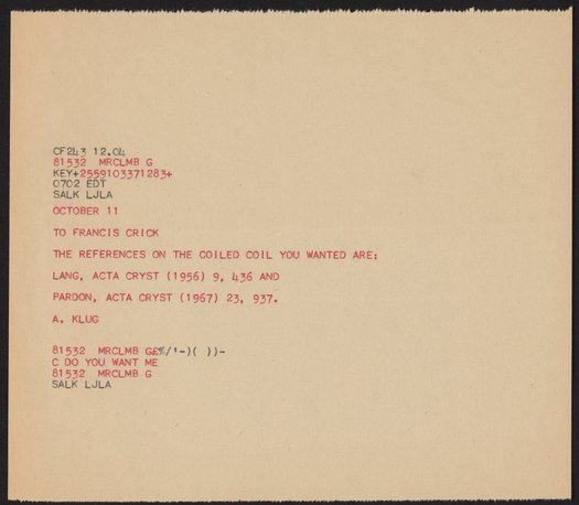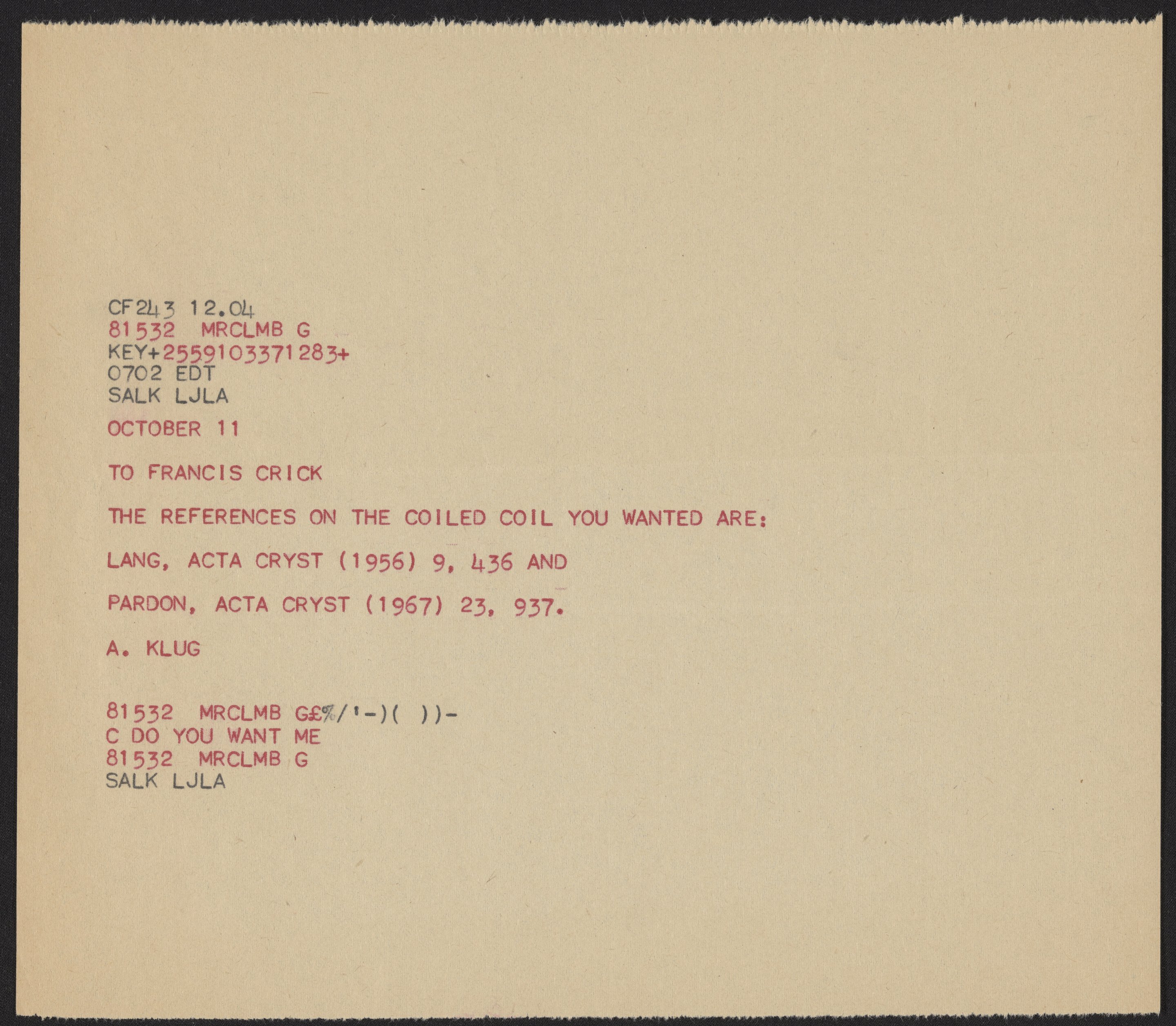 Klug, A. (Aaron), Sir. “Telex from Aaron Klug to Francis Crick, October 11, 1978,” October 11, 1978. History of Molecular Biology Collection, Box 20, Folder 2. Science History Institute. Philadelphia. https://digital.sciencehistory.org/works/st6kzwt.