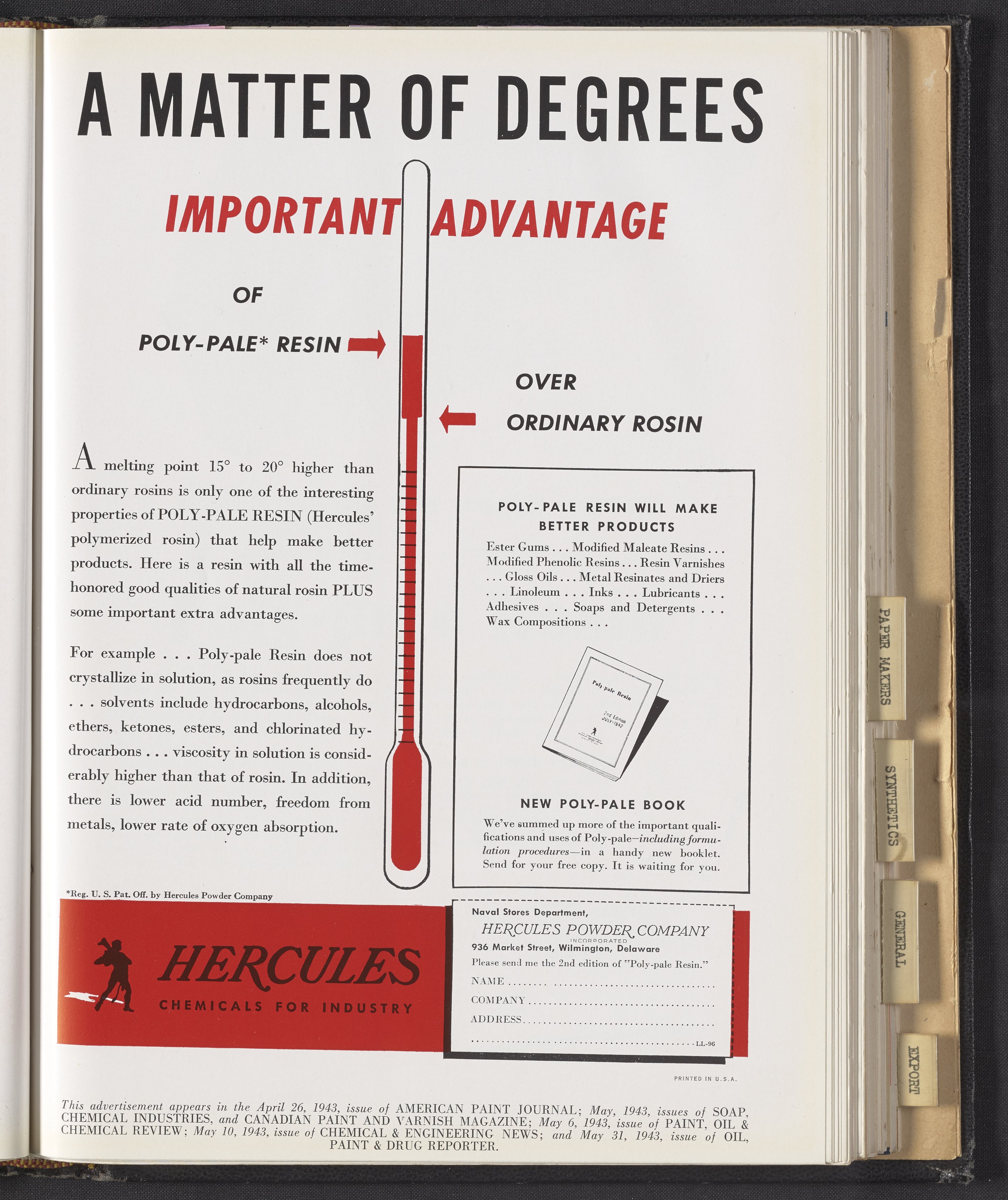 Hercules Incorporated. “A Matter of Degrees: Important Advantage of Poly-Pale Resin Over Ordinary Rosin.” 1943 Hercules Advertisements, 1943. Records of Hercules Incorporated, Volume 1943. Science History Institute. Philadelphia. https://digital.sciencehistory.org/works/st74cr15s.