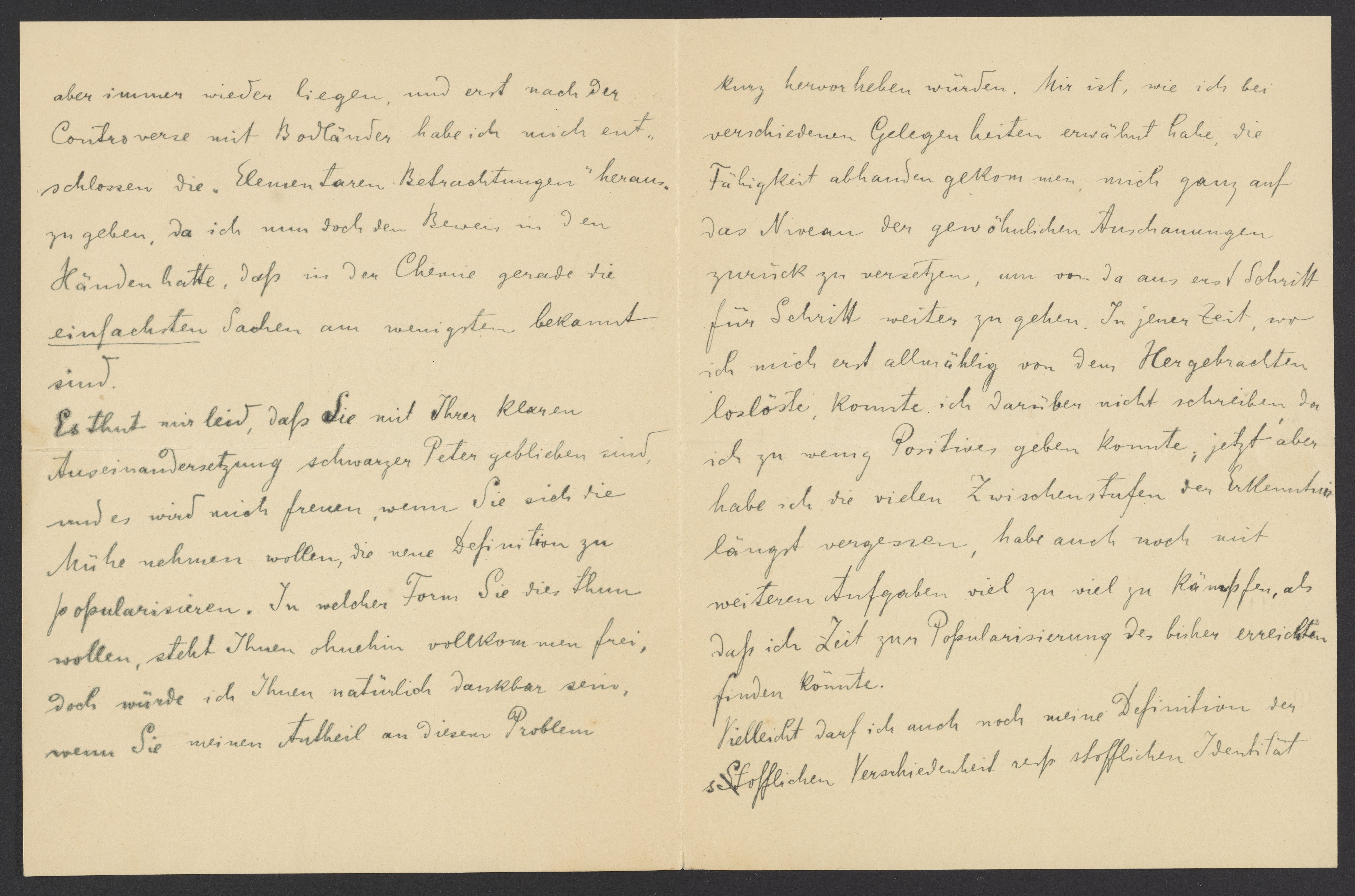 aber immer wieder liegen, und erst nach der Controverse mit Bodländer habe ich mich entschlossen die „Elemtaren Betrachtungen“ herauszugeben, da ich nun doch den Beweis in den Händen hatte, daß in der Chemie gerade die einfachsten Sachen am wenigsten bekannt sind.